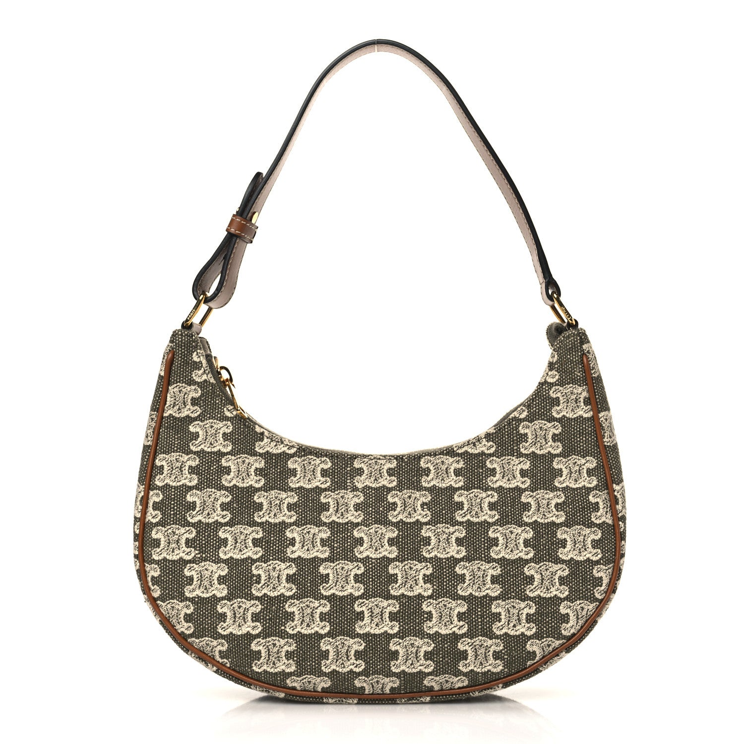This is an authentic CELINE Canvas Calfskin Ava Triomphe Shoulder Bag Green. This chic bag is crafted of green canvas with brown leather trim. The bag features a leather strap handle with gold hardware. The top zipper opens to a beige fabric interior with a patch pocket.Follow this item for alerts. Celine is a registered trademark of Celine. FASHIONPHILE is not affiliated with Celine.