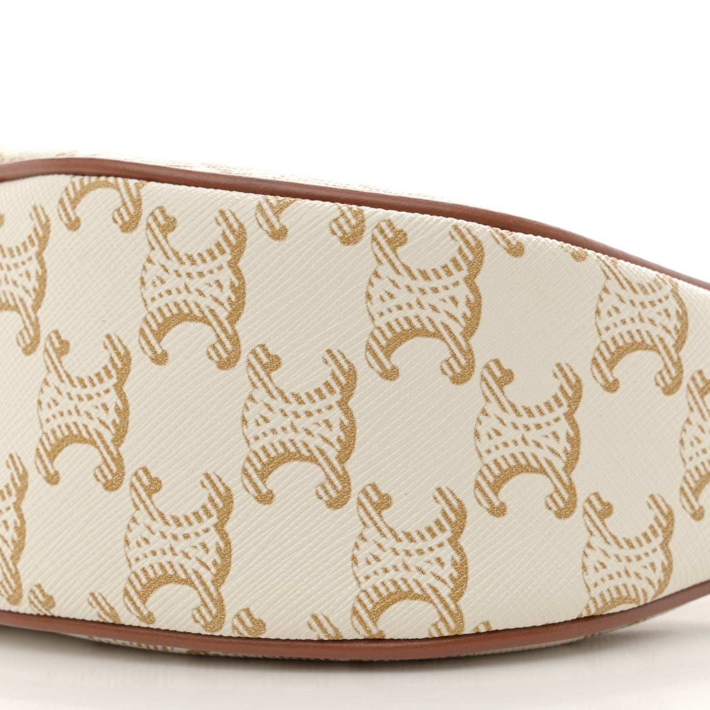 This is an authentic CELINE Canvas Calfskin Ava Triomphe Shoulder Bag in White. This chic bag is crafted of fine monogram coated canvas in white with brown leather trim. The bag features an adjustable leather strap with gold hardware. The top zipper opens to a brown fabric interior with a patch pocket.Follow this item for alerts. Celine is a registered trademark of Celine. FASHIONPHILE is not affiliated with Celine.