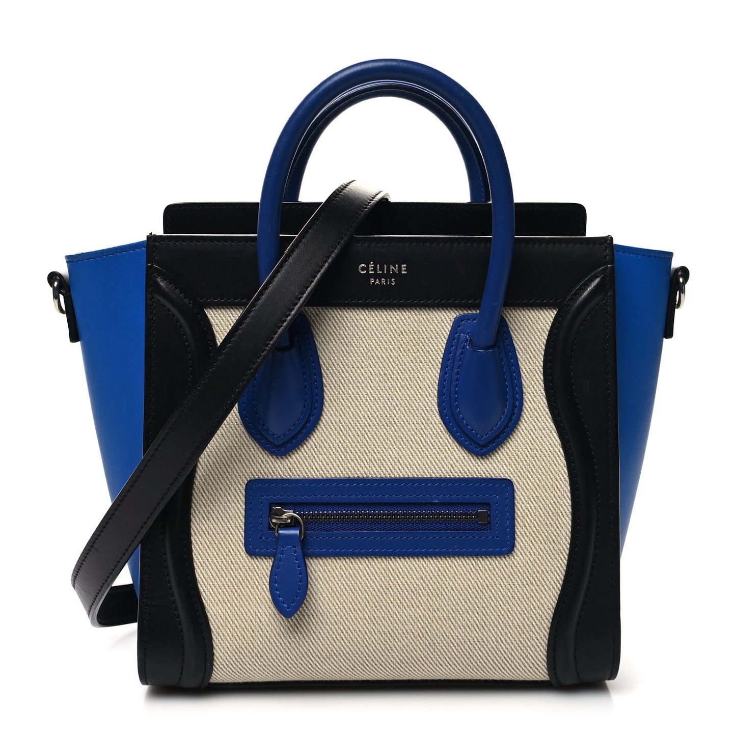 This is an authentic CELINE Canvas Smooth Calfskin Nano Tri-Color Luggage in Natural and Blue. This bag is crafted of beige fabric and black and blue calfskin leather. The bag features sturdy rolled leather top handles and an optional shoulder strap in black. The top zips open to a black leather interior with a pocket.Follow this item for alerts. Celine is a registered trademark of Celine. FASHIONPHILE is not affiliated with Celine.