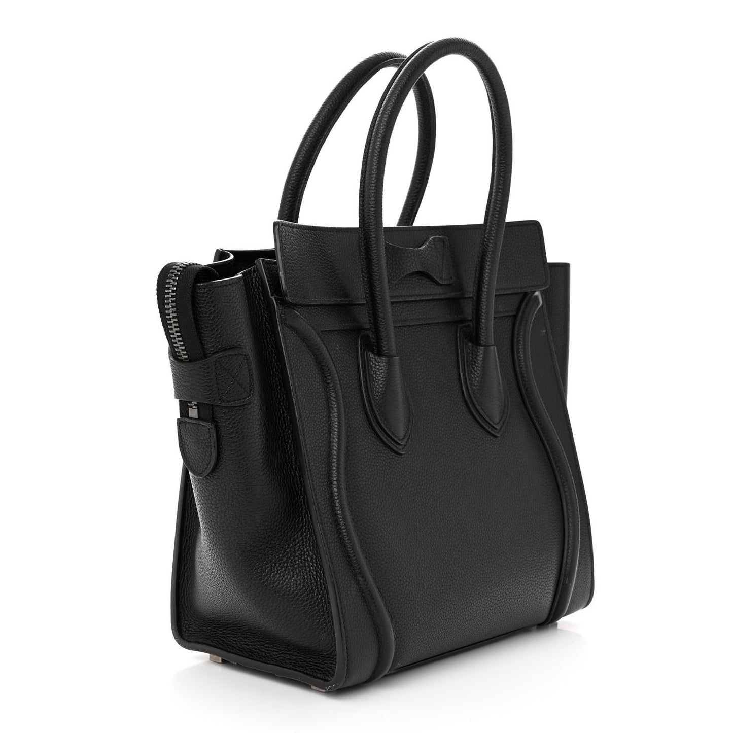 This is an authentic CELINE Drummed Calfskin Micro Luggage in Black. This stylish tote is crafted of grained calfskin leather in black. This bag features rolled leather top handles, a zippered top and a black suede interior with zipper and patch pockets.Follow this item for alerts. Celine is a registered trademark of Celine. FASHIONPHILE is not affiliated with Celine.