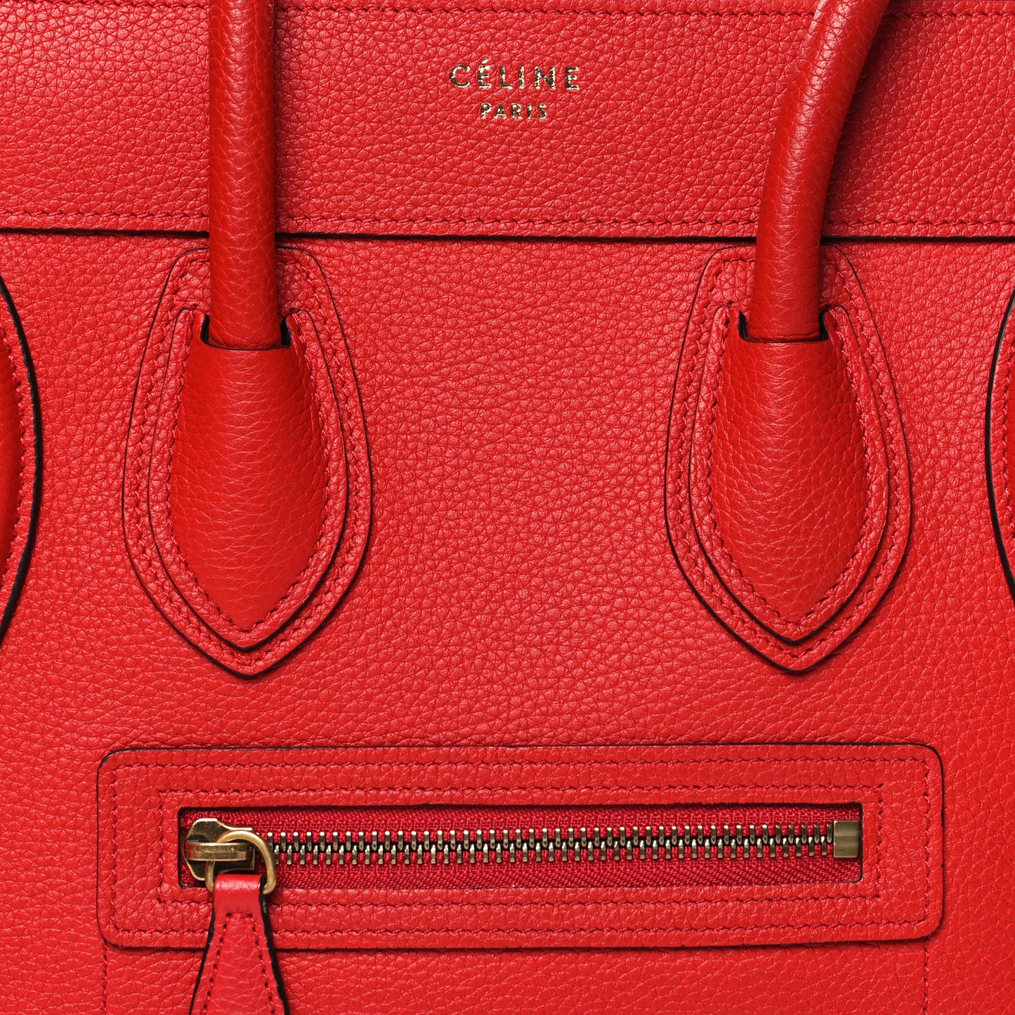 This is an authentic CELINE Drummed Calfskin Micro Luggage in Red. This tote is crafted of grained calfskin leather in red, rolled red leather top handles and aged gold hardware. The top zipper opens to a red suede interior with a zipper pocket and patch pockets.Follow this item for alerts. Celine is a registered trademark of Celine. FASHIONPHILE is not affiliated with Celine.
