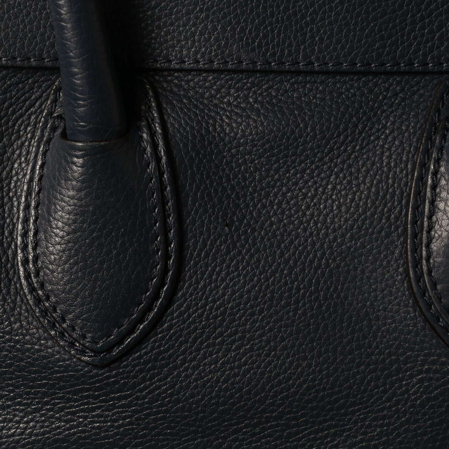 This is an authentic CELINE Drummed Calfskin Mini Luggage in Blue. This stylish tote is crafted of soft, heavily grained calfskin leather in blue. This bag features rolled leather top handles, decorative leather scroll detailing, and an exterior zipper pocket. The top unzips to a blue suede interior with zipper and patch pockets.Follow this item for alerts. Celine is a registered trademark of Celine. FASHIONPHILE is not affiliated with Celine.