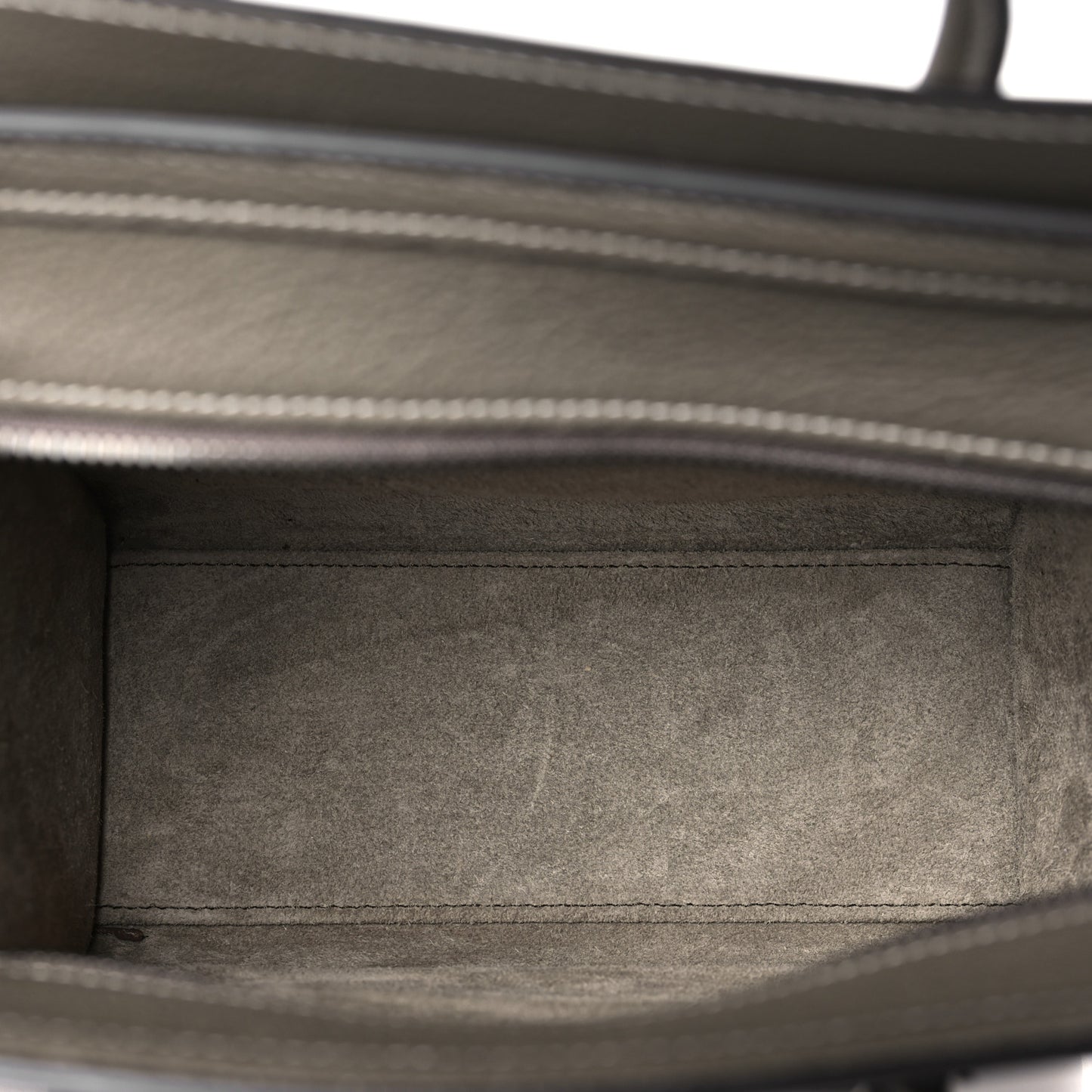This is an authentic CELINE Drummed Calfskin Nano Luggage in Souris. This stylish small tote is crafted of soft, heavily grained calfskin leather in a gray with contrast white stitching. This bag features rolled leather top handles, an optional shoulder strap with aged silver clasps, decorative leather detailing, and an exterior zipper pocket. The top unzips to a matching suede interior with a patch pocket.Follow this item for alerts. Celine is a registered trademark of Celine. FASHIONPHILE is not affiliated with Celine.