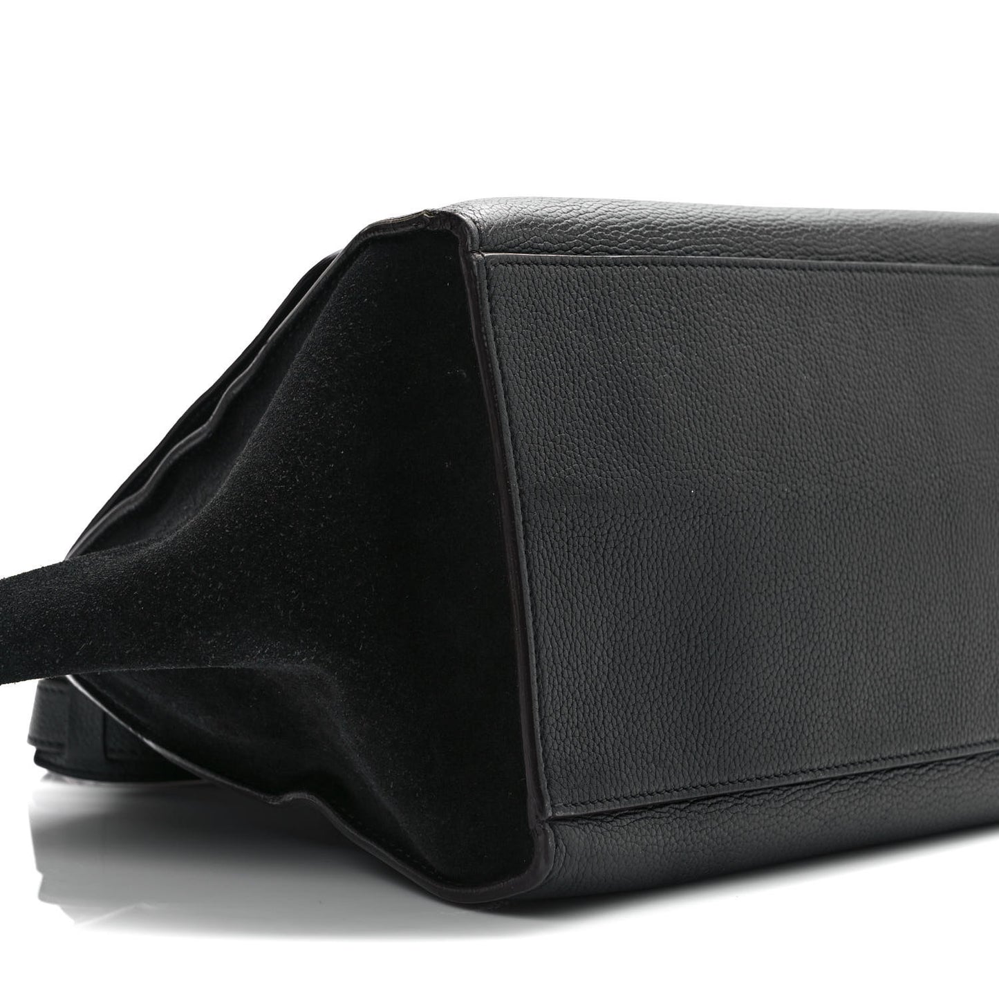 This is an authentic CELINE Drummed Calfskin Suede Medium Trapeze in Black. This stunning tote is composed of rich calfskin leather and suede leather in black. This bag features a rolled leather handle, an optional shoulder strap, suede expandable sides, and a front flap with a silver flip-lock. The front flap opens to a spacious black leather interior with patch pockets.Follow this item for alerts. Celine is a registered trademark of Celine. FASHIONPHILE is not affiliated with Celine.