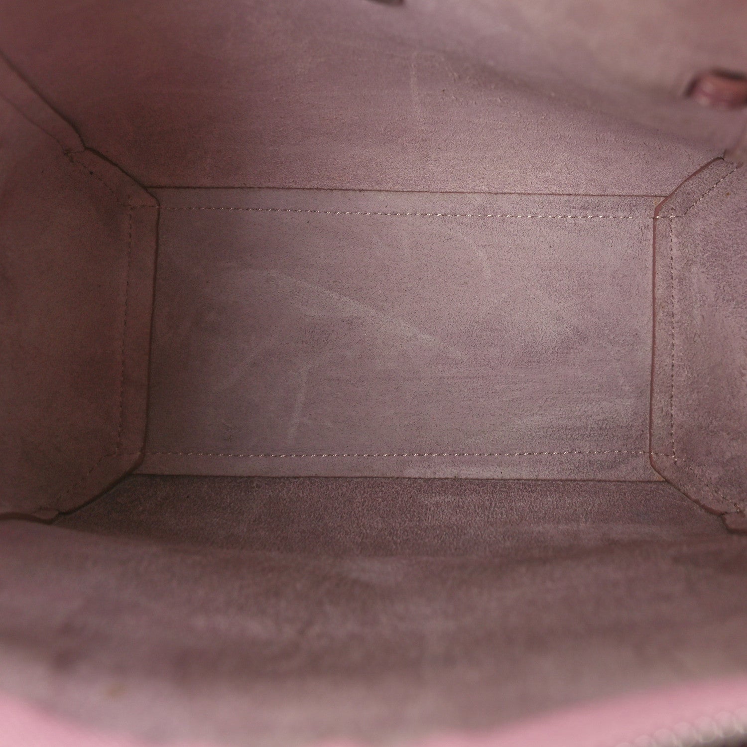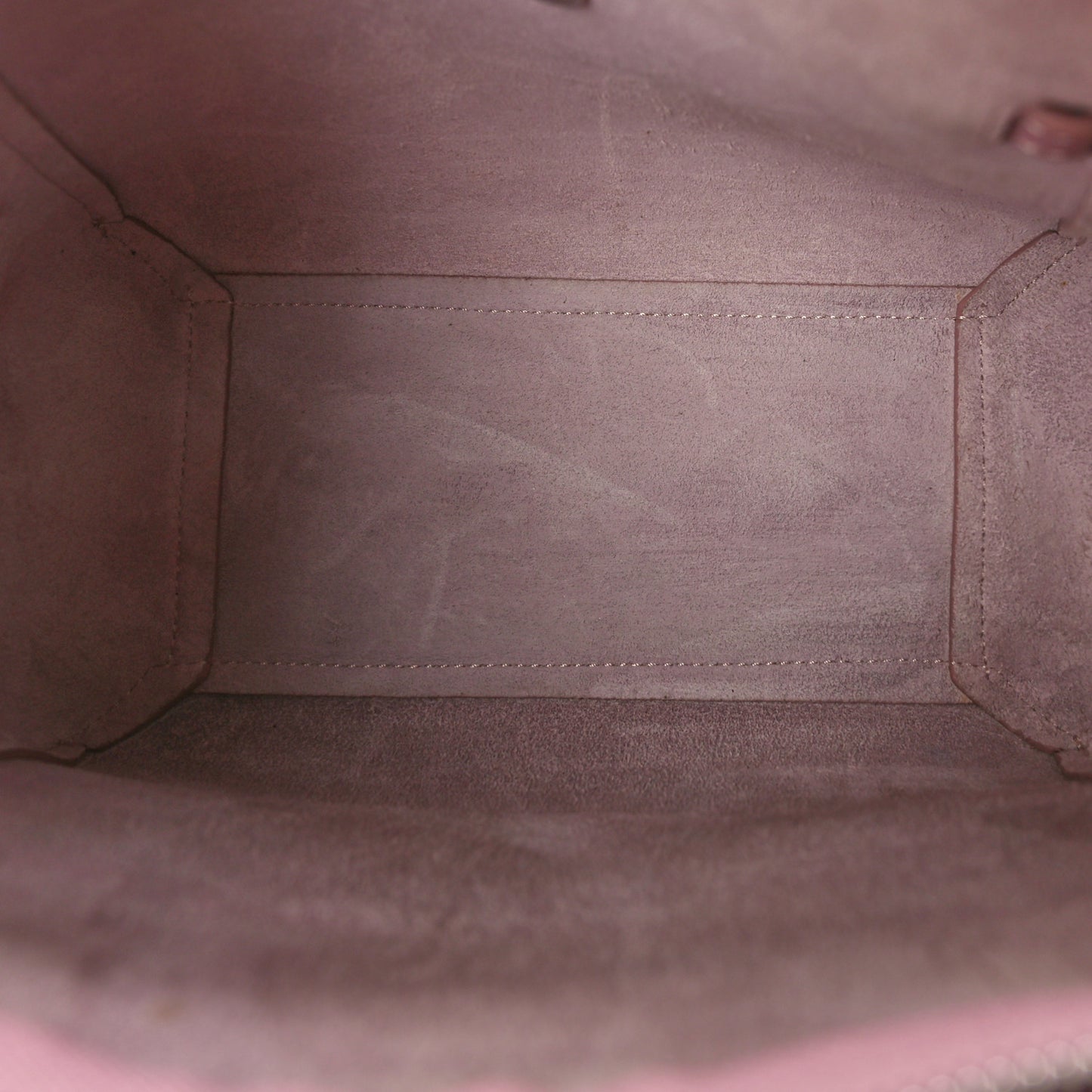 This is an authentic CELINE Grained Calfskin Nano Belt Bag in Antique Rose. This stylish hand is crafted of textured pink calfskin leather. The bag features a leather top handle, an optional adjustable shoulder strap, and silver hardware. The crossover flap and top zipper opens to a matching pink suede interior.