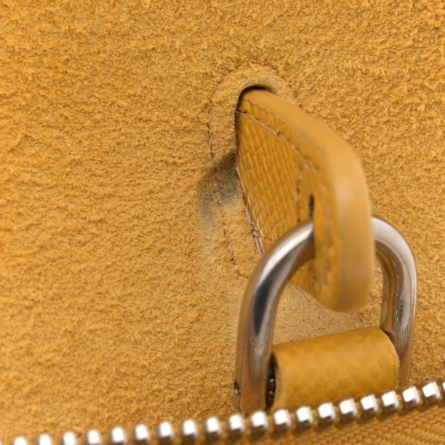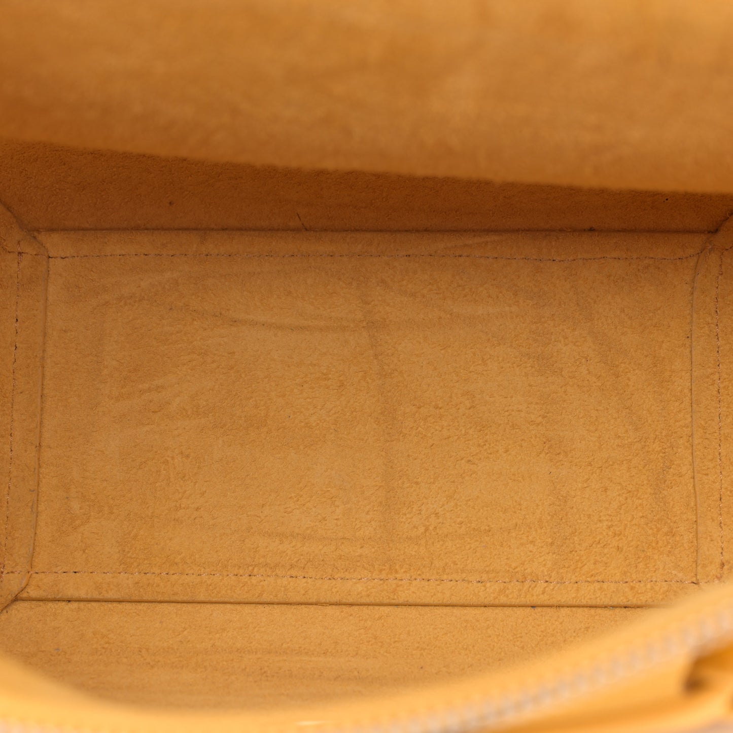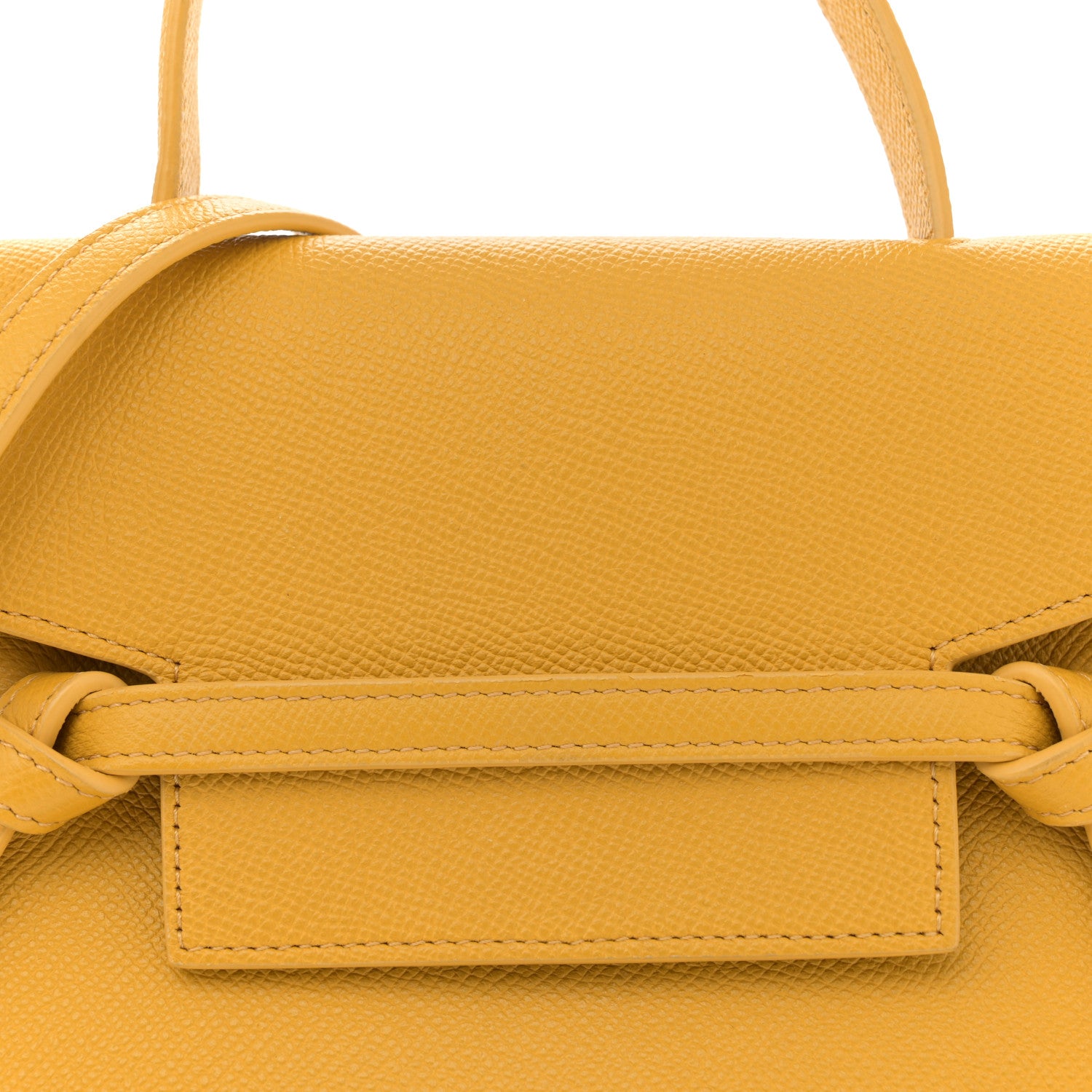 This is an authentic CELINE Grained Calfskin Nano Belt Bag in Sunflower. This chic tote is crafted of richly textured calfskin leather with a structured silhouette in yellow. The bag features a leather strap top handle, an optional shoulder strap, and a facing flap secured by a strap and silver magnet. This opens to a matching suede leather interior.