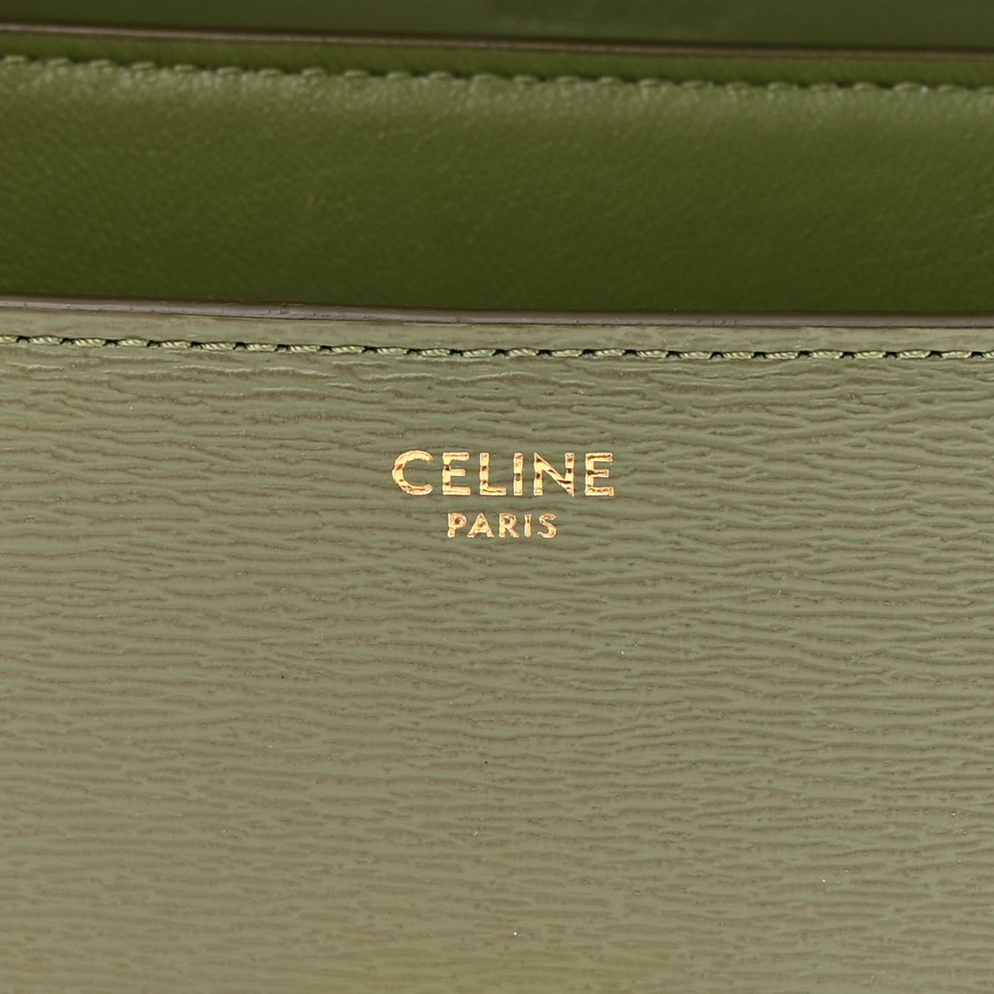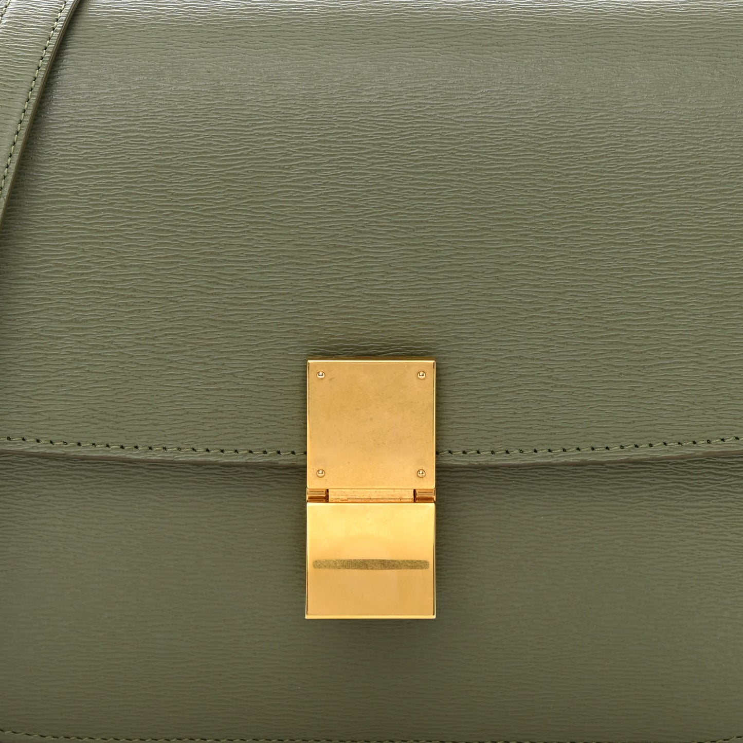 This is an authentic CELINE Liege Calfskin Medium Classic Box Flap Bag in Army Green. This super chic shoulder bag is crafted of fine textured calfskin leather in green and features an adjustable leather shoulder strap and a frontal aged gold press lock. This opens the flap to a partitioned matte leather interior with a zipper compartment and two patch pockets.
