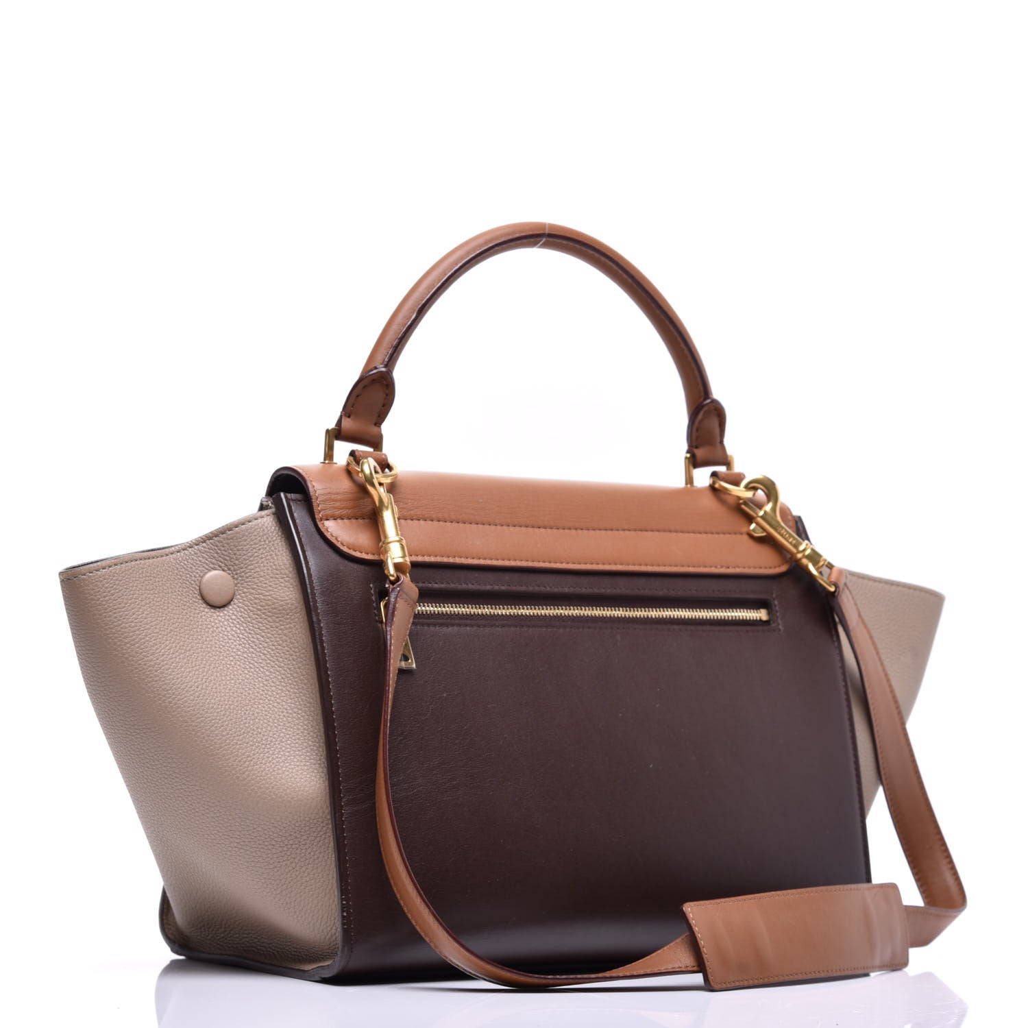 This is an authentic CELINE Satin Baby Grained Calfskin Tri-color Medium Trapeze Tan. This stylish tote is crafted of calfskin leather in brown. The bag features a rolled leather top handle with an optional leather shoulder strap, a rear exterior zippered pocket, and a frontal flap with a gold square logo clasp closure. The flap opens and reveals a brown leather interior with patch pockets.Follow this item for alerts. Celine is a registered trademark of Celine. FASHIONPHILE is not affiliated with Celine.