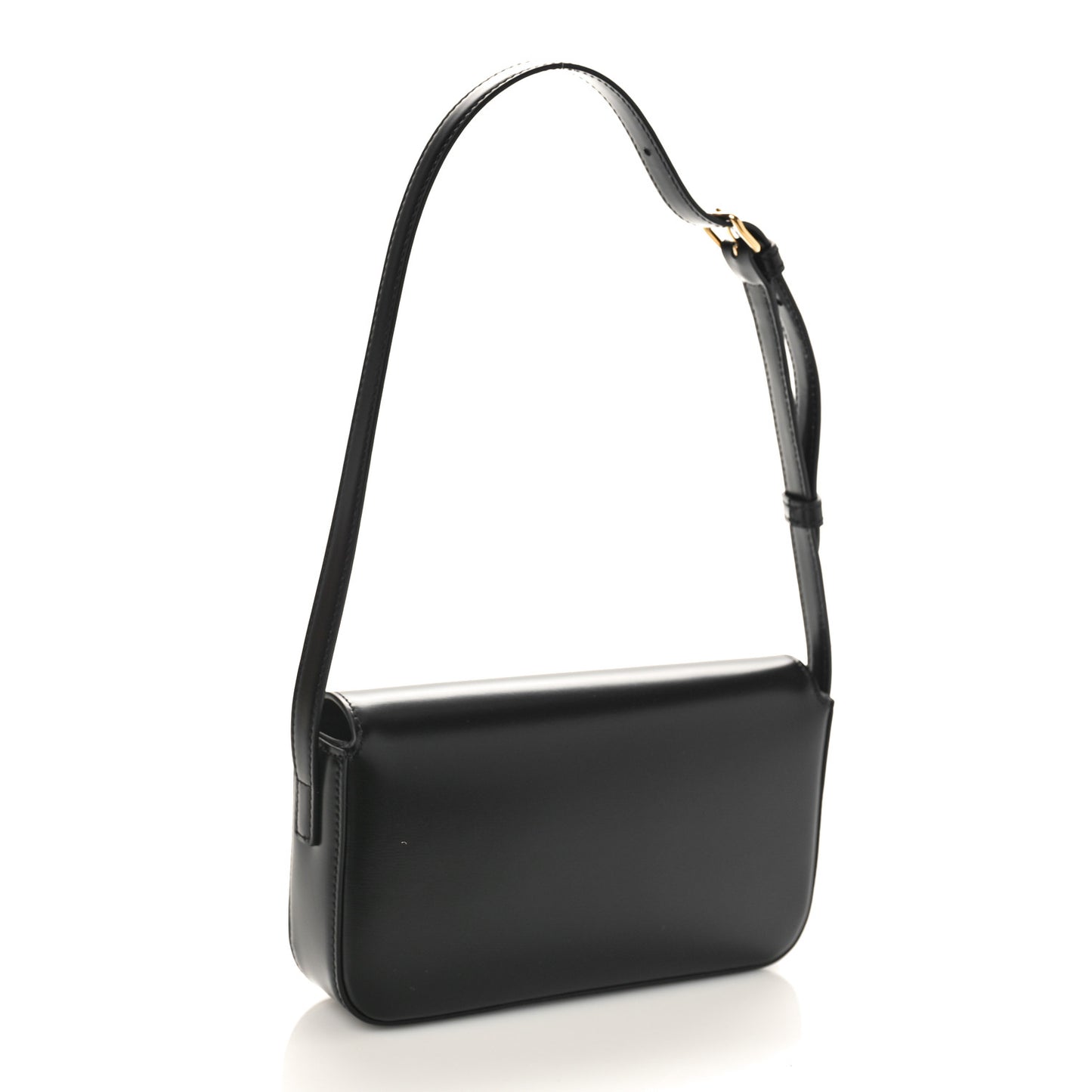 This is an authentic CELINE Shiny Calfskin Triomphe Shoulder Bag in Black. This chic shoulder bag is crafted of smooth calfskin leather in black. The bag features an adjustable leather shoulder strap with gold hardware, and a matching gold press lock on the crossover flap that opens to a partitioned black leather interior with a flat pocket.Follow this item for alerts. Celine is a registered trademark of Celine. FASHIONPHILE is not affiliated with Celine.