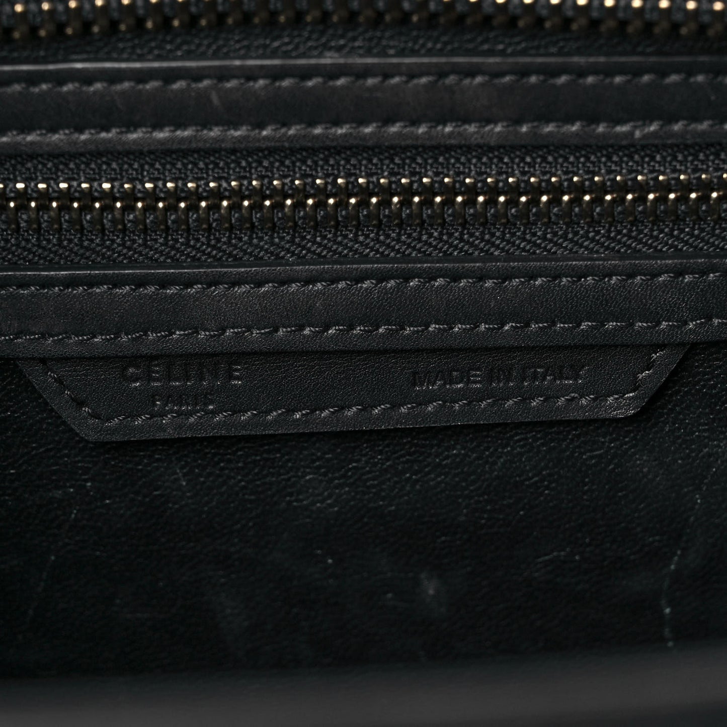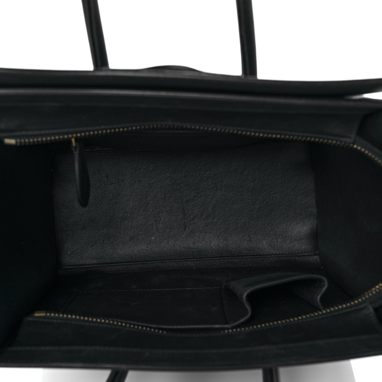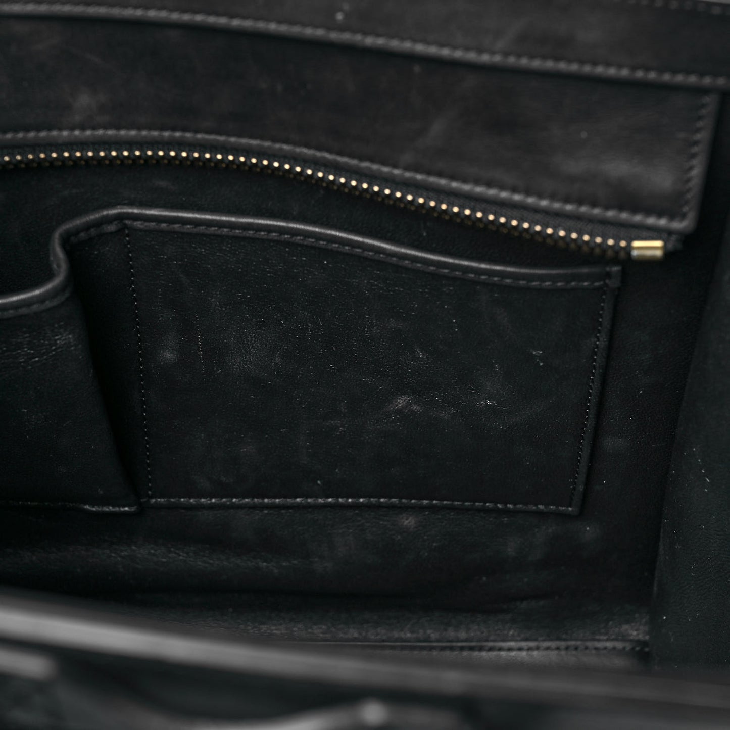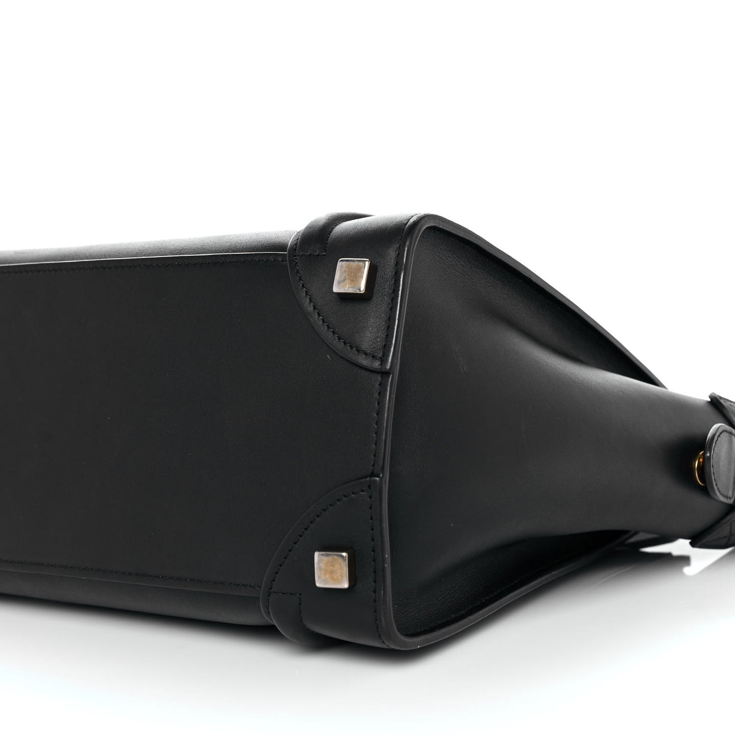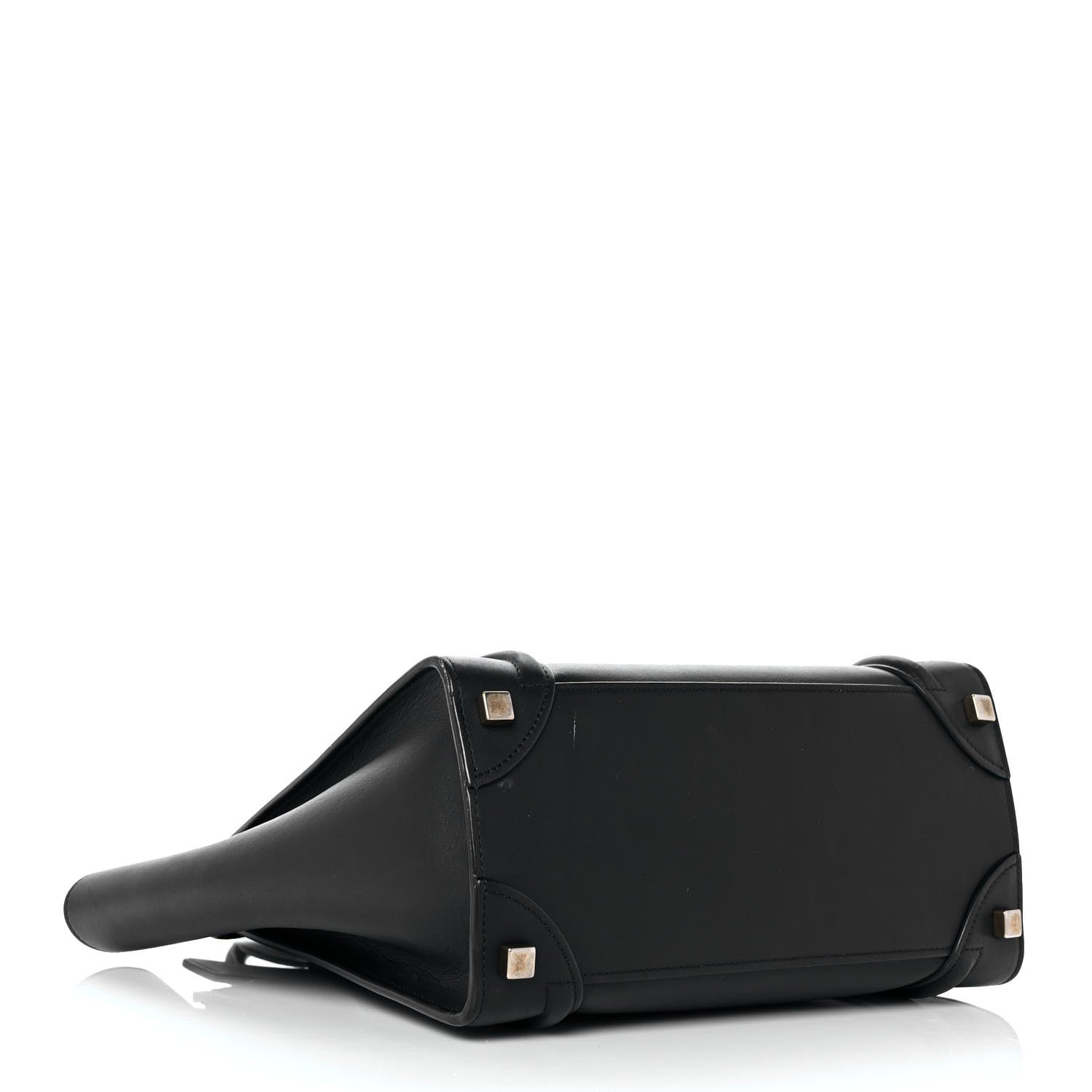 This is an authentic CELINE Smooth Calfskin Micro Luggage in Black. This stylish tote is crafted of luxuriously smooth calfskin leather in black. It features rolled leather top handles with a signature Celine scroll trim and expansive sides. The overextended zipper opens to a spacious leather interior with zipper and patch pockets.Follow this item for alerts. Celine is a registered trademark of Celine. FASHIONPHILE is not affiliated with Celine.