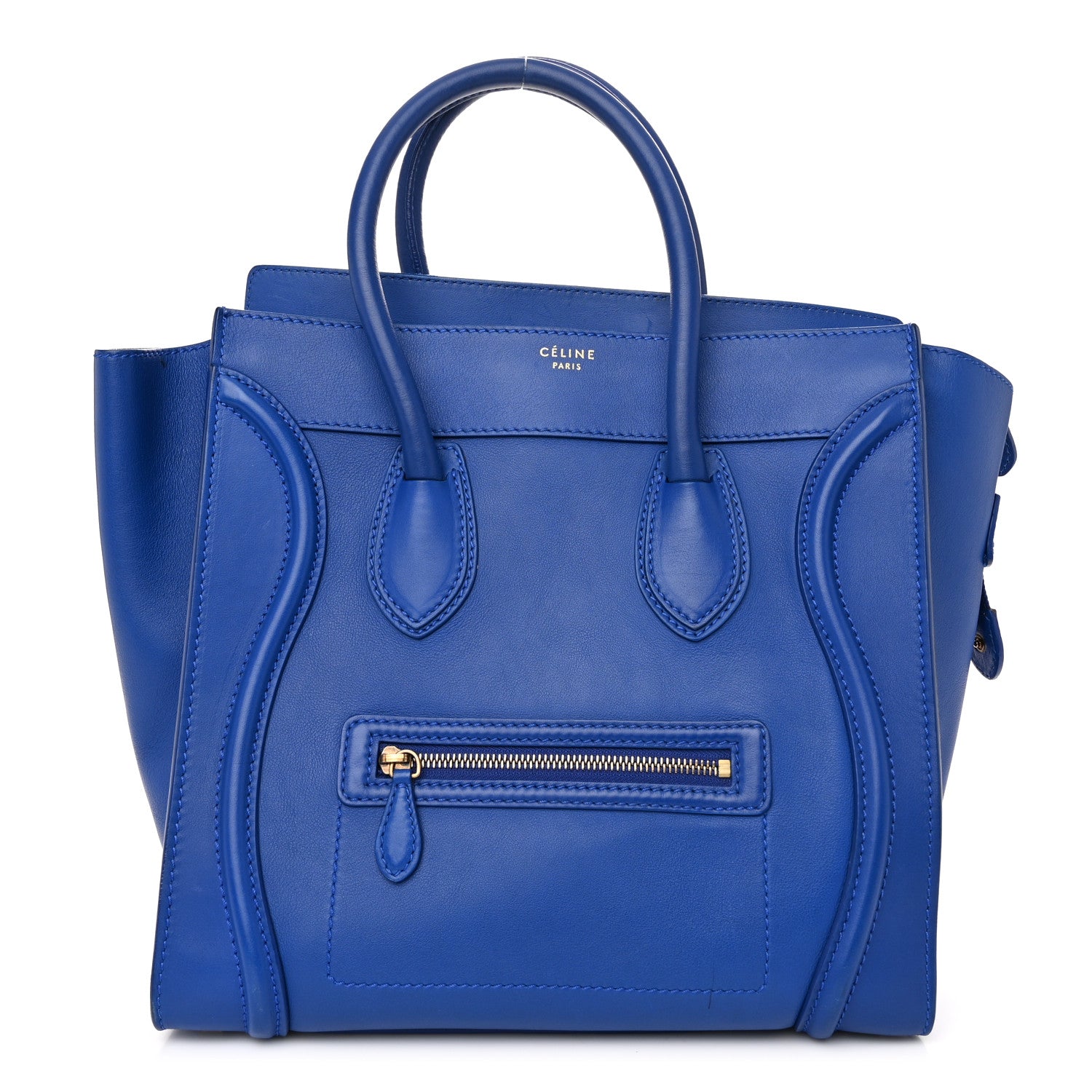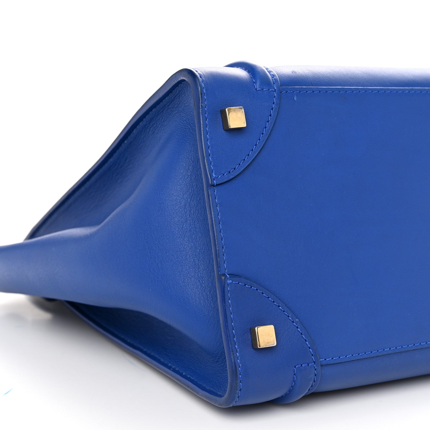 This is an authentic CELINE Smooth Calfskin Mini Luggage in Royal Blue. This stylish tote is crafted of smooth calfskin leather with rolled top handles, gold hardware, winged sides, and an exterior zip pocket. The top zips open to a matching leather interior with zipper and patch pockets.Follow this item for alerts. Celine is a registered trademark of Celine. FASHIONPHILE is not affiliated with Celine.