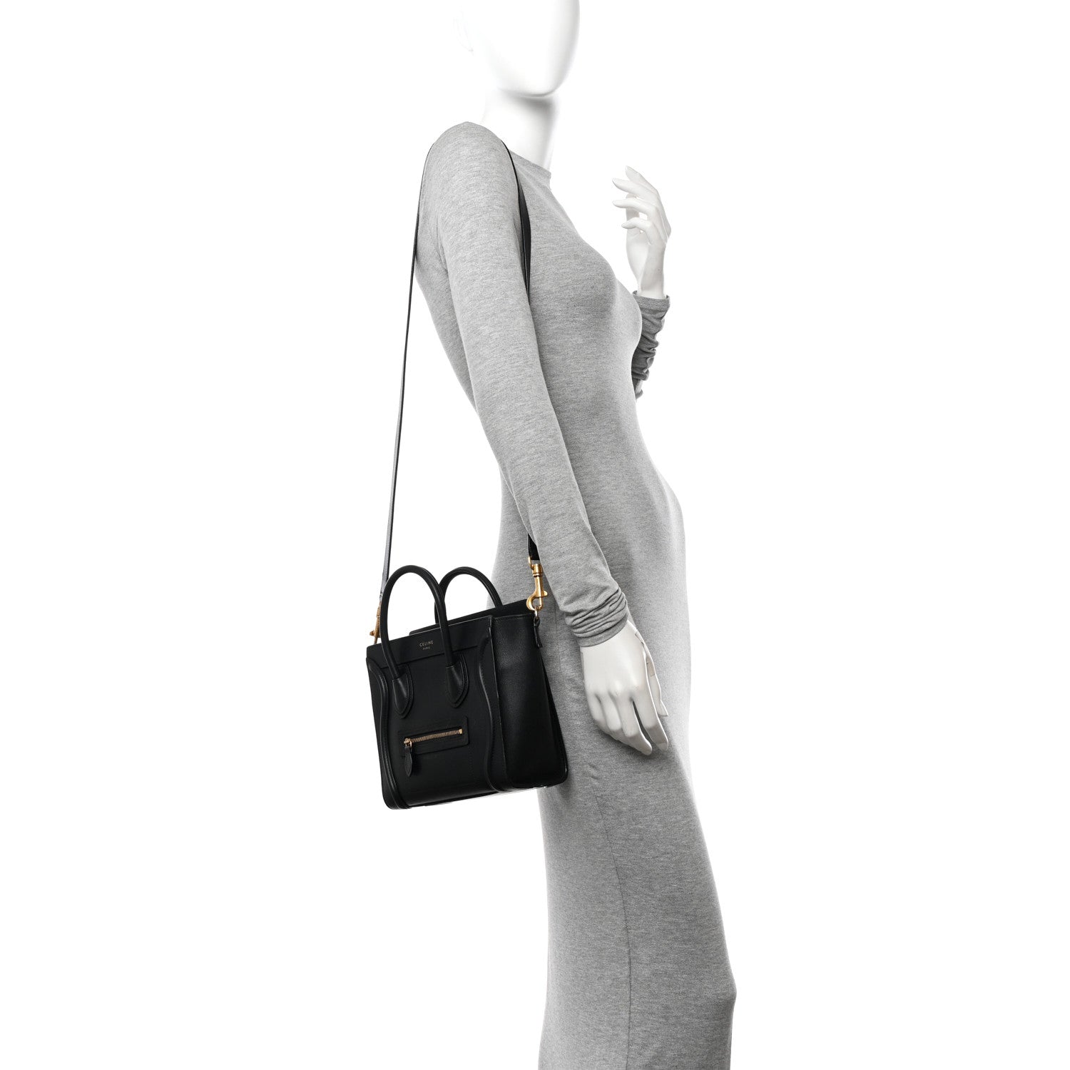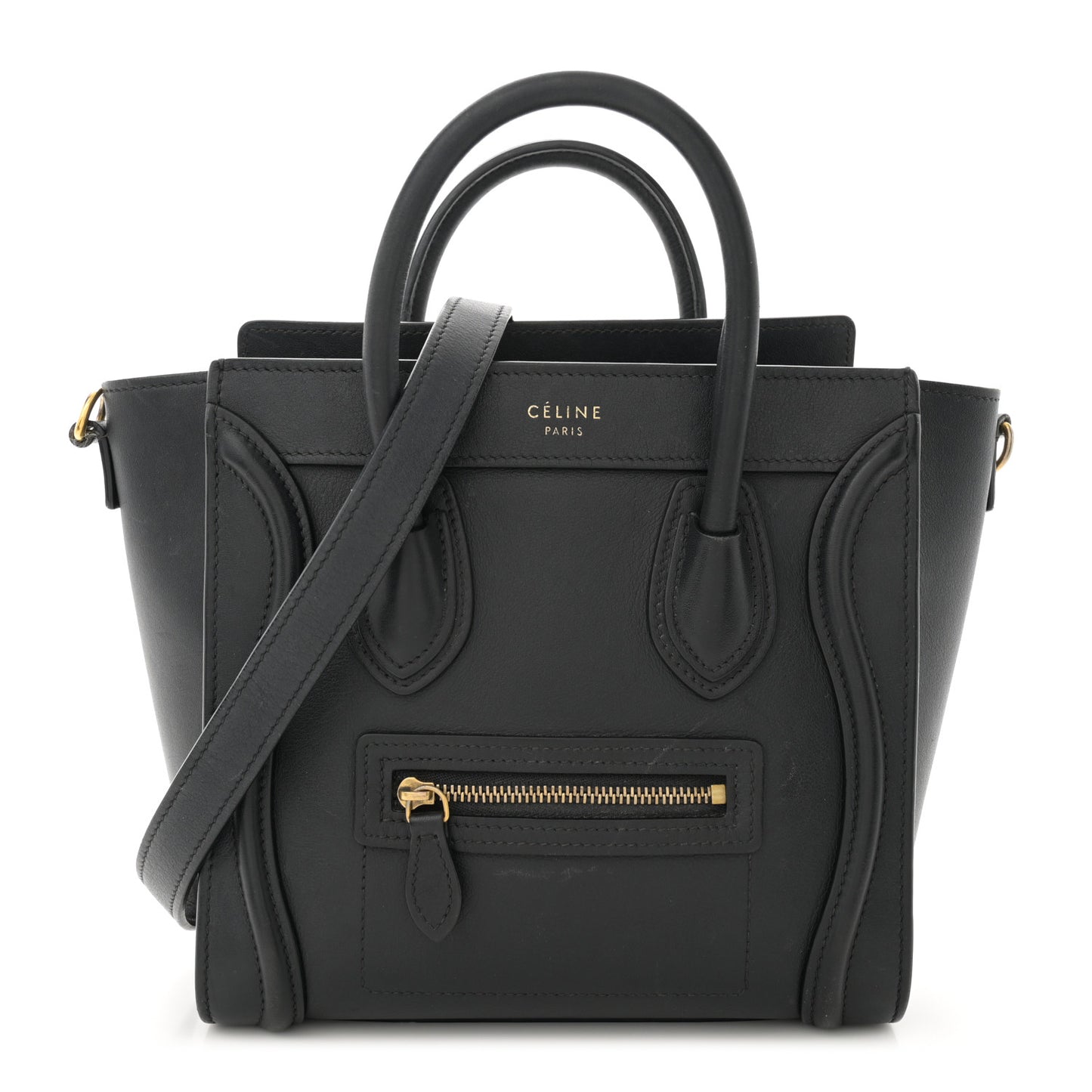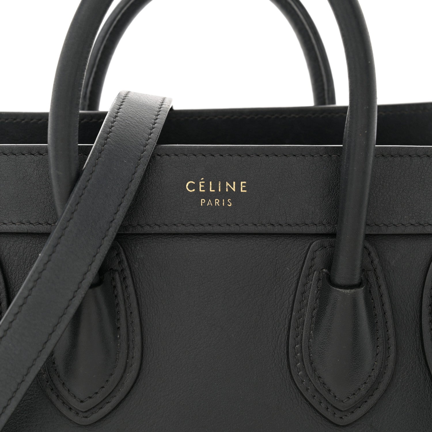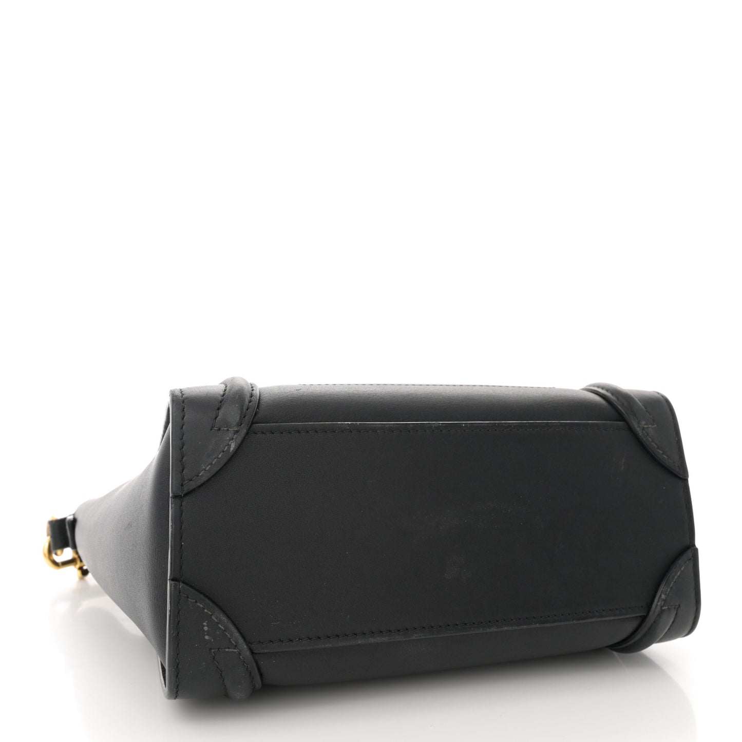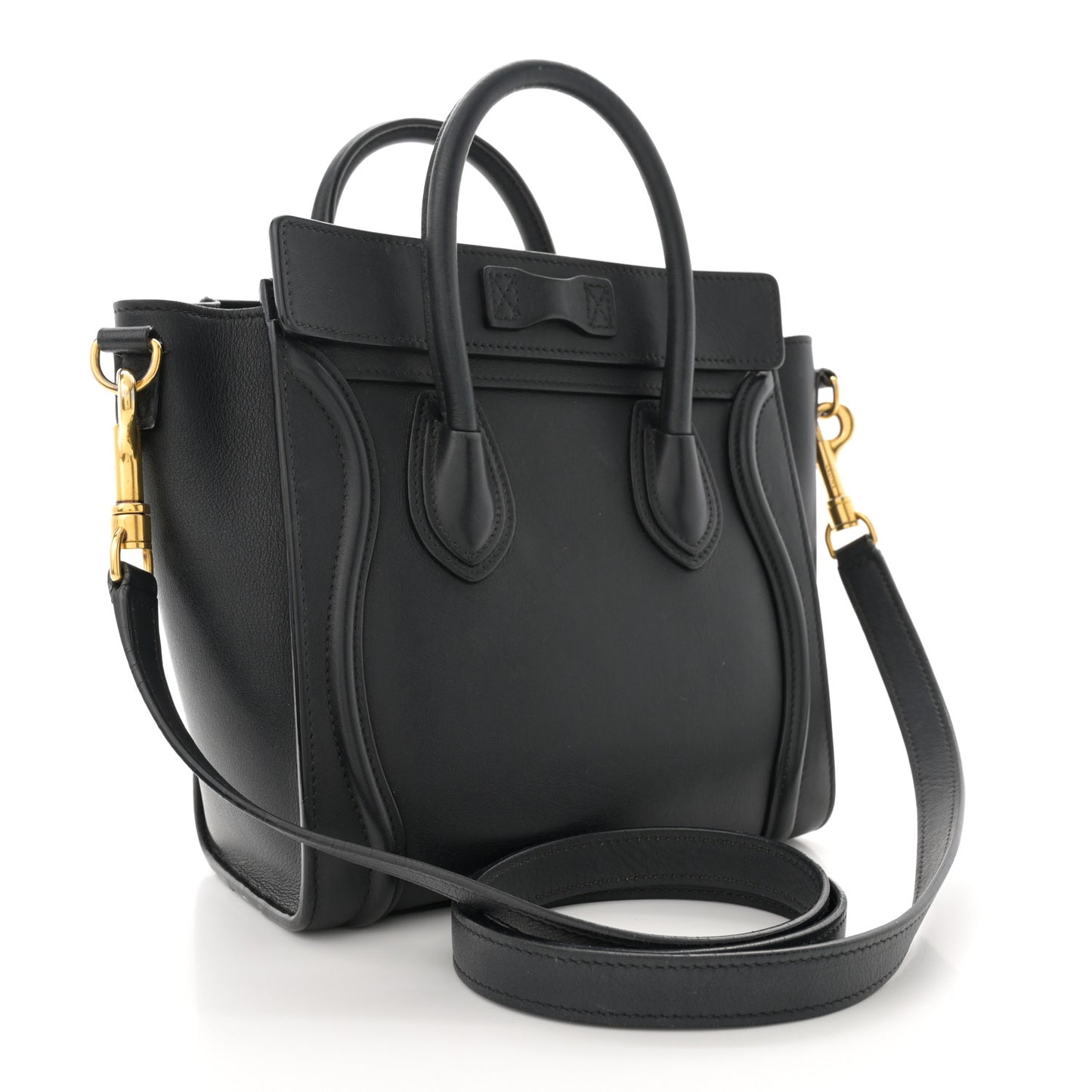 This is an authentic CELINE Smooth Calfskin Nano Luggage in Black. This stylish small tote is crafted of calfskin leather in black. This shoulder bag features rolled leather top handles, an optional shoulder strap with aged gold clasps and decorative leather detailing. The top unzips to a matching leather interior with a patch pocket.Follow this item for alerts. Celine is a registered trademark of Celine. FASHIONPHILE is not affiliated with Celine.