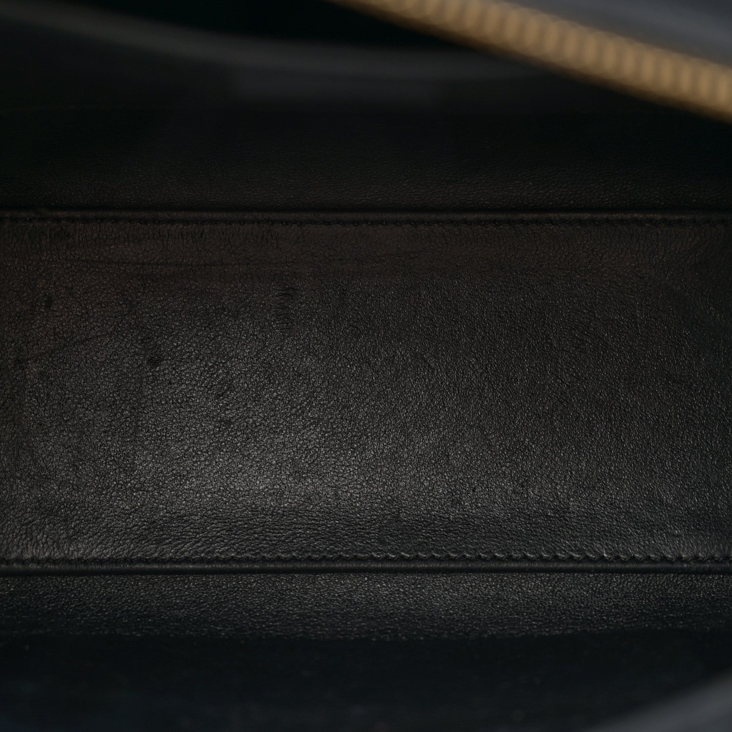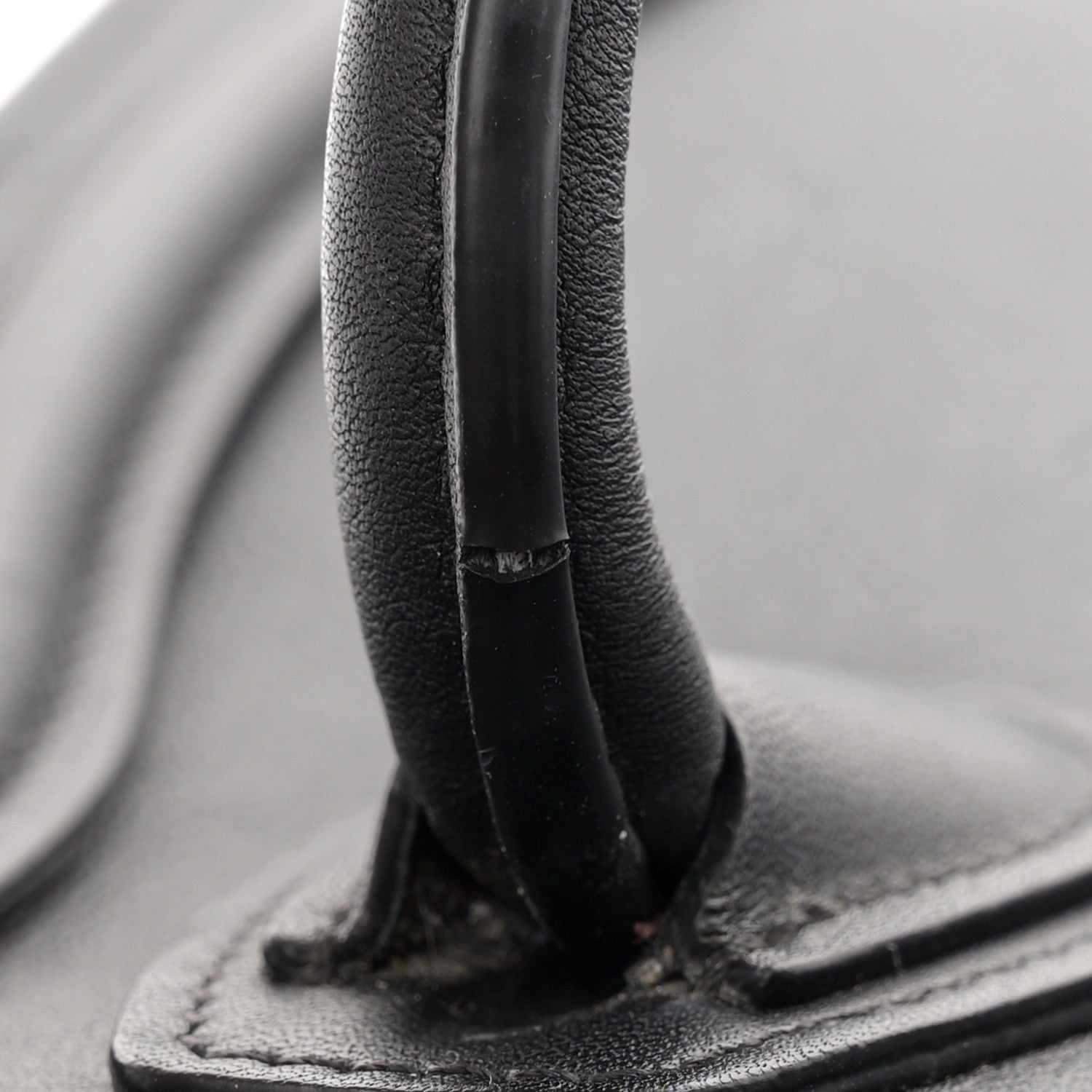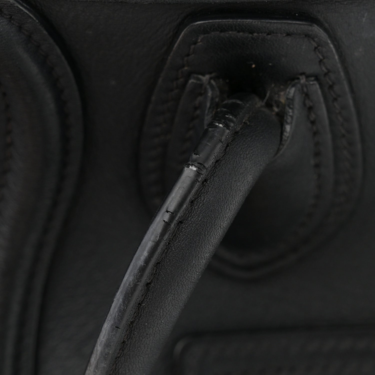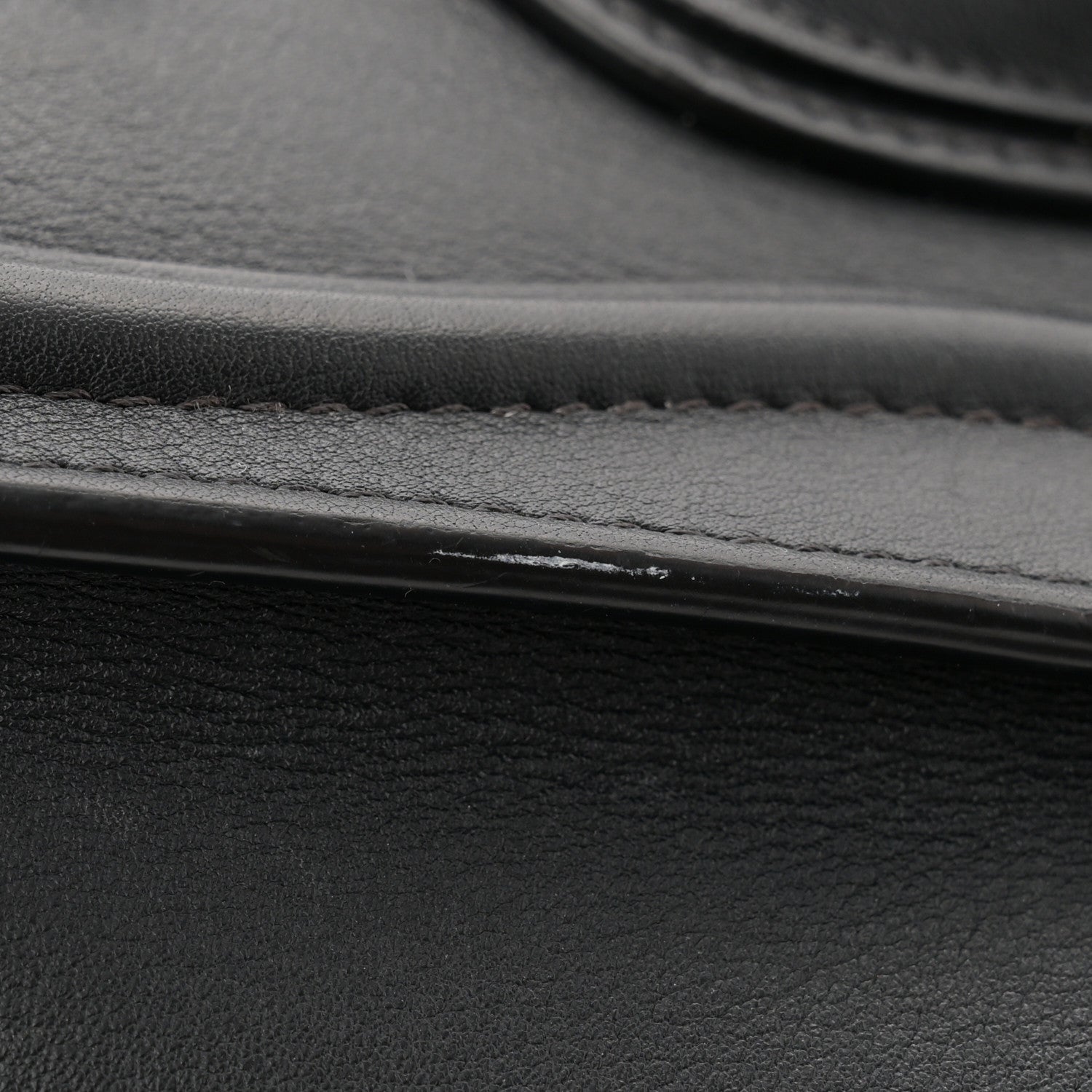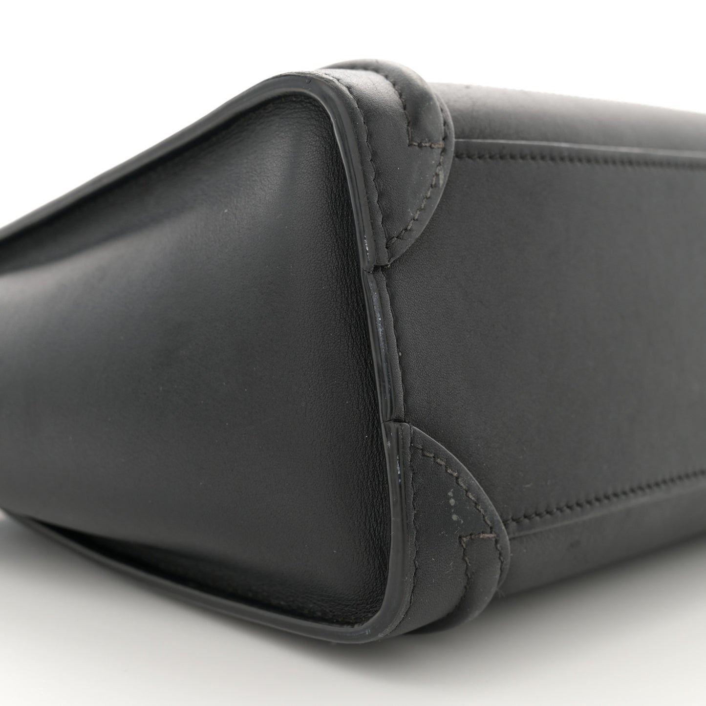 This is an authentic CELINE Smooth Calfskin Nano Luggage in Black. This stylish small tote is crafted of calfskin leather in black. This shoulder bag features rolled leather top handles, an optional shoulder strap with aged gold clasps and decorative leather detailing. The top unzips to a matching leather interior with a patch pocket.Follow this item for alerts. Celine is a registered trademark of Celine. FASHIONPHILE is not affiliated with Celine.