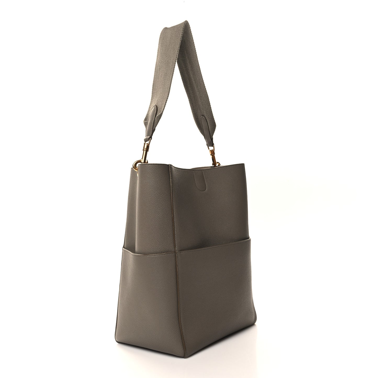 This is an authentic CELINE Soft Grained Calfskin Sangle Bucket Bag in Taupe. This chic shoulder bag is crafted of richly grained calfskin leather in taupe. This stylish bag features a canvas shoulder strap with aged gold clasps and a horizontal rim around the center of the bag to form a patch pocket on each side of the bag. The top is open to a matching suede leather interior with zipper and patch pockets.Follow this item for alerts. Celine is a registered trademark of Celine. FASHIONPHILE is not affiliated with Celine.