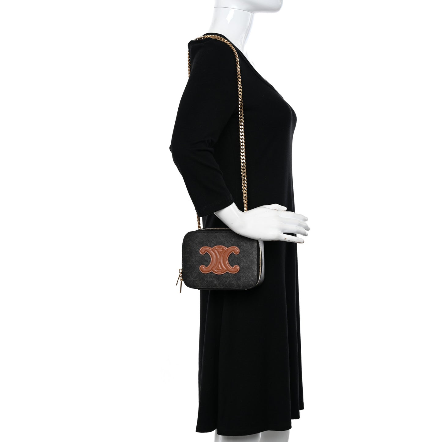 This is an authentic CELINE Triomphe Canvas Calfskin Cuir Box On Chain in Tan. This chic shoulder bag is crafted of luxuriously smooth brown calfskin leather and coated canvas. The bag features a chain shoulder strap and a gold top zipper. This opens to a brown fabric interior.Follow this item for alerts. Celine is a registered trademark of Celine. FASHIONPHILE is not affiliated with Celine.