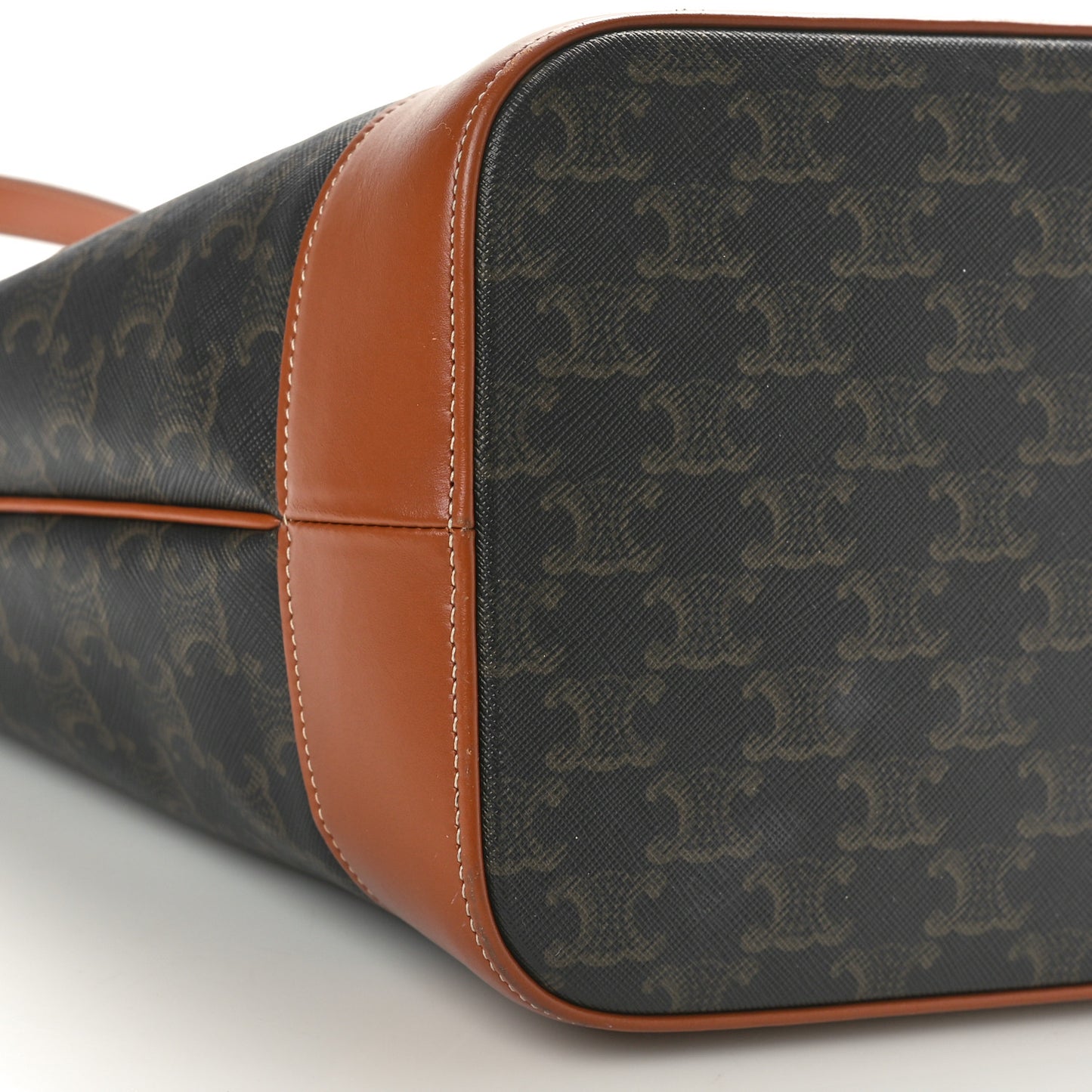 This is an authentic CELINE Triomphe Canvas Calfskin Medium Bucket Bag in Tan. This ultra chic shoulder bag is crafted of brown coated canvas, with brown leather trim. The bag features an adjustable leather shoulder strap with gold hardware, and the top is open to a brown fabric interior.Follow this item for alerts. Celine is a registered trademark of Celine. FASHIONPHILE is not affiliated with Celine.