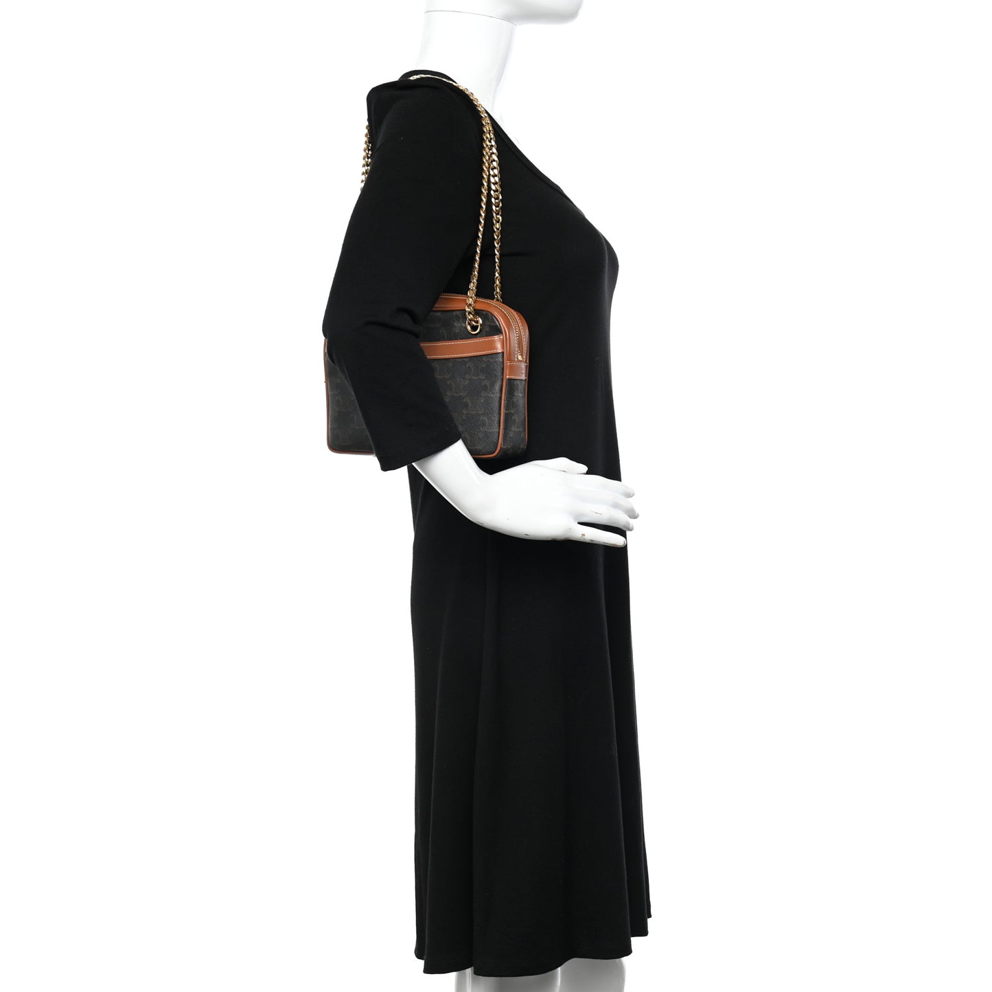 This is an authentic CELINE Triomphe Canvas Calfskin Medium Patapans in Tan. This chic shoulder bag is crafted of luxuriously black coated canvas with brown leather trim. The bag features a gold chain shoulder strap, a front pocket, and gold hardware. The top zipper opens to a brown fabric interior with a zipper pocket.Follow this item for alerts. Celine is a registered trademark of Celine. FASHIONPHILE is not affiliated with Celine.