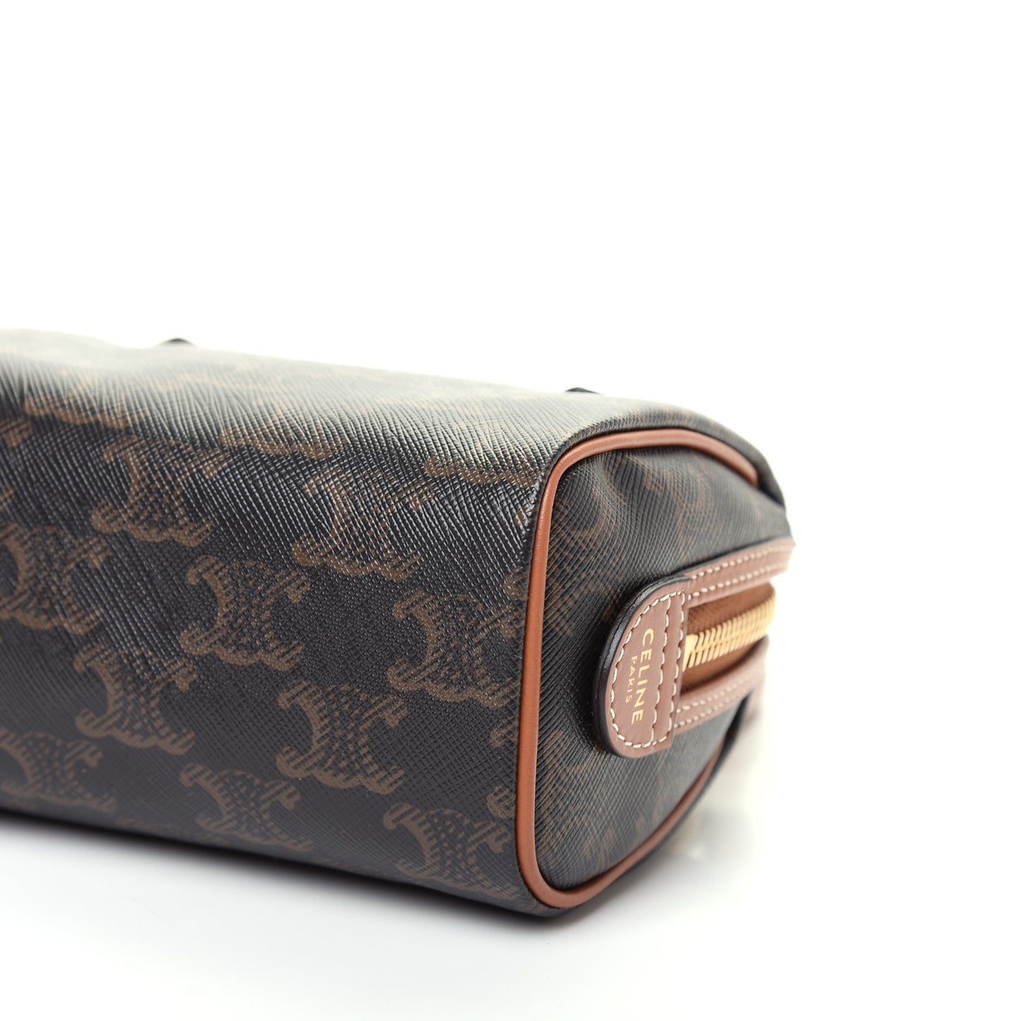This is an authentic CELINE Triomphe Canvas Mini Boston Bag in Tan. This chic bag is crafted of monogram coated canvas with brown leather trim. The bag features leather top handles with gold hardware and a top zipper. The handbag opens to a brown fabric interior.Follow this item for alerts. Celine is a registered trademark of Celine. FASHIONPHILE is not affiliated with Celine.