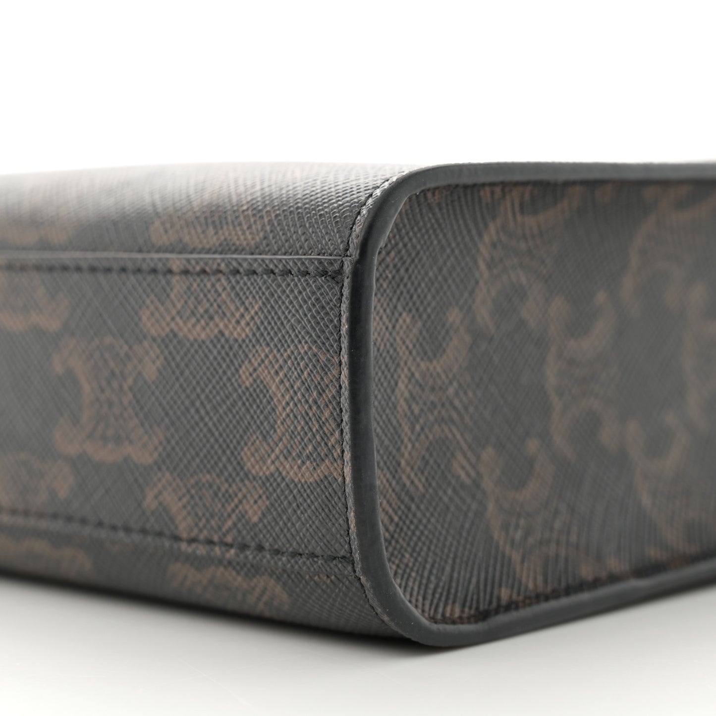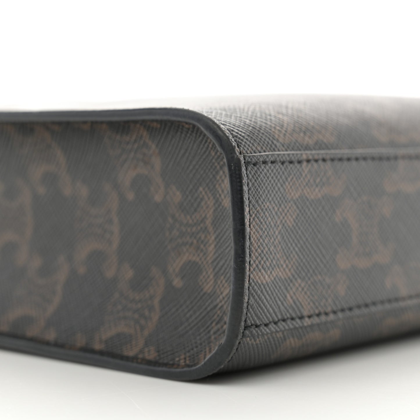 This is an authentic CELINE Triomphe Canvas Calfskin Mini Vertical Cabas in Tan. This sleek mini tote is crafted of Celine triomphe monogram coated canvas with a white Celine logo across the front. The bag features brown rolled leather top handles and an optional shoulder strap. The top is open to a brown fabric interior.Follow this item for alerts. Celine is a registered trademark of Celine. FASHIONPHILE is not affiliated with Celine.