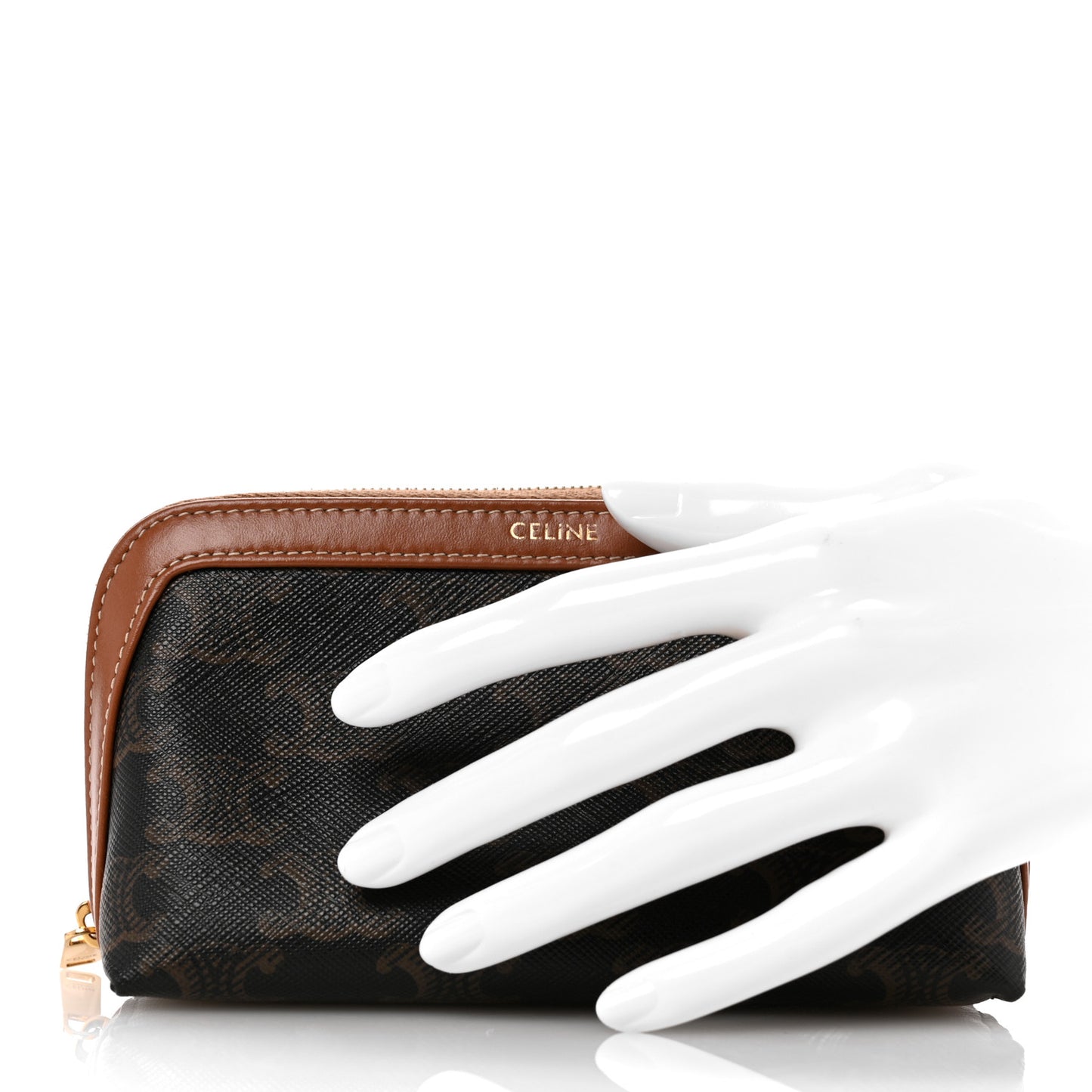 This is an authentic CELINE Triomphe Canvas Calfskin Small Cosmetic Pouch in Tan. This simple yet versatile pouch is crafted of triomphe coated canvas in black and brown with rich brown leather trim. This case features the Celine logo embossed in gold on the front and opens with a top zipper to a matching brown fabric interior.Follow this item for alerts. Celine is a registered trademark of Celine. FASHIONPHILE is not affiliated with Celine.