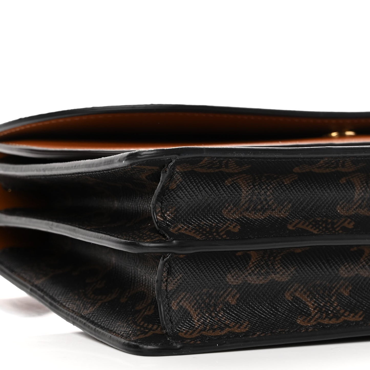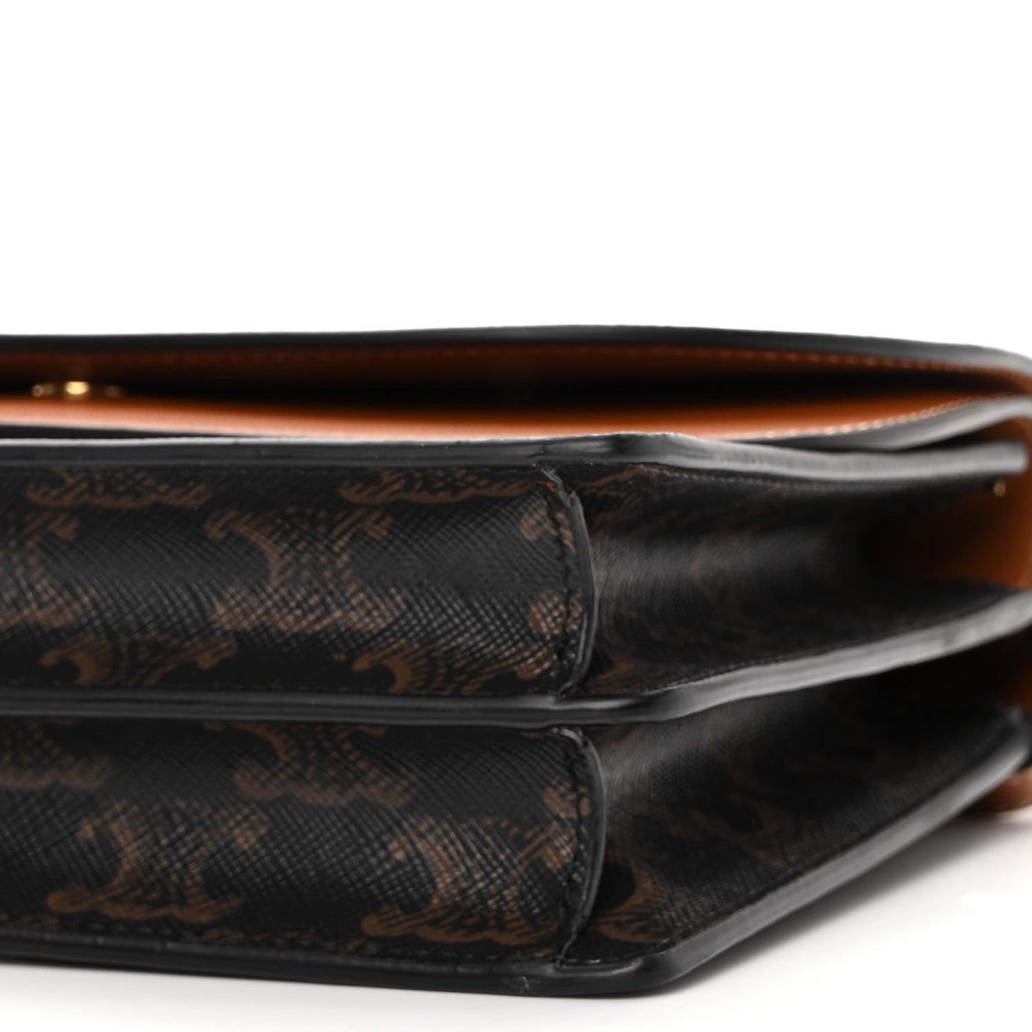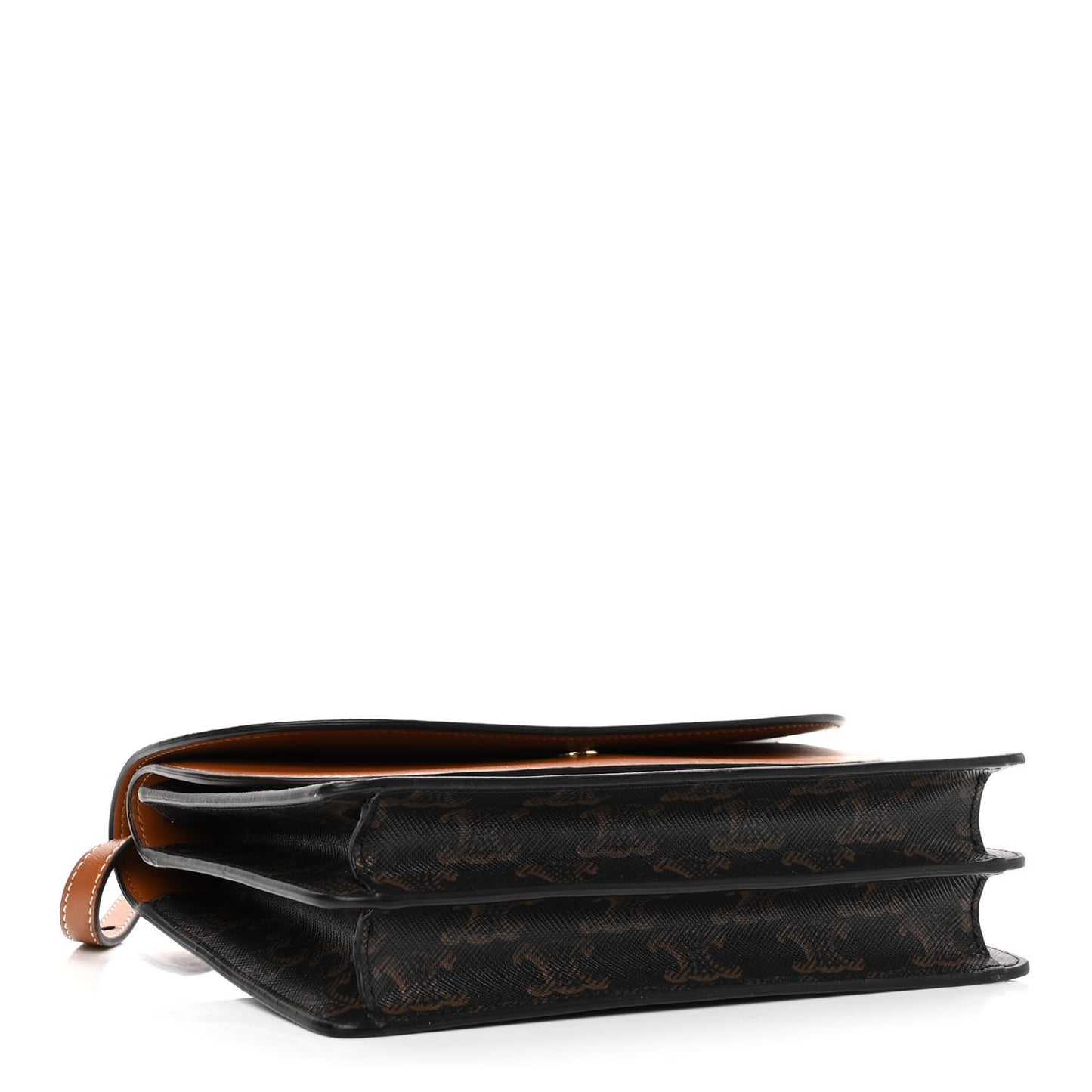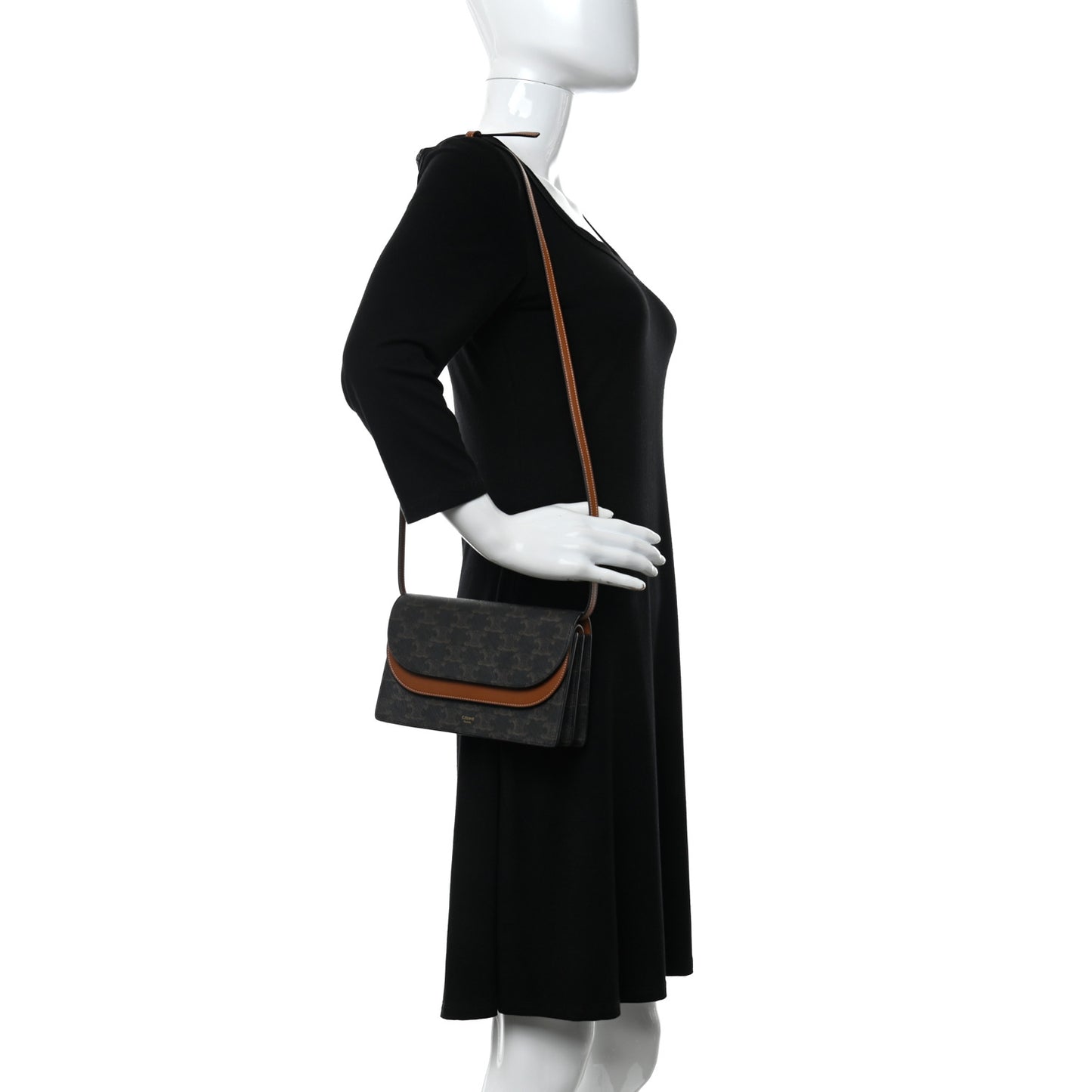 This is an authentic CELINE Triomphe Canvas Lambskin Wallet On Strap in Tan. This chic shoulder bag is crafted of fine black coated canvas with brown leather trim. It features an adjustable leather shoulder strap with gold hardware and a crossover flap. The handbag opens to a partitioned brown leather and fabric interior with patch pockets, card slots, and zipper compartment.Follow this item for alerts. Celine is a registered trademark of Celine. FASHIONPHILE is not affiliated with Celine.