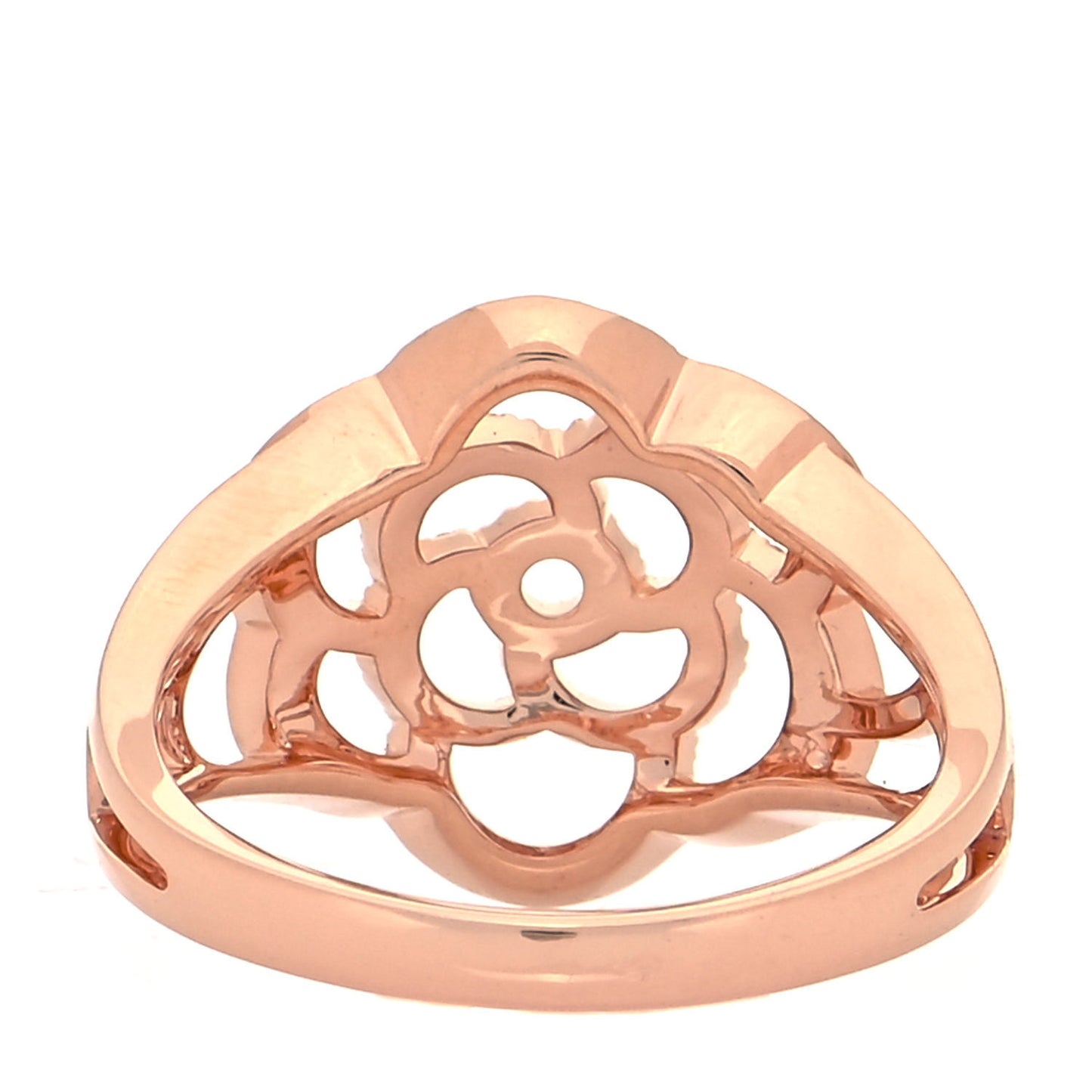 This is an authentic CHANEL 18K Rose Gold Diamond Camellia Ring size 58 or 8.5. The ring is crafted of 18 karat rose gold and features an open flower motif accented with round brilliant cut diamonds, approximately .38 total carat weight.Follow this item for alerts. Chanel is a registered trademark of Chanel. FASHIONPHILE is not affiliated with Chanel.