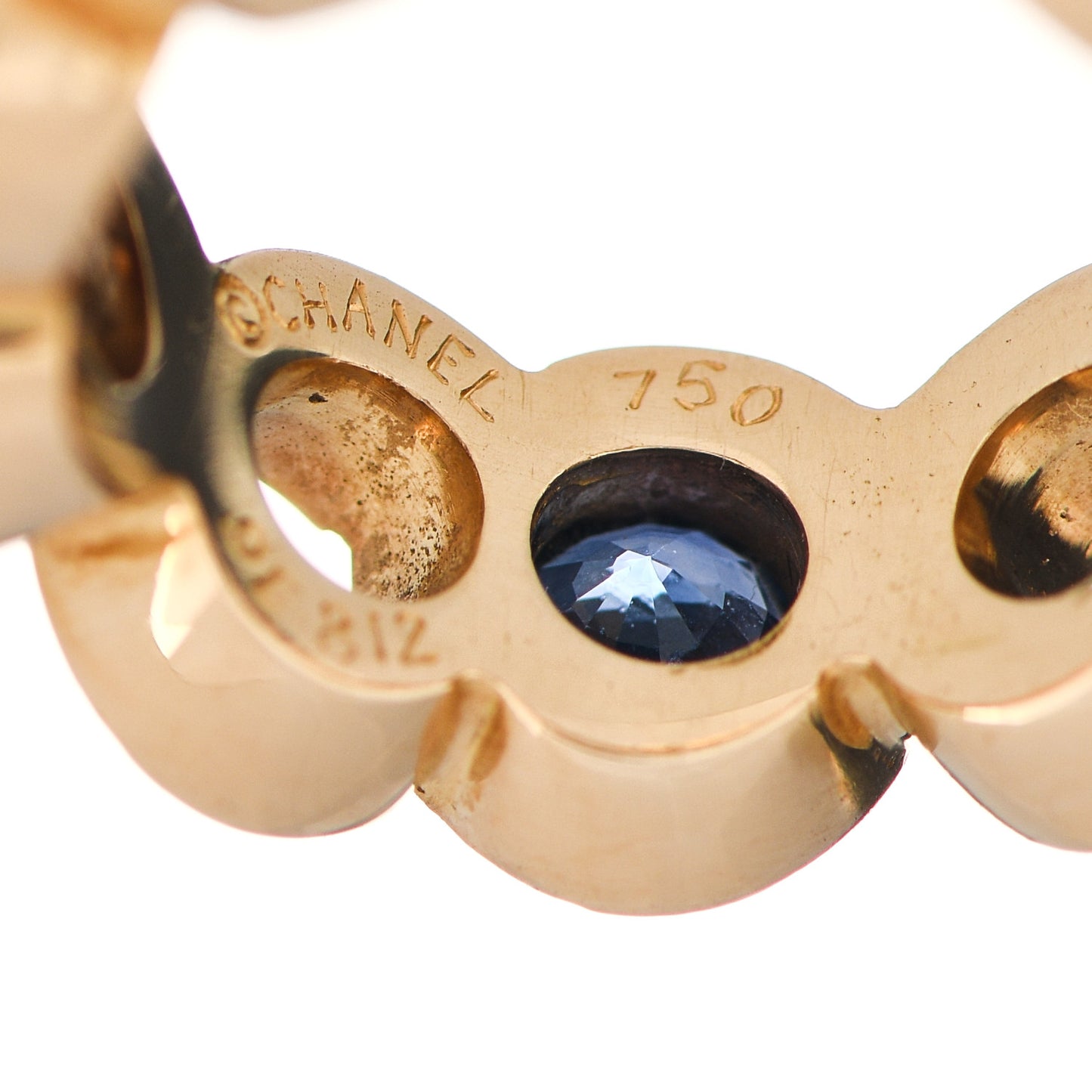 This is an authentic CHANEL 18K Yellow Gold Blue Sapphire Coco Band Ring 50 5.25. This rare ring is crafted of 18 karat yellow gold and features a COCO cutout motif band set with round cut blue sapphires.Follow this item for alerts. Chanel is a registered trademark of Chanel. FASHIONPHILE is not affiliated with Chanel.