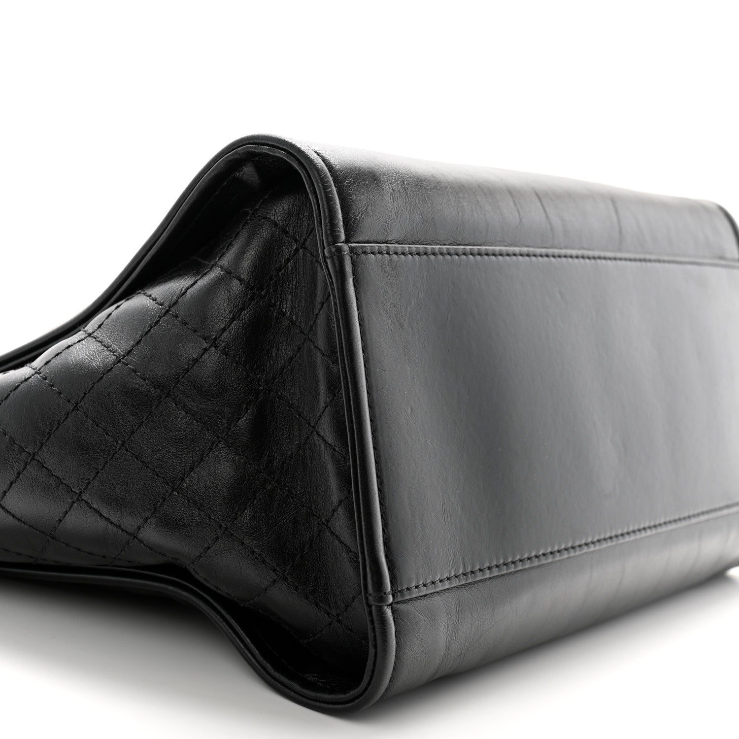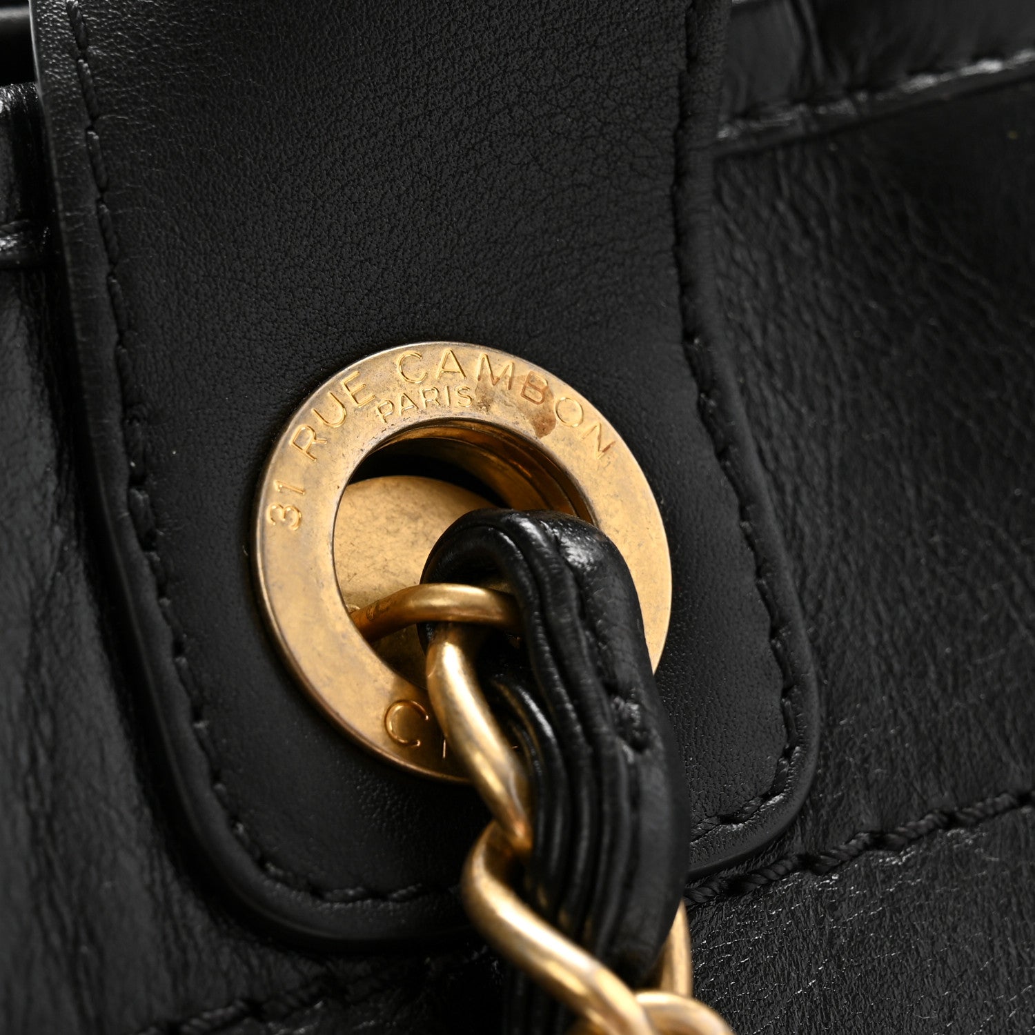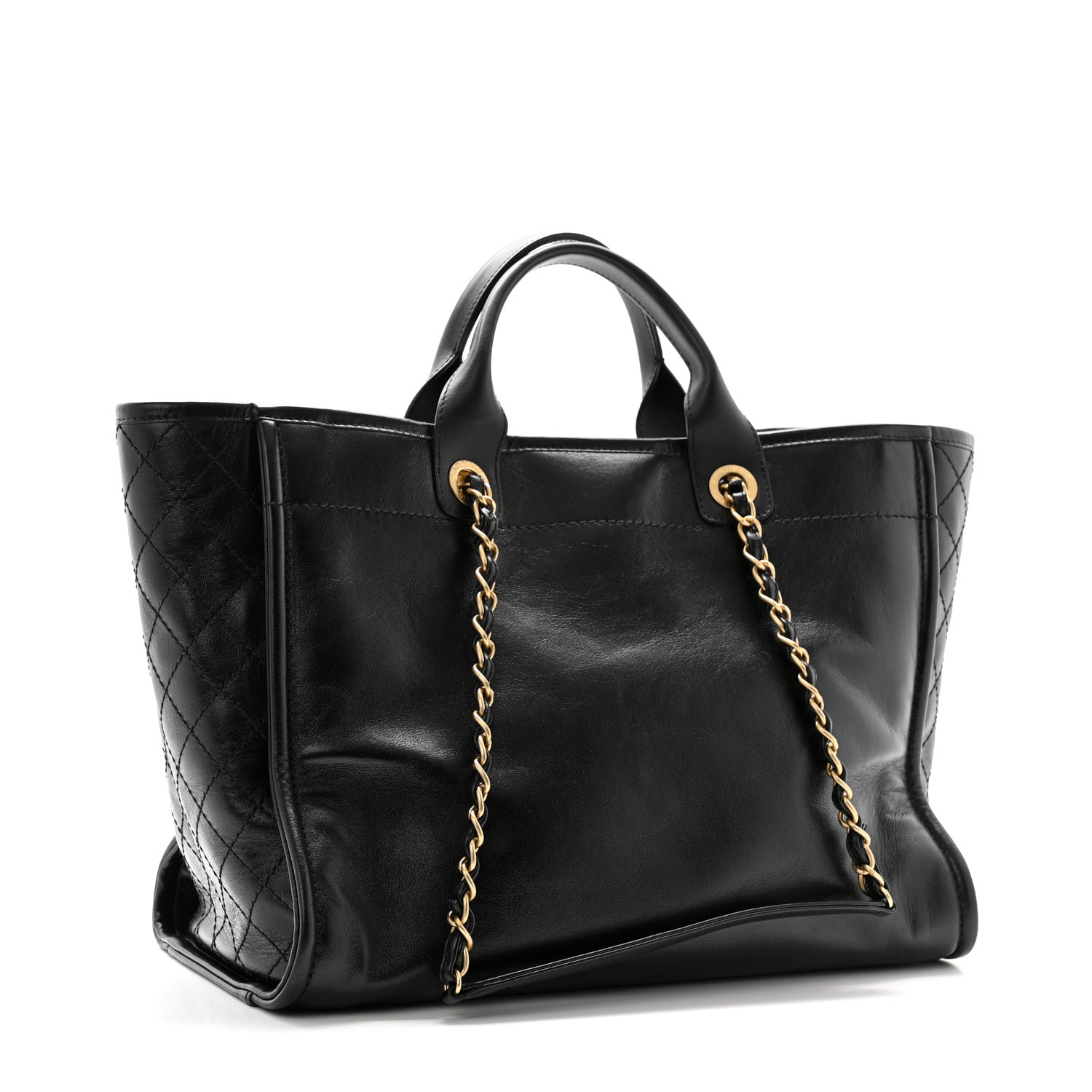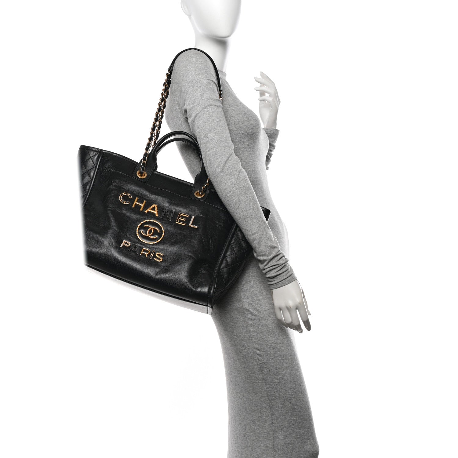 This is an authentic CHANEL Aged Calfskin Medium Charms Deauville Tote in Black. This stylish handbag is crafted of aged leather in black, with a gold Chanel advertisement logo in several different materials on the front. The bag features black leather top handles and leather threaded gold chain-link shoulder straps. The top is open to a black microfiber interior with hanging pockets.Follow this item for alerts. Chanel is a registered trademark of Chanel. FASHIONPHILE is not affiliated with Chanel.