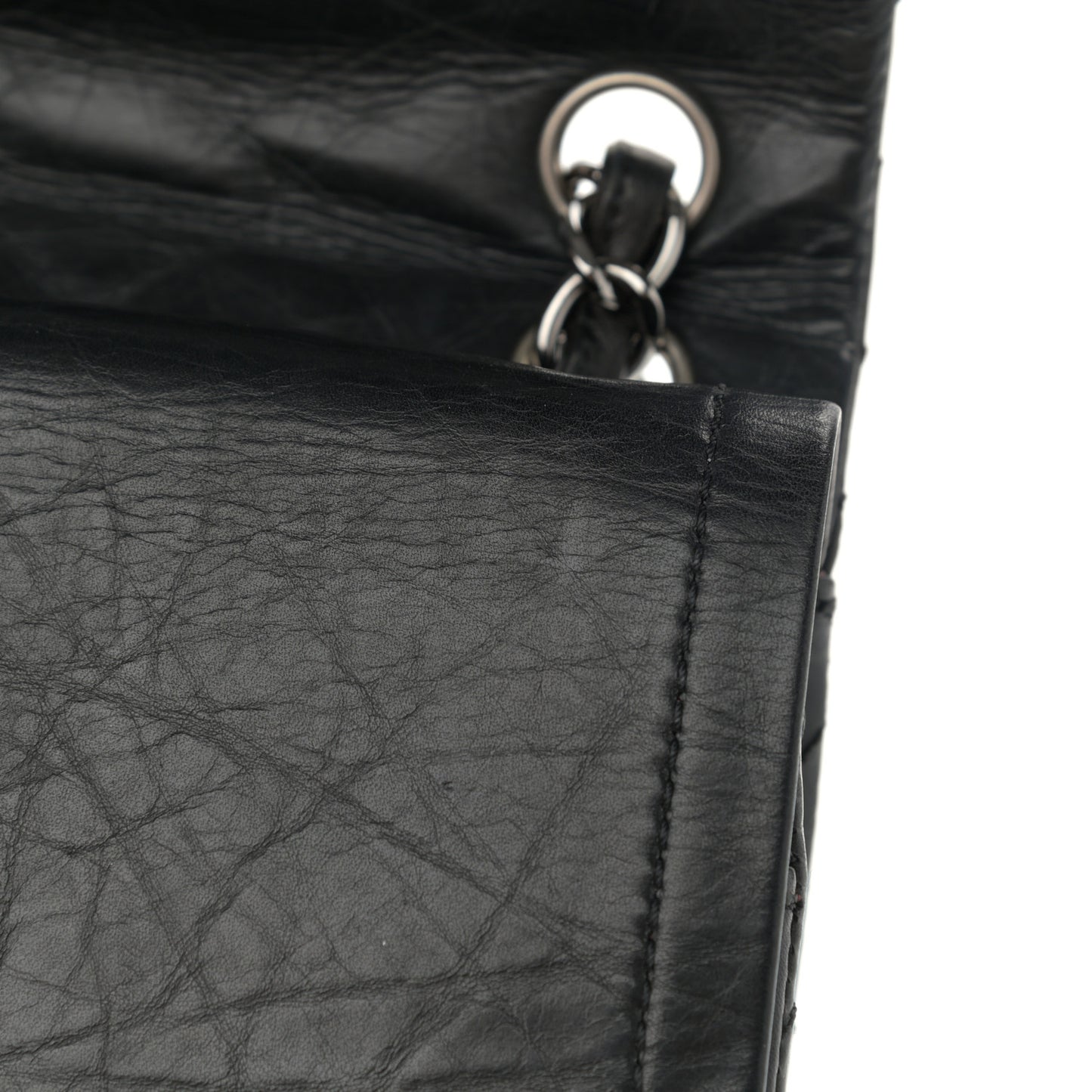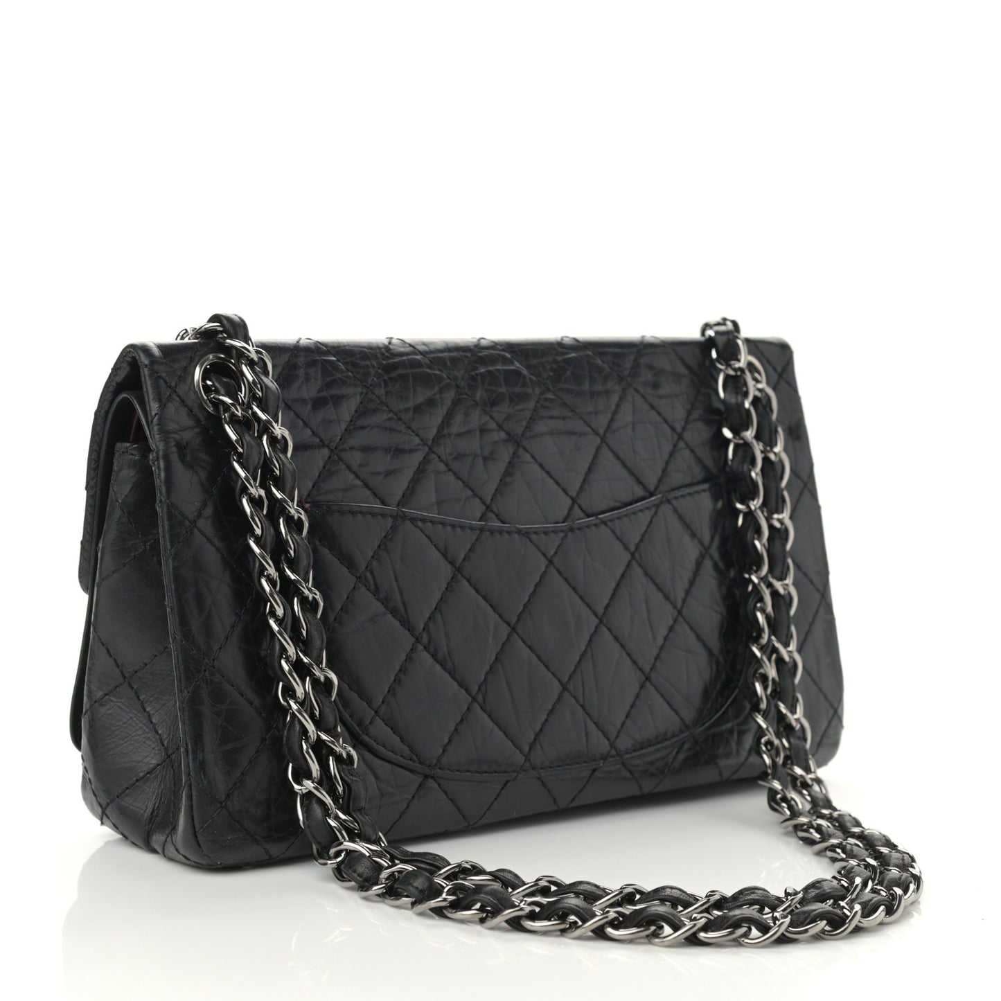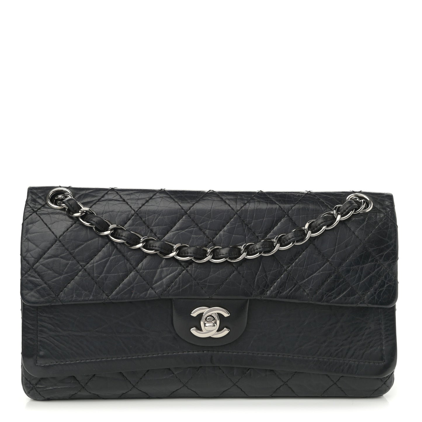 This is an authentic CHANEL Aged Calfskin Quilted Medium Double Flap in Black. This is a medium size shoulder bag is crafted of luxurious diamond quilted lambskin leather in black. The bag features silver chain link shoulder straps threaded with leather and a frontal silver Chanel CC logo turn lock with an exposed secondary flap underneath. The interior is a matching leather with patch pockets.Follow this item for alerts. Chanel is a registered trademark of Chanel. FASHIONPHILE is not affiliated with Chanel.