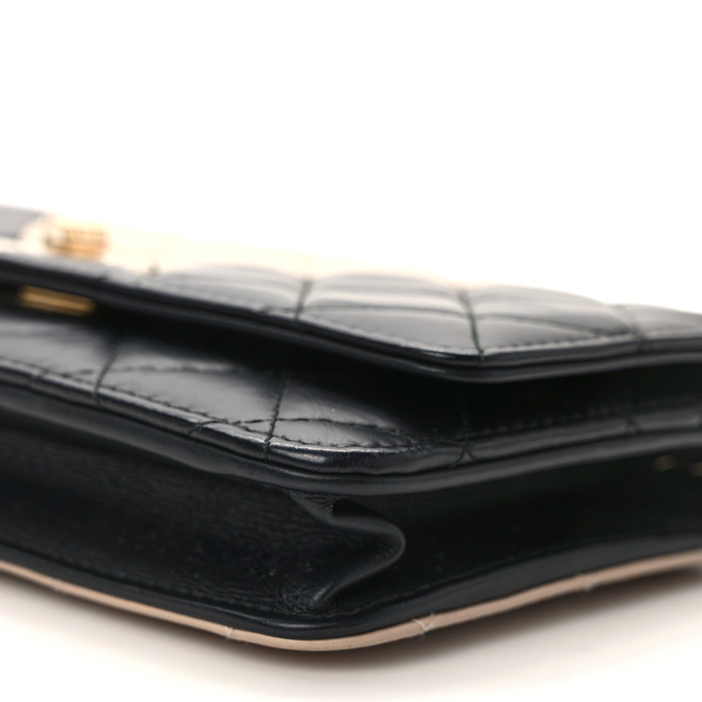 This is an authentic CHANEL Aged Calfskin Quilted Reissue Wallet On Chain WOC in Beige and Black. This stylish cross-body wallet is crafted of luxurious diamond quilted aged calfskin leather in black and beige. The bag features an extra long gold chain link leather threaded shoulder strap and a gold-plated Chanel mademoiselle turn lock. The flap opens to a compact black leather and fabric interior with card slots, patch pockets, and a zipper compartment.Follow this item for alerts. Chanel is a registered trademark of Chanel. FASHIONPHILE is not affiliated with Chanel.
