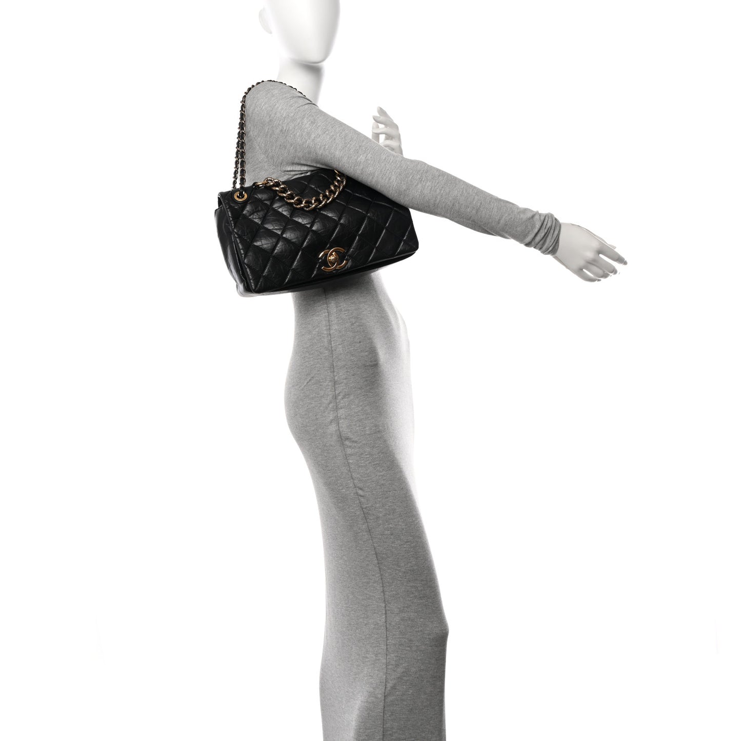 This is an authentic CHANEL Aged Calfskin Quilted Small Pondichery Flap in Black. This stylish tote is crafted of aged calfskin leather with diamond quilting in black. This impressive bag features an aged gold chain link top handle, aged gold leather threaded chain link shoulder straps, and a gold Chanel CC turn lock for the frontal full flap. This opens to a spacious burgundy fabric interior with a zipper pocket.Follow this item for alerts. Chanel is a registered trademark of Chanel. FASHIONPHILE is not affiliated with Chanel.