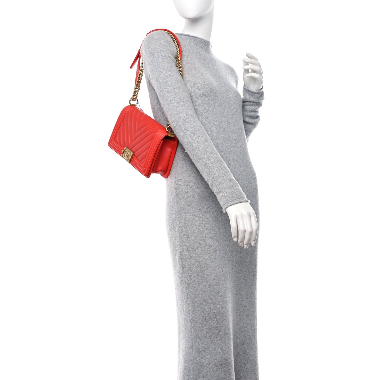 This is an authentic CHANEL Calfskin Chevron Quilted Medium Boy Flap in Red. This chic shoulder bag is crafted of chevron quilted calfskin leather with linear quilted borders. The bag features gold hardware, including a chain link shoulder strap and a Boy push lock at the flap. This opens to a fabric interior with a flat pocket.Follow this item for alerts. Chanel is a registered trademark of Chanel. FASHIONPHILE is not affiliated with Chanel.