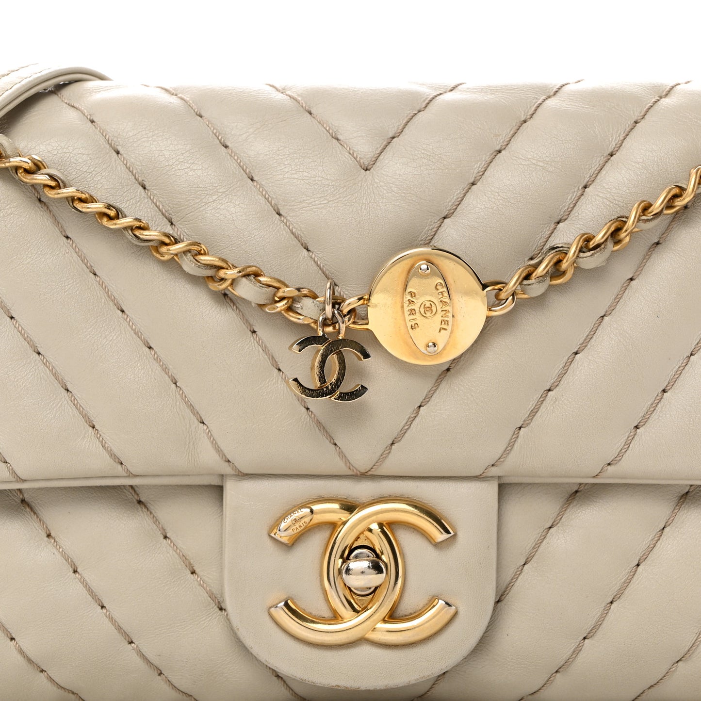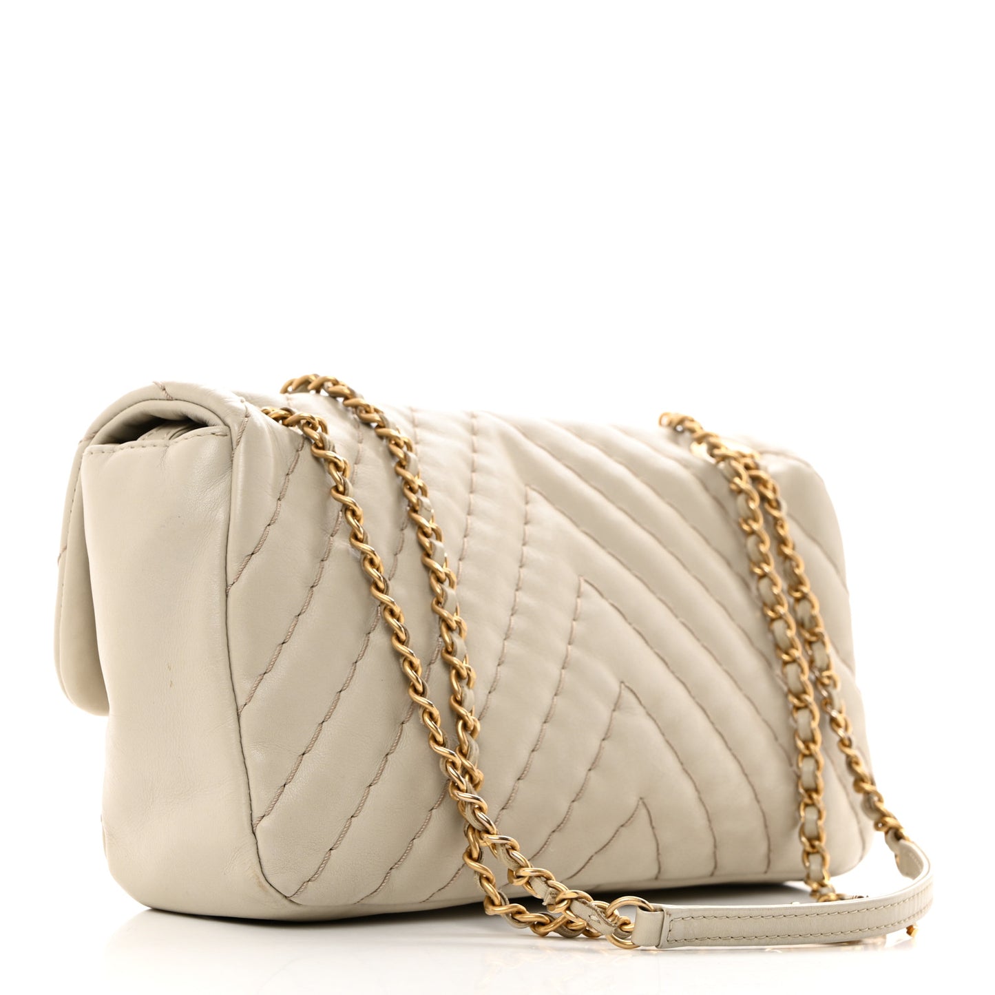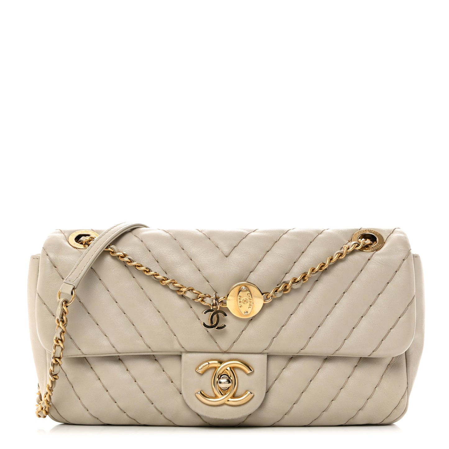 This is an authentic CHANEL Calfskin Chevron Quilted Medium Surpique Flap in Light Grey. This stylish shoulder bag is crafted of chevron quilted calfskin leather in ivory. The bag features a leather threaded gold chain link shoulder strap, and a matching gold classic CC turn lock on the crossover flap. This opens the bag to a gold fabric interior with a zipper pocket.Follow this item for alerts. Chanel is a registered trademark of Chanel. FASHIONPHILE is not affiliated with Chanel.