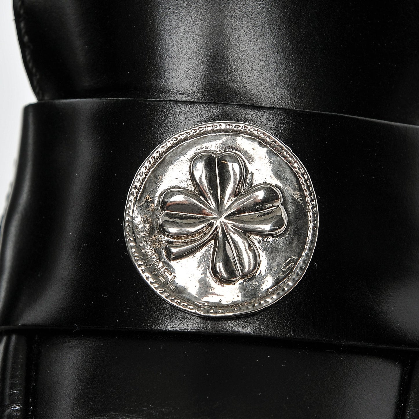 This is an authentic pair of CHANEL Calfskin Clover Loafer Pumps 42 in Black. These stylish shoes are crafted of calfskin leather in black. They feature a silver Chanel clover hardware on the front and a 3 inch stacked heel. The classic style make these shoes a fabulous addition to your wardrobe with the style of Chanel!Follow this item for alerts. Chanel is a registered trademark of Chanel. FASHIONPHILE is not affiliated with Chanel.