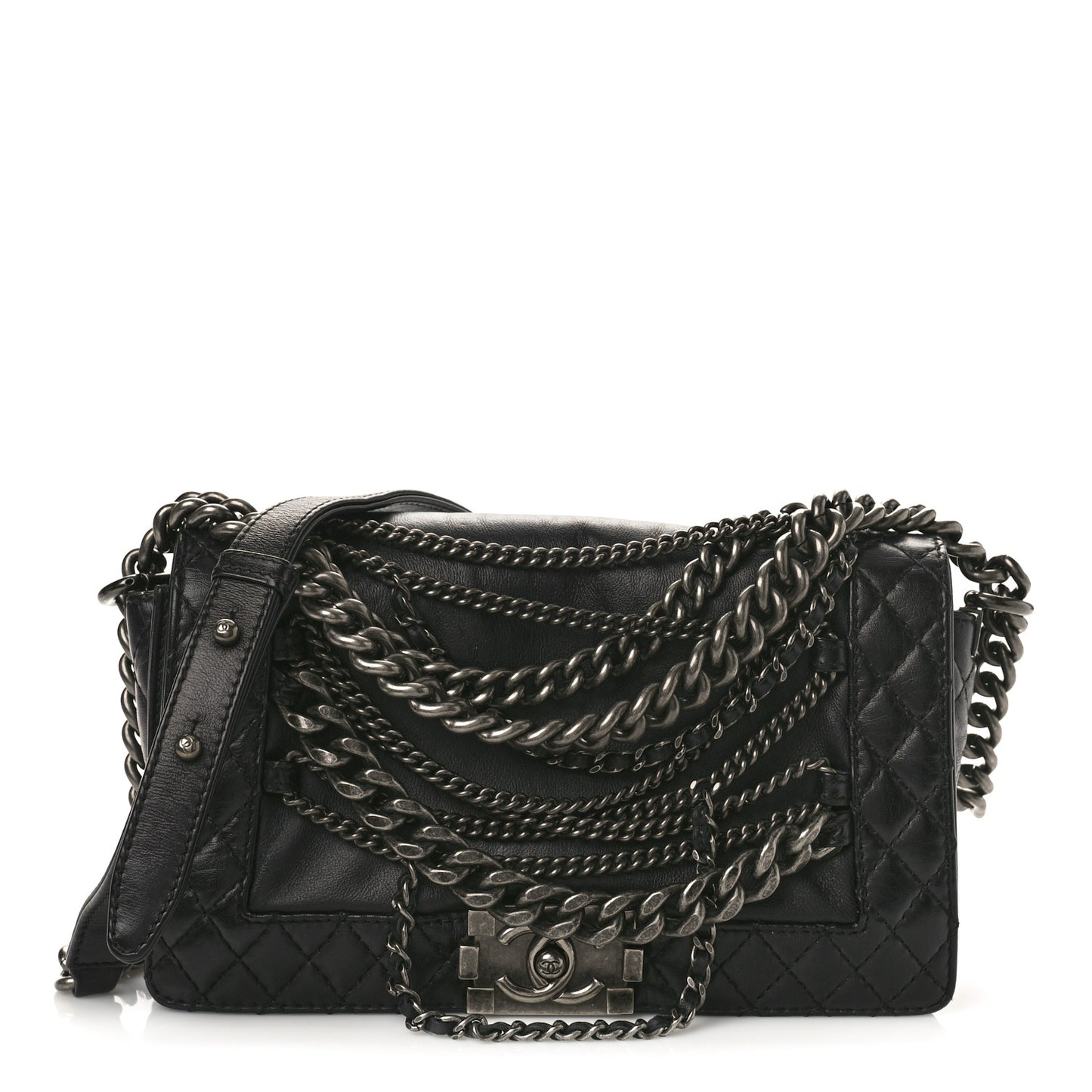 This is an authentic CHANEL Calfskin Enchained Medium Boy Flap in Black. This chic shoulder bag is crafted of smooth calfskin leather in black with diamond-quilted framed flap edges. The unique features of this boldly crafted bag are the several styles of draped ruthenium chains across the front. These complement the long chain and leather shoulder strap that can be worn crossbody. The flap opens with a ruthenium boy CC push lock to a fabric interior with zipper and patch pockets. This is an excellent and stylish shoulder bag with a one of a kind look from Chanel!Follow this item for alerts. Chanel is a registered trademark of Chanel. FASHIONPHILE is not affiliated with Chanel.