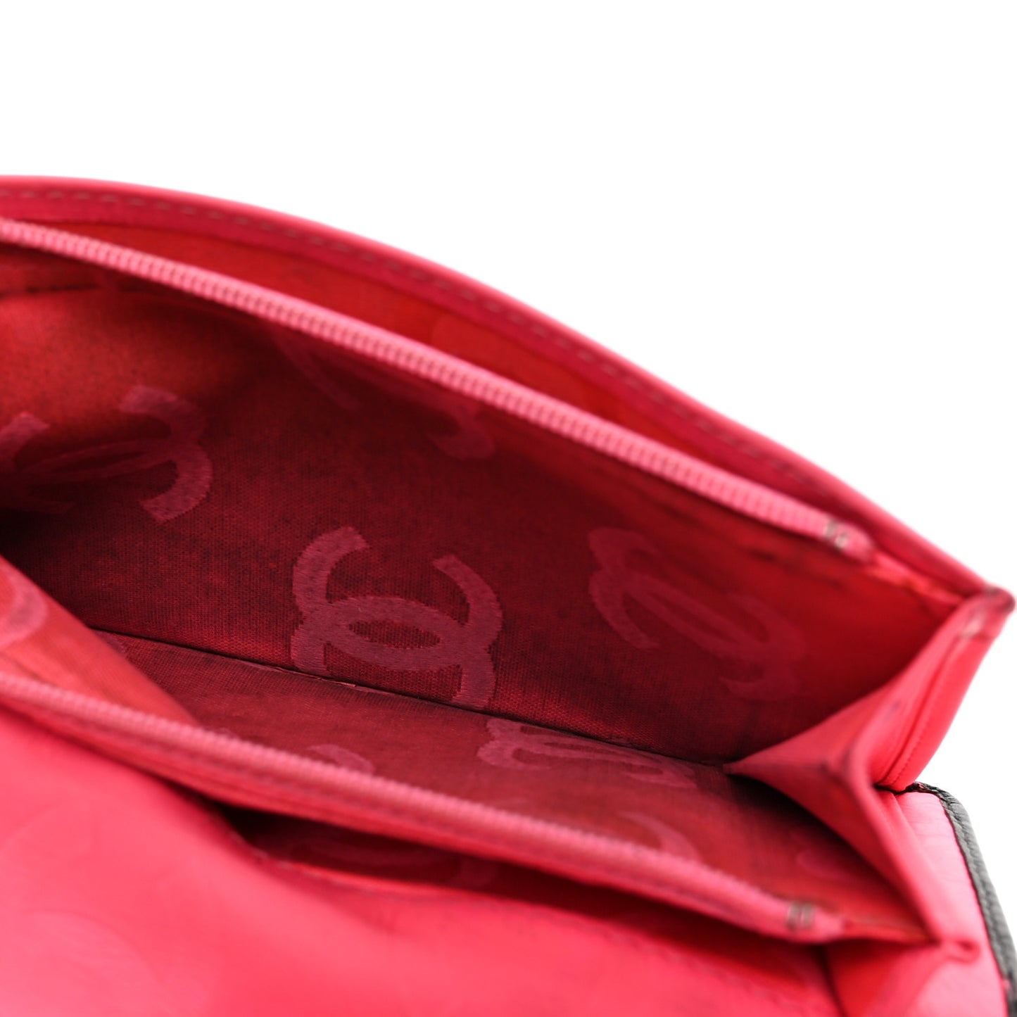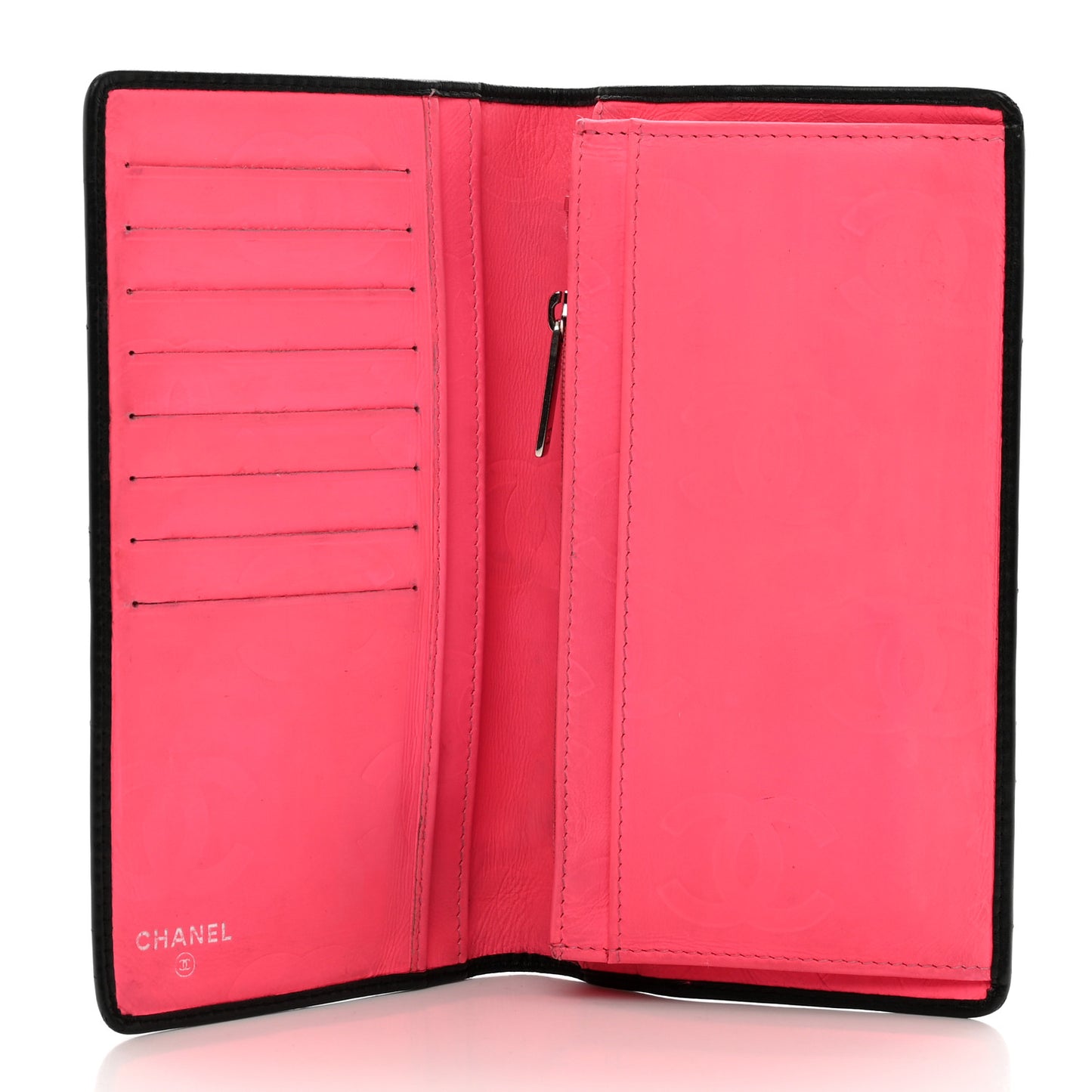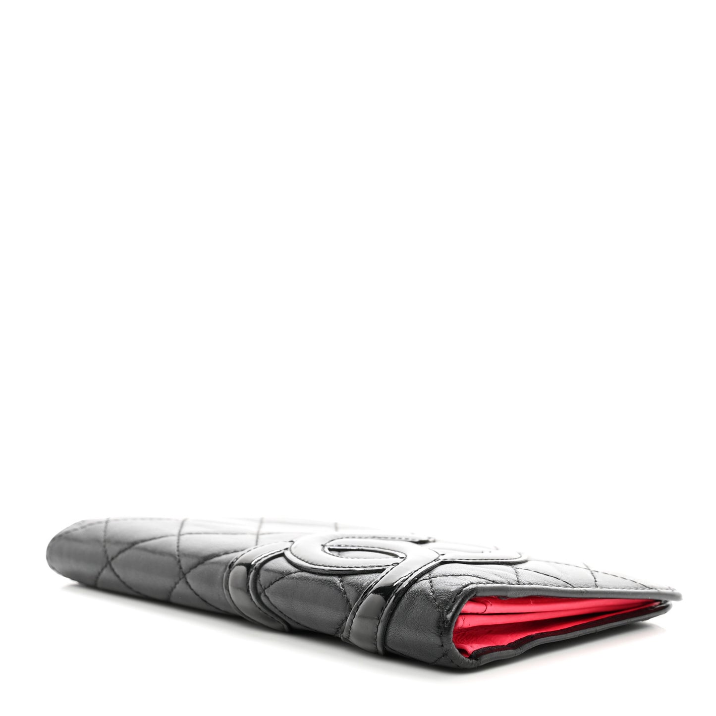 This is an authentic CHANEL Calfskin Quilted Cambon Yen Wallet in Black. This stylish wallet is beautifully crafted of diamond-quilted calfskin leather in black. It features an off-set black patent leather Chanel CC logo patch. The wallet opens to a bright pink Chanel CC logo embossed leather and fabric interior with card slots, patch pockets, and a zipper compartment.Follow this item for alerts. Chanel is a registered trademark of Chanel. FASHIONPHILE is not affiliated with Chanel.