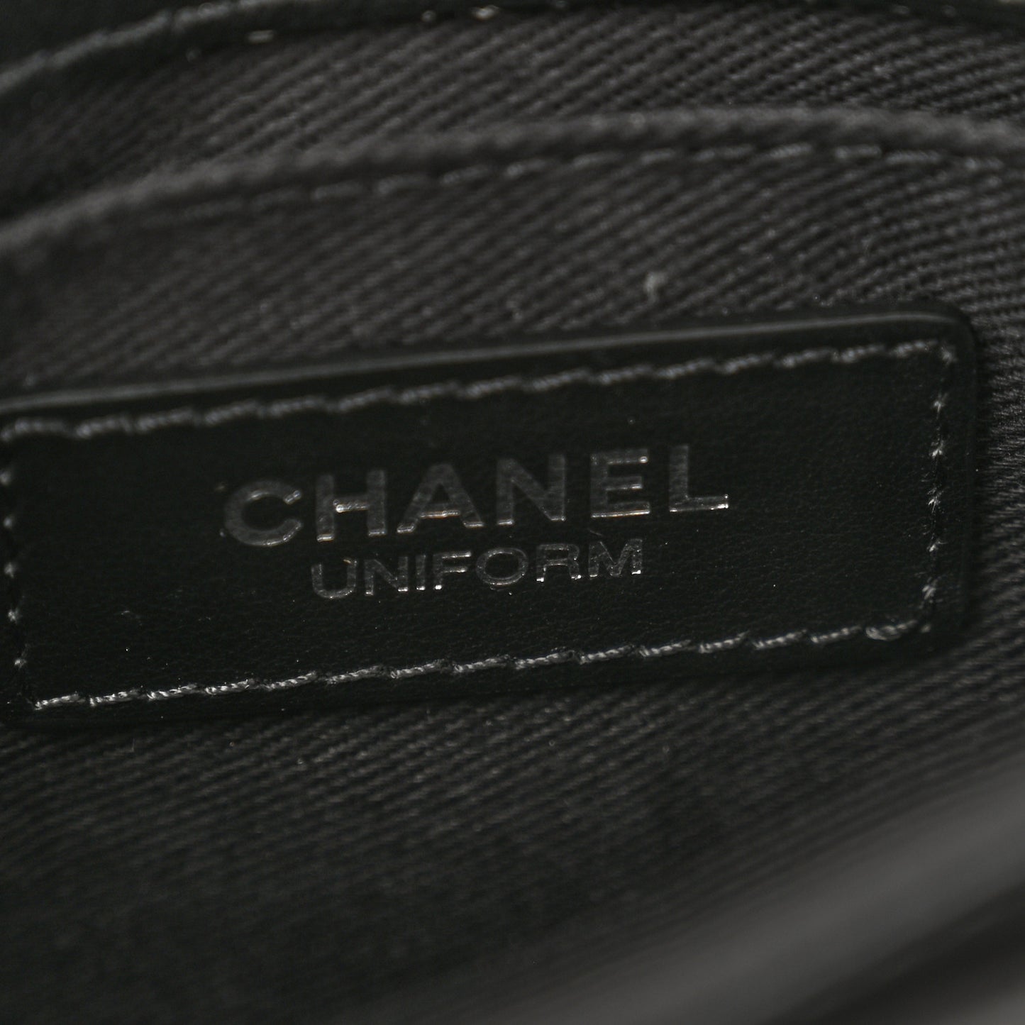 This is an authentic CHANEL Calfskin Quilted CC Uniform Flap Belt Bag in Black. This stylish waist bag is finely crafted of diamond-stitched black calfskin leather. The bag features a leather threaded silver chain belt, a frontal flap, and a silver CC turn lock. This opens to a matching fabric interior with a patch pocket.Follow this item for alerts. Chanel is a registered trademark of Chanel. FASHIONPHILE is not affiliated with Chanel.
