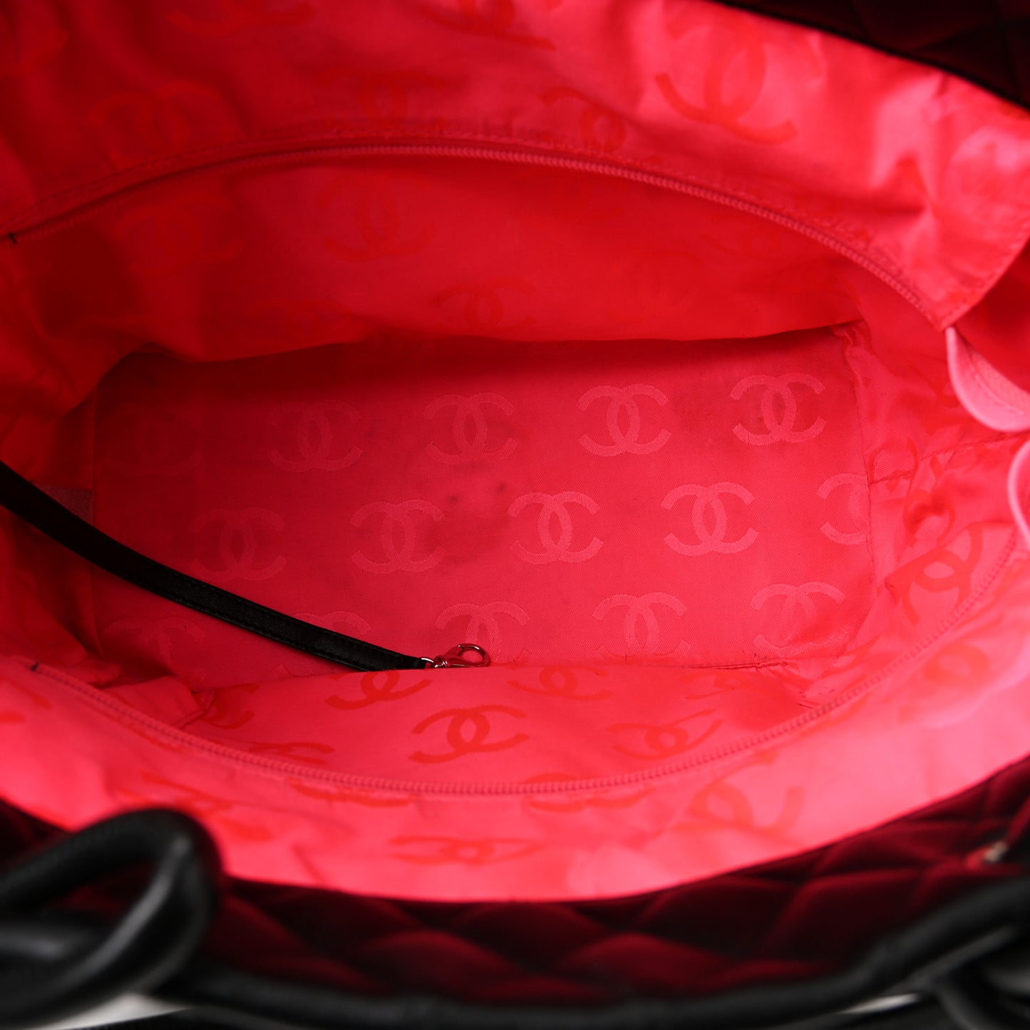 This is an authentic CHANEL Calfskin Quilted Large Cambon Tote in Black and White. This shoulder bag is crafted of diamond quilted calfskin leather in black. The handbag features leather rope top handles that are knotted at the ends and a large offset leather Chanel CC logo patch to one side. The top zipper opens to a bright pink Chanel monogram fabric interior with zipper and patch pockets.Follow this item for alerts. Chanel is a registered trademark of Chanel. FASHIONPHILE is not affiliated with Chanel.