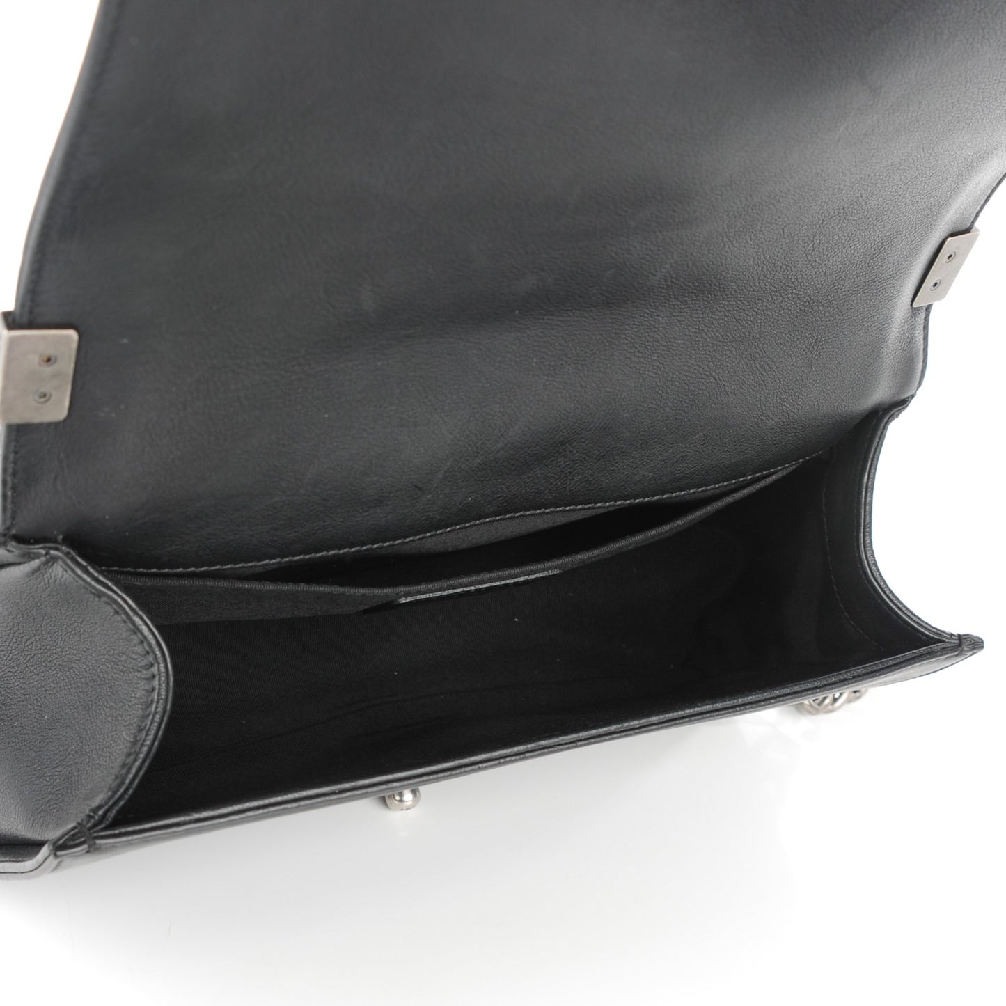 This is an authentic CHANEL Calfskin Quilted Medium Boy Flap Black. This chic shoulder bag is crafted of diamond quilted luxurious calfskin leather in black with a linear quilted border. The bag features a ruthenium chain link shoulder strap with a leather shoulder pad and a ruthenium Boy Chanel CC press lock. This opens the front flap to a fabric interior with a pocket. This is an excellent shoulder bag, ideal for day and evening use, from Chanel!