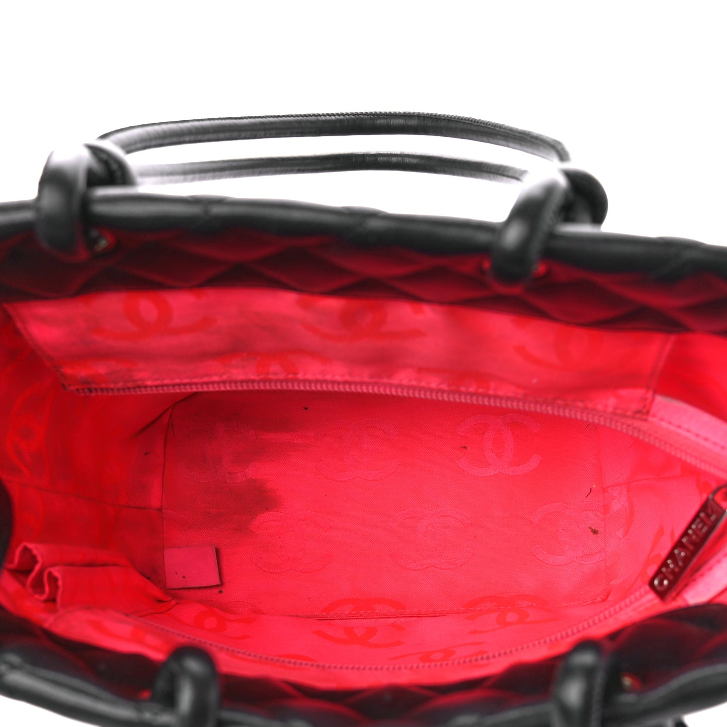 This is an authentic CHANEL Calfskin Quilted Medium Cambon Tote in Black. This stylish shoulder bag is beautifully crafted of soft diamond quilted calfskin leather in black. The handbag features leather rope top handles that are knotted at the ends and a large offset leather Chanel CC logo patch to one side. The top zipper opens to a bright pink Chanel monogram fabric interior with zipper and patch pockets.Follow this item for alerts. Chanel is a registered trademark of Chanel. FASHIONPHILE is not affiliated with Chanel.