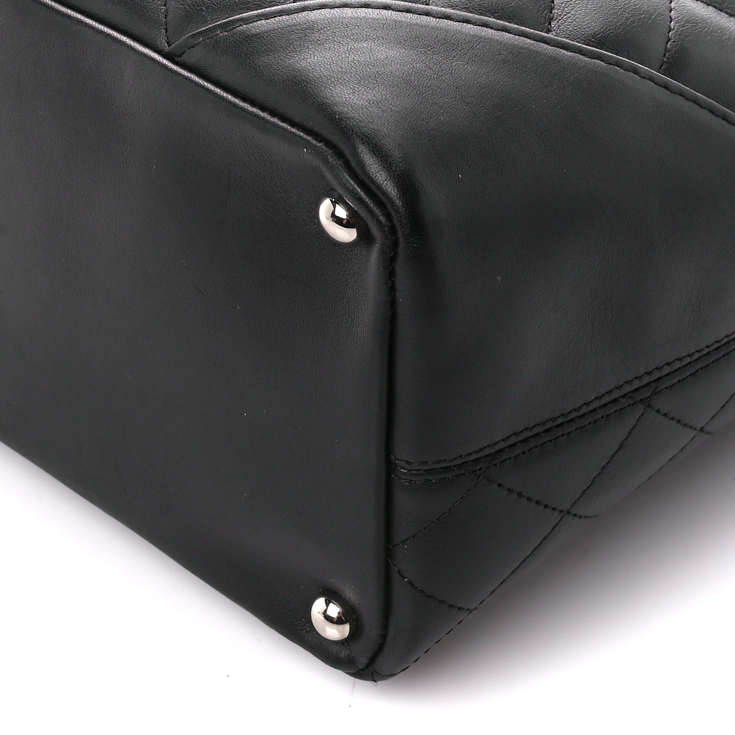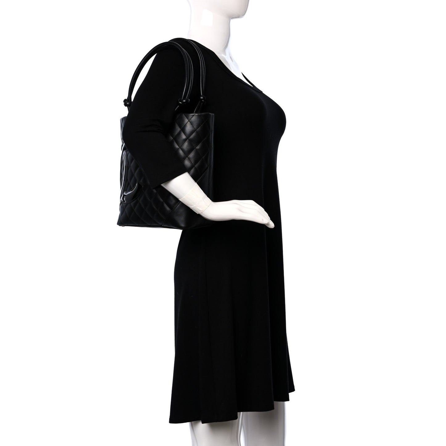 This is an authentic CHANEL Calfskin Quilted Medium Cambon Tote in Black. This stylish shoulder bag is beautifully crafted of soft diamond quilted calfskin leather in black. The handbag features leather rope top handles that are knotted at the ends and a large offset leather Chanel CC logo patch to one side. The top zipper opens to a bright pink Chanel monogram fabric interior with zipper and patch pockets.Follow this item for alerts. Chanel is a registered trademark of Chanel. FASHIONPHILE is not affiliated with Chanel.