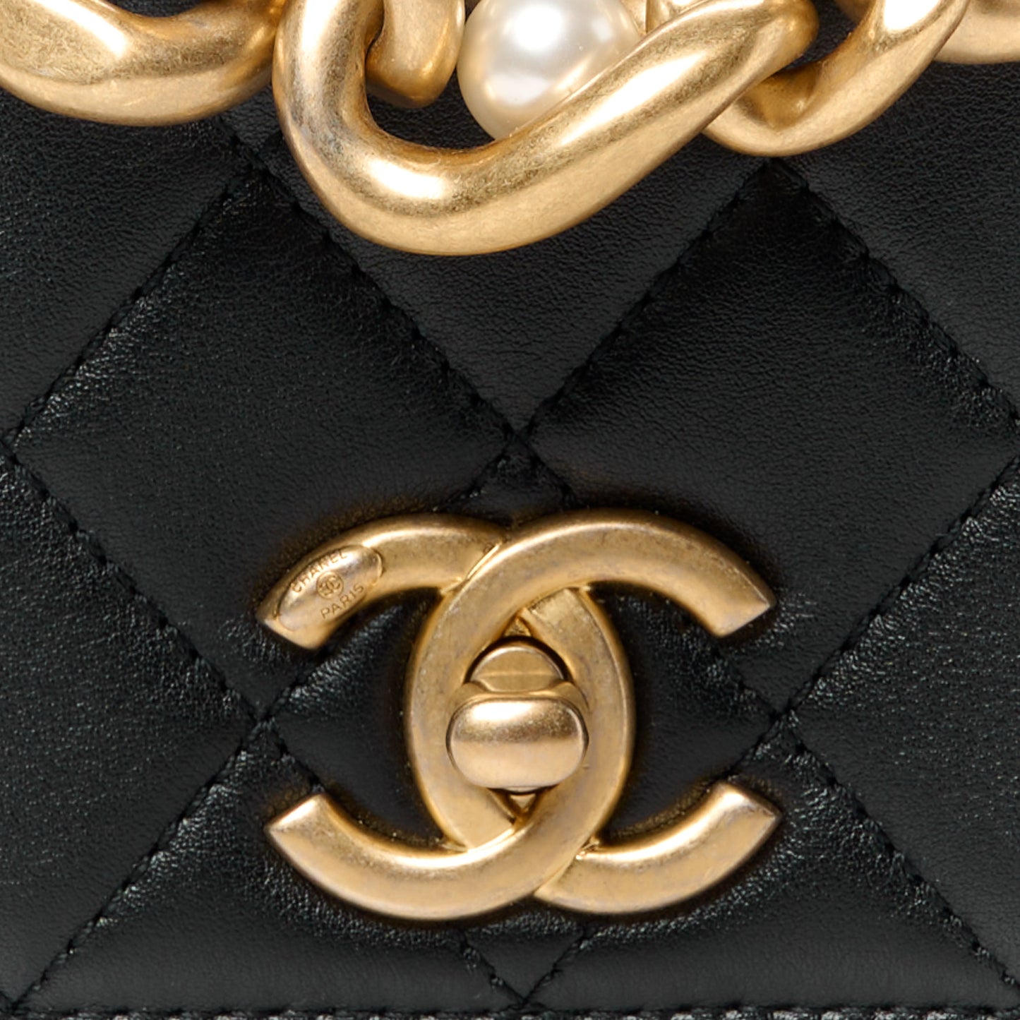 Calfskin Quilted Pearl Jewel Chain Flap Black