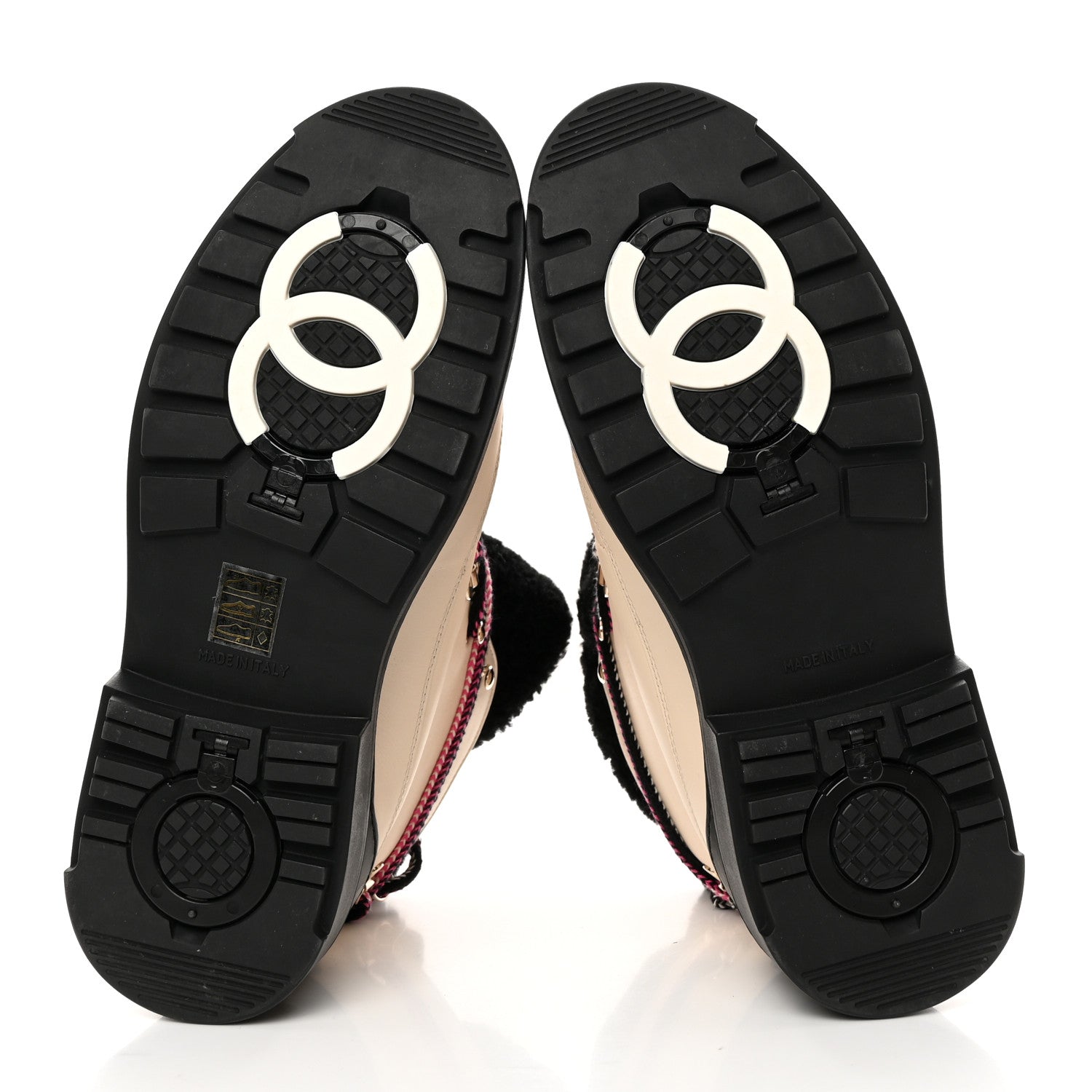 This is an authentic pair of CHANEL Calfskin Shearling CC Lace Up Boots size 39 in Black and White. These lace-up boots are crafted of calfskin leather in ivory, a black rubber heel, wool uppers and a 1-inch rubberized sole with multicolor laces.Follow this item for alerts. Chanel is a registered trademark of Chanel. FASHIONPHILE is not affiliated with Chanel.