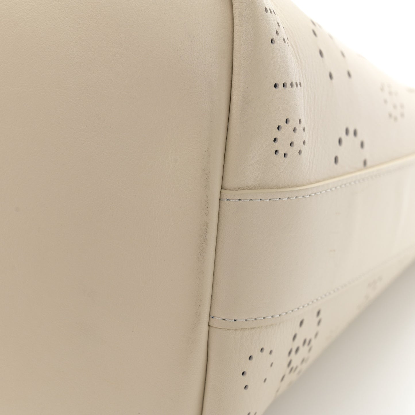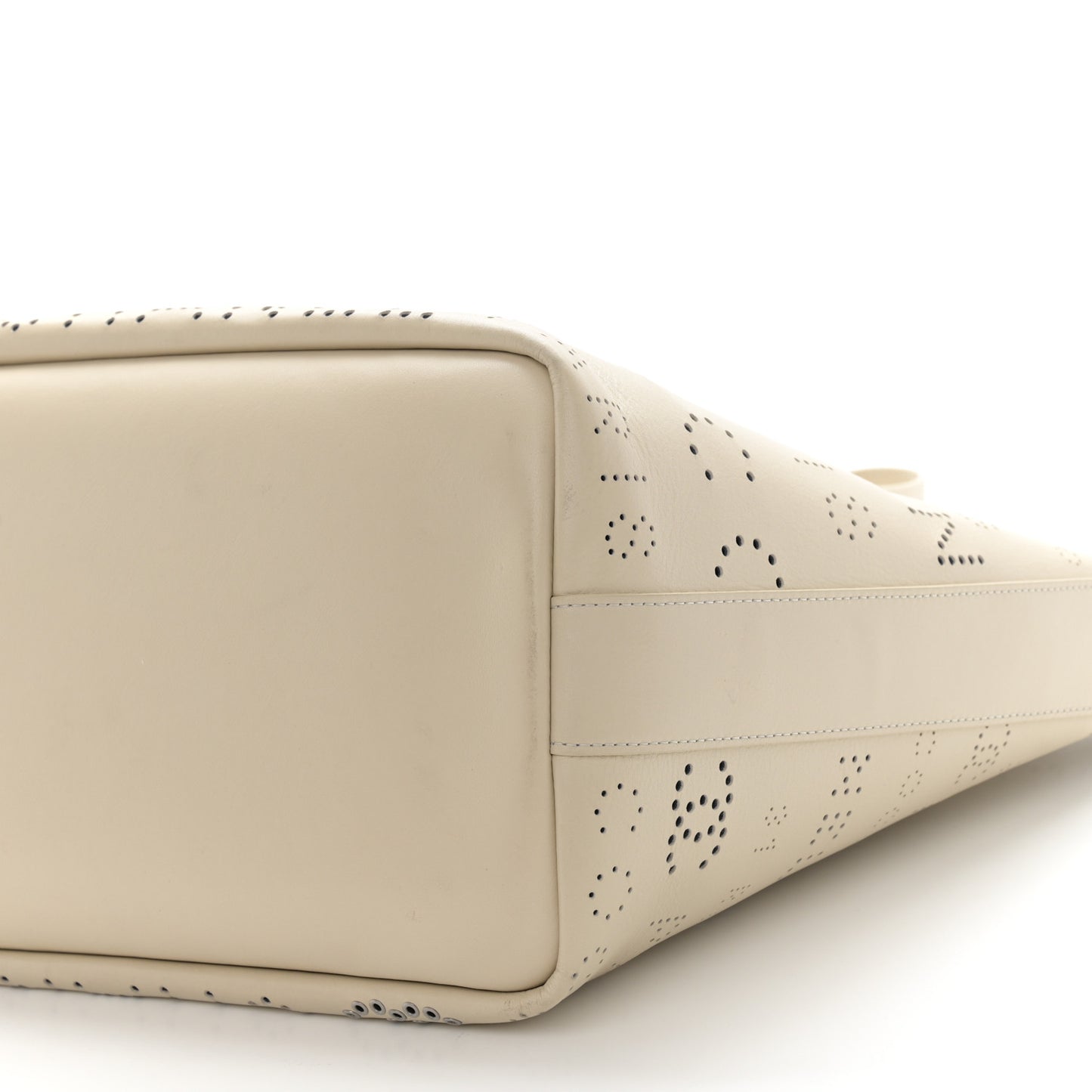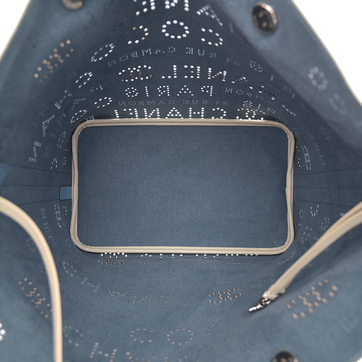 This an authentic CHANEL Calfskin Tweed Small Logo Eyelets Shopping Tote in Beige. This tote is crafted of calfskin leather in off-white. The bag features perforated Chanel logos, leather strap top handles, silver chain-link shoulder straps with leather shoulder pads, and a silver Chanel CC turn-lock. The top is open to a capri blue microfiber interior with three straps with silver clasps at the end and a removable tweed zipper pouch.Follow this item for alerts. Chanel is a registered trademark of Chanel. FASHIONPHILE is not affiliated with Chanel.