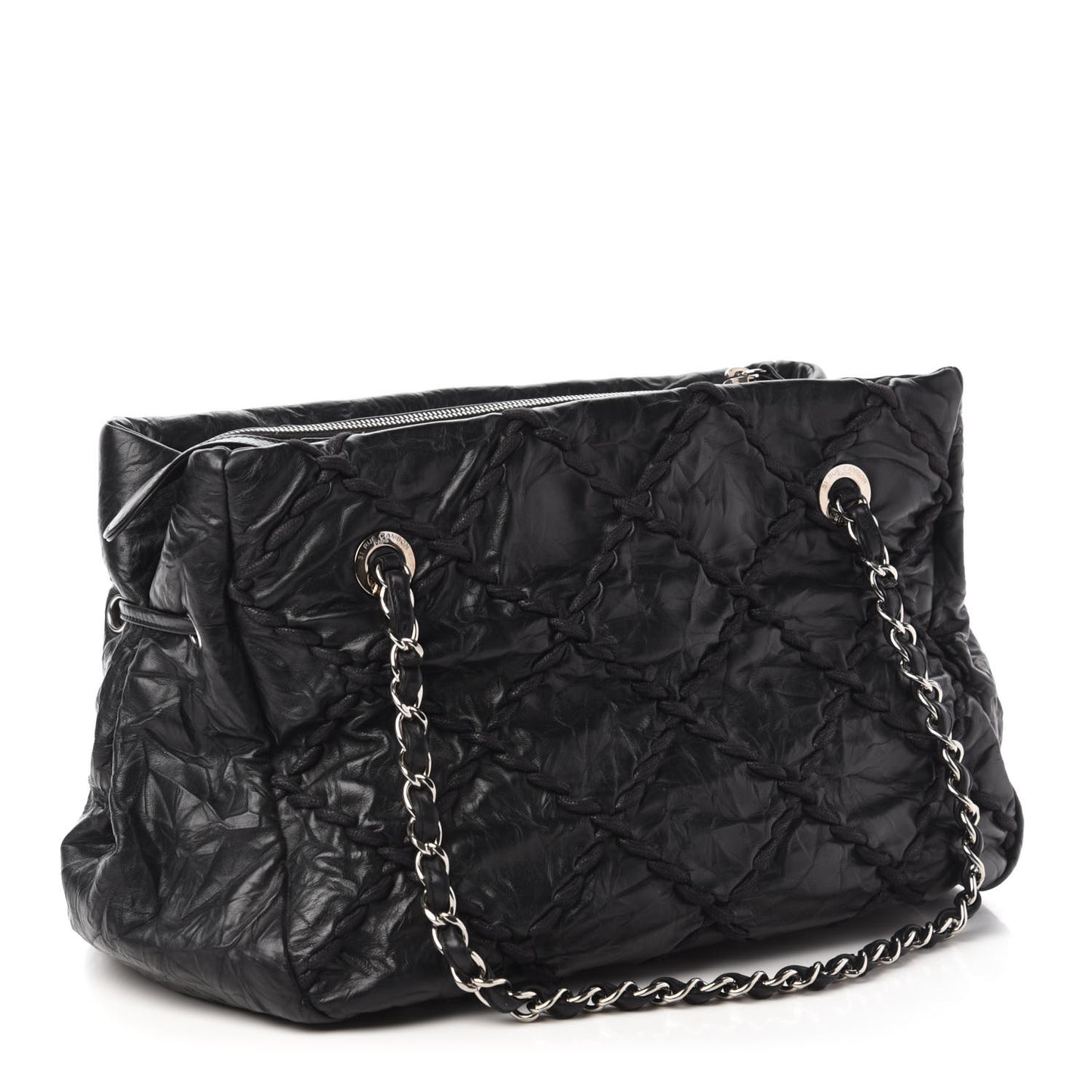 This is an authentic CHANEL Calfskin Ultra Stitch Tote in Black. This stylish shoulder bag has diamond-stitched woven piping quilting on calfskin leather in black. The bag features polished silver chain shoulder straps threaded with black leather and a front polished silver Chanel CC logo. The top opens with a silver zipper to a gray fabric interior with zipper and patch pockets.Follow this item for alerts. Chanel is a registered trademark of Chanel. FASHIONPHILE is not affiliated with Chanel.