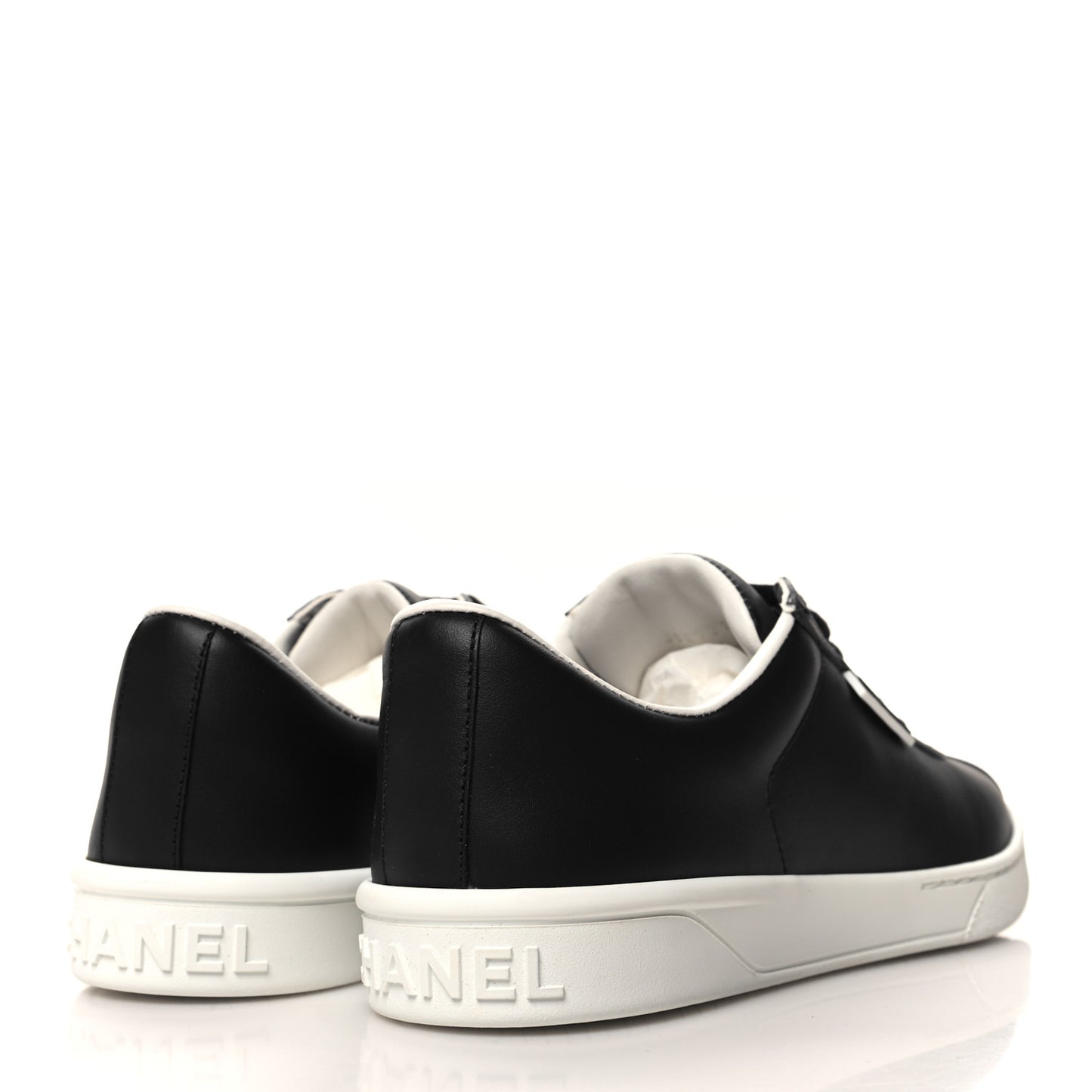 This is an authentic pair of CHANEL Calfskin Womens Sneakers 38 in Black. These stylish sneakers are crafted of calfskin leather in black. They feature a white leather tab with a black CC logo, and white rubber soles.Follow this item for alerts. Chanel is a registered trademark of Chanel. FASHIONPHILE is not affiliated with Chanel.