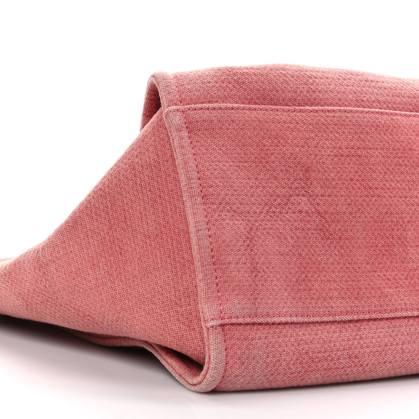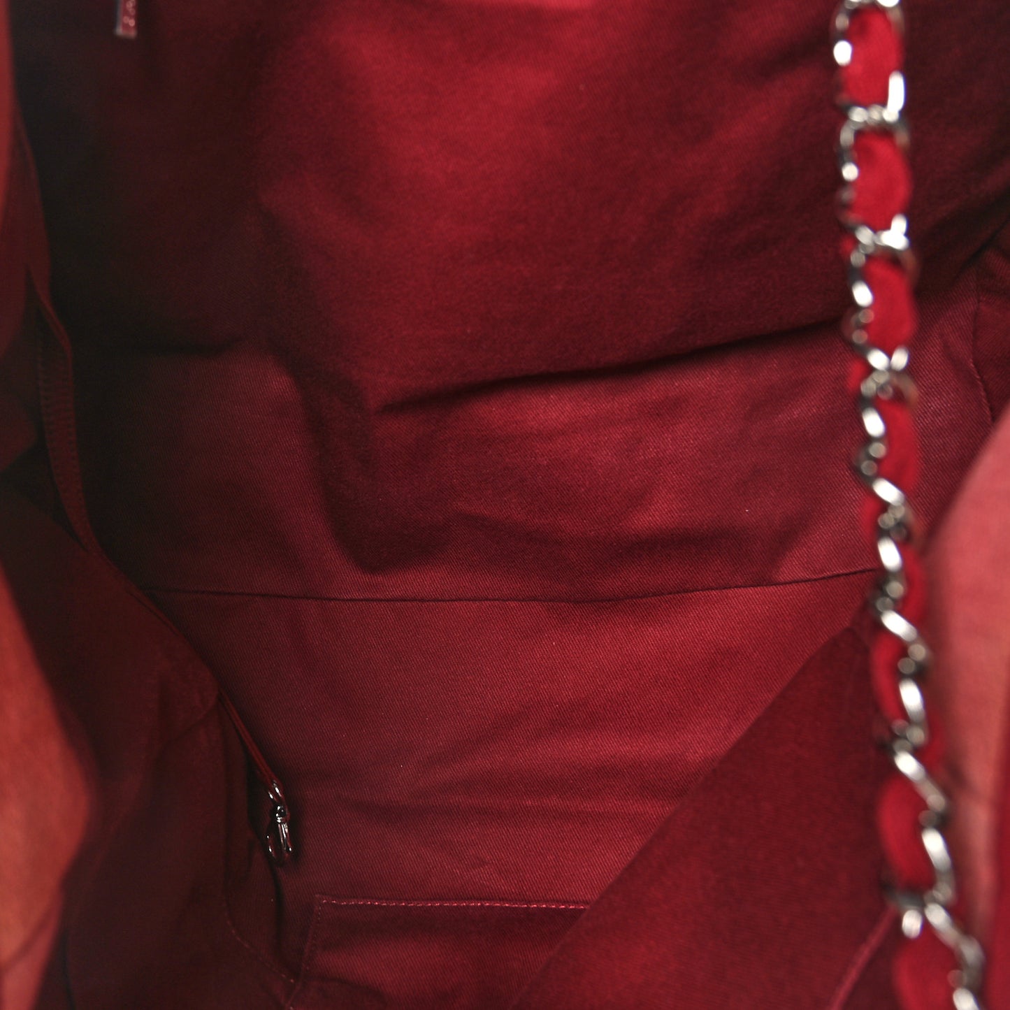 This is an authentic CHANEL Canvas Medium Deauville Tote in Red. This stylish tote is crafted of fine canvas with a white advertisement logo. It features flat leather top handles and fabric-threaded silver shoulder chains. The top is open to a red fabric interior with zipper and patch pockets.