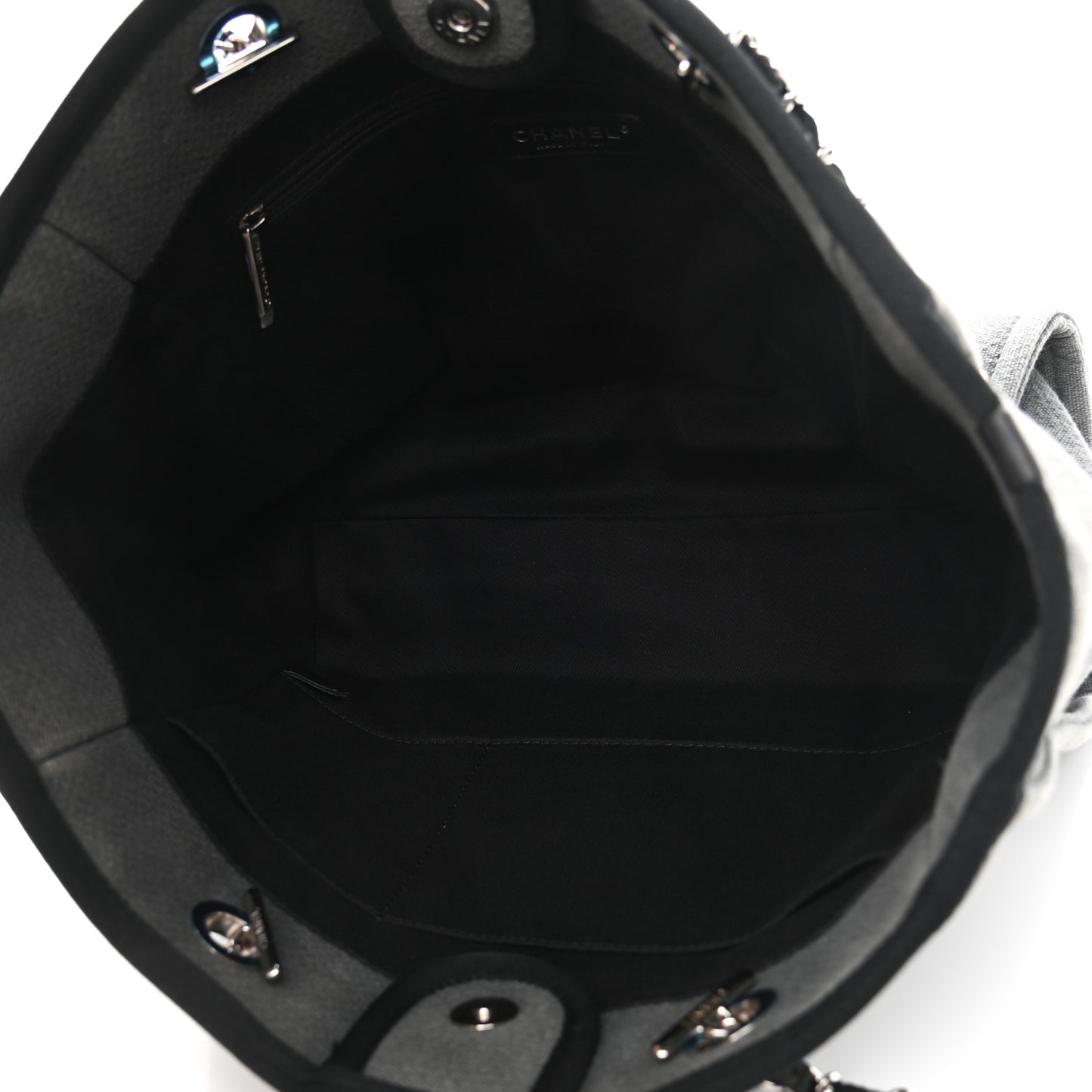 This is an authentic CHANEL Canvas Small Deauville Tote in Grey. This tote is crafted of gray canvas, with a white Chanel advertisement logo printed on the front. The bag features black silver chain-link fabric threaded straps with leather shoulder pads. The wide top is open to a black fabric interior with zipper and patch pockets.Follow this item for alerts. Chanel is a registered trademark of Chanel. FASHIONPHILE is not affiliated with Chanel.