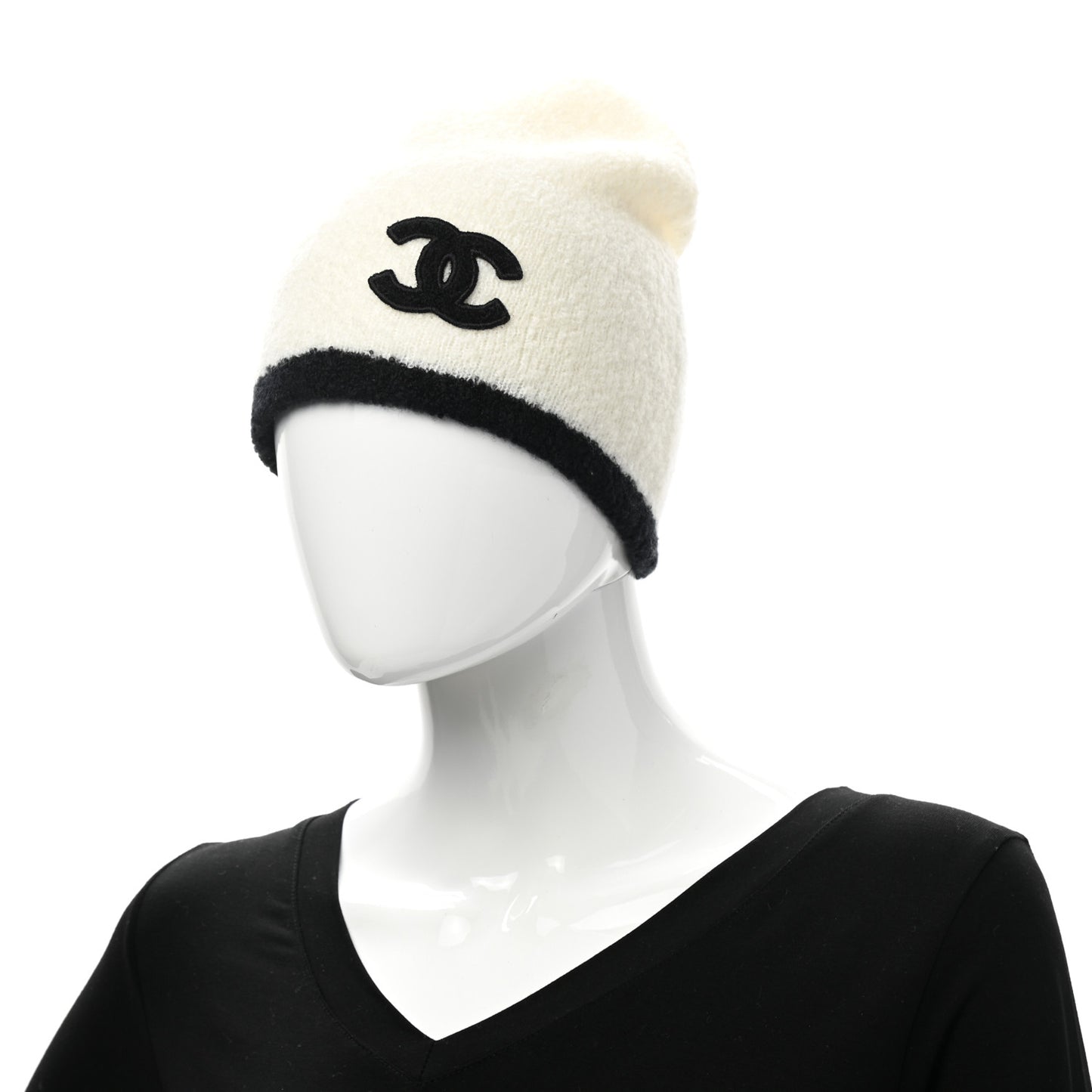 This is an authentic CHANEL Cashmere Silk CC Beanie Hat in White and Black. The beanie is crafted of cashmere and silk in white and features a black CHANEL logo and trim.Follow this item for alerts. Chanel is a registered trademark of Chanel. FASHIONPHILE is not affiliated with Chanel.