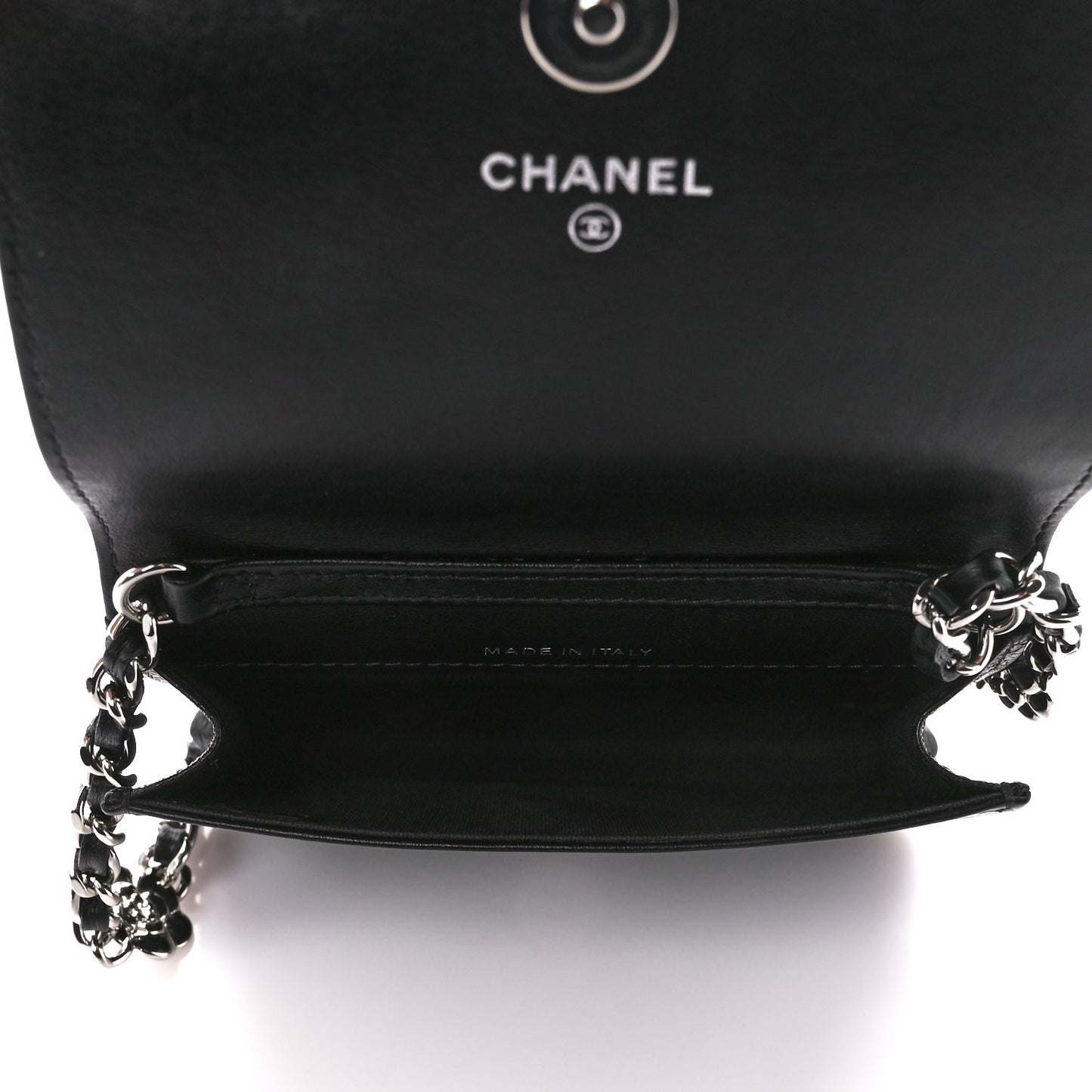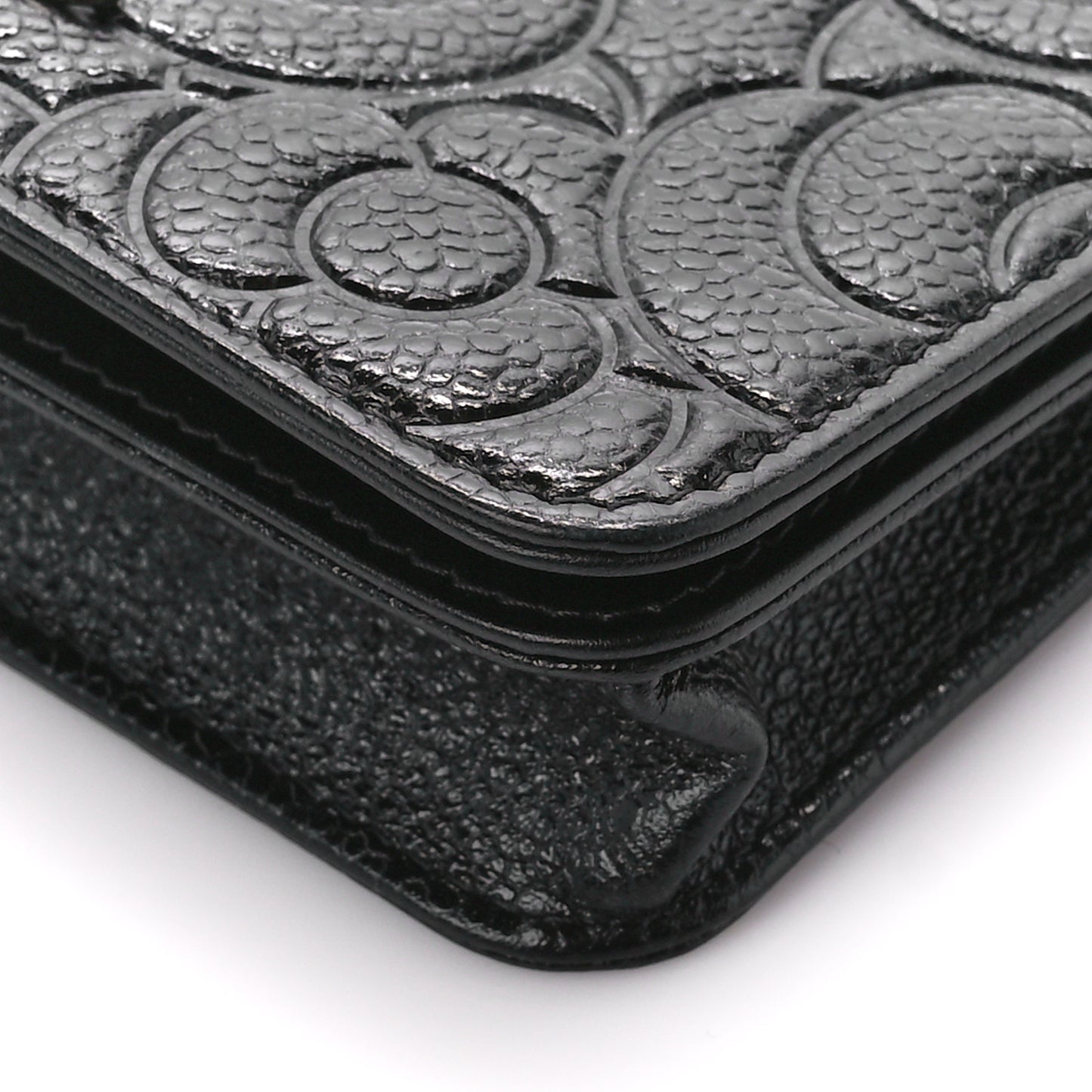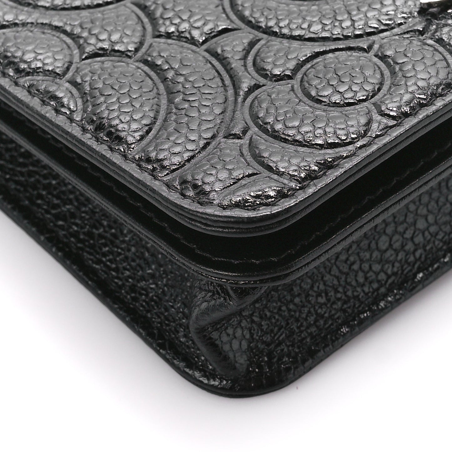 This is an authentic CHANEL Caviar Camellia Embossed Chain Belt Bag in Black. This stylish belt bag is finely crafted camellia embossed caviar leather in black. The wallet features a polished silver chain link strap threaded with leather and a frontal silver CC logo with a camellia flower. The flap opens with a magnet to a black interior.Follow this item for alerts. Chanel is a registered trademark of Chanel. FASHIONPHILE is not affiliated with Chanel.